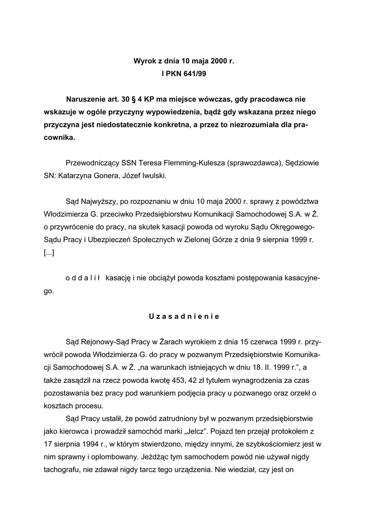 Wyrok z dnia 10 maja 2000 r. I PKN 641/99 Naruszenie art. 30 § 4