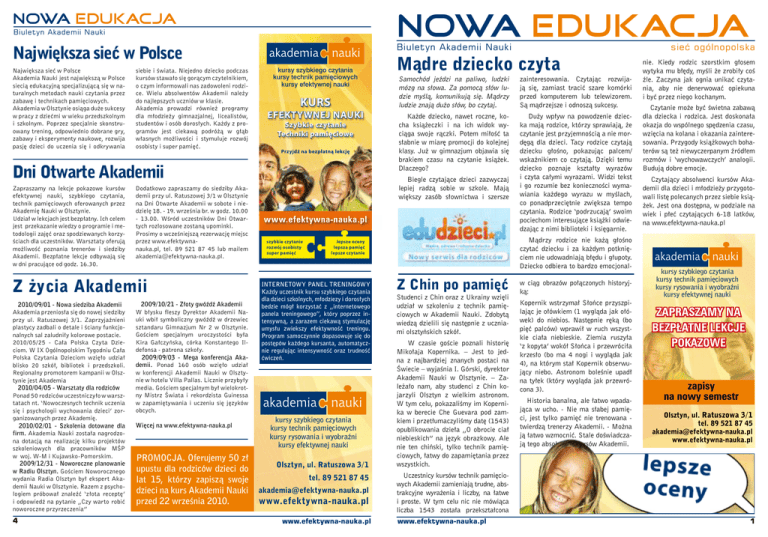 Nowa edukacja Nowa edukacja Biuletyn Akademii Nauki Największa sieć w Polsce Największa sieć w Polsce Akademia Nauki jest największą w Polsce siecią edukacyjną specjalizującą się w naturalnych metodach nauki czytania przez zabawę i technikach pamięciowych. Akademia w Olsztynie osiąga duże sukcesy w pracy z dziećmi w wieku przedszkolnym i szkolnym. Poprzez specjalnie skonstruowany trening, odpowiednio dobrane gry, zabawy i eksperymenty naukowe, rozwija pasję dzieci do uczenia się i odkrywania siebie i świata. Niejedno dziecko podczas kursów stawało się gorącym czytelnikiem, o czym informowali nas zadowoleni rodzice. Wielu absolwentów Akademii należy do najlepszych uczniów w klasie. Akademia prowadzi również programy dla młodzieży gimnazjalnej, licealistów, studentów i osób dorosłych. Każdy z programów jest ciekawą podróżą w głąb własnych możliwości i stymuluje rozwój osobisty i super pamięć. Biuletyn Akademii Nauki kursy szybkiego czytania kursy technik pamięciowych kursy efektywnej nauki KURS EFEKTYWNEJ NAUKI Szybkie czytanie Techniki pamięciowe Przyjdź na bezpłatną lekcję Dni Otwarte Akademii Zapraszamy na lekcje pokazowe kursów efektywnej nauki, szybkiego czytania, technik pamięciowych oferowanych przez Akademię Nauki w Olsztynie. Udział w lekcjach jest bezpłatny. Ich celem jest przekazanie wiedzy o programie i metodologii zajęć oraz spodziewanych korzyściach dla uczestników. Warsztaty oferują możliwość poznania trenerów i siedziby Akademii. Bezpłatne lekcje odbywają się w dni pracujące od godz. 16.30. Dodatkowo zapraszamy do siedziby Akademii przy ul. Ratuszowej 3/1 w Olsztynie na Dni Otwarte Akademii w sobote i niedzielę 18. - 19. września br. w godz. 10.00 - 13.00. Wśród uczestników Dni Otwartych rozlosowane zostaną upominki. Prosimy o wcześniejszą rezerwację miejsc przez www.efektywnanauka.pl, tel. 89 521 87 45 lub mailem [email protected]. Z życia Akademii 2010/09/01 - Nowa siedziba Akademii Akademia przeniosła się do nowej siedziby przy ul. Ratuszowej 3/1. Zaprzyjaźnieni plastycy zadbali o detale i ściany funkcjonalnych sal zaludniły kolorowe postacie. 2010/05/25 - Cała Polska Czyta Dzieciom. W IX Ogólnopolskim Tygodniu Cała Polska Czytania Dzieciom wzięło udział blisko 20 szkół, bibliotek i przedszkoli. Regionalny promotorem kampanii w Olsztynie jest Akademia 2010/04/05 - Warsztaty dla rodziców Ponad 50 rodziców uczestniczyło w warsztatach nt. ‘Nowoczesnych technik uczenia się i psychologii wychowania dzieci’ zorganizowanych przez Akademię. 2010/02/01 - Szkolenia dotowane dla firm. Akademia Nauki została nagrodzona dotacją na realizację kilku projektów szkoleniowych dla pracowników MŚP w woj. W-M i Kujawsko-Pomorskim. 2009/12/31 - Noworoczne planowanie w Radiu Olsztyn. Gościem Noworocznego wydania Radia Olsztyn był ekspert Akademii Nauki w Olsztynie. Razem z psychologiem próbował znaleźć ‘złota receptę’ i odpowiedź na pytanie „Czy warto robić noworoczne przyrzeczenia” 4 2009/10/21 - Złoty gwóźdź Akademii W błysku fleszy Dyrektor Akademii Nauki wbił symboliczny gwóźdź w drzewiec sztandaru Gimnazjum Nr 2 w Olsztynie. Gościem specjalnym uroczystości była Kira Gałczyńska, córka Konstantego Ildefonsa - patrona szkoły. 2009/09/03 - Mega konferencja Akademii. Ponad 160 osób wzięło udział w konferencji Akademii Nauki w Olsztynie w hotelu Villa Pallas. Licznie przybyły media. Gościem specjalnym był wielokrotny Mistrz Świata i rekordzista Guinessa w zapamiętywania i uczeniu się języków obcych. Więcej na www.efektywna-nauka.pl PROMOCJA. Oferujemy 50 zł upustu dla rodziców dzieci do lat 15, którzy zapiszą swoje dzieci na kurs Akademii Nauki przed 22 września 2010. Mądre dziecko czyta Samochód jeździ na paliwo, ludzki mózg na słowa. Za pomocą słów ludzie myślą, komunikują się. Mądrzy ludzie znają dużo słów, bo czytaj. zainteresowania. Czytając rozwijają się, zamiast tracić szare komórki przed komputerem lub telewizorem. Są mądrzejsze i odnoszą sukcesy. Każde dziecko, nawet roczne, kocha książeczki i na ich widok wyciąga swoje rączki. Potem miłość ta słabnie w miarę promocji do kolejnej klasy. Już w gimnazjum objawia się brakiem czasu na czytanie książek. Dlaczego? Duży wpływ na powodzenie dziecka mają rodzice, którzy sprawiają, że czytanie jest przyjemnością a nie mordęgą dla dzieci. Tacy rodzice czytają dziecku głośno, pokazując palcem/ wskaźnikiem co czytają. Dzięki temu dziecko poznaje kształty wyrazów i czyta całymi wyrazami. Widzi tekst i go rozumie bez konieczności wymawiania każdego wyrazu w myślach, co ponadprzeciętnie zwiększa tempo czytania. Rodzice ‘podrzucają’ swoim pociechom interesujące książki odwiedzając z nimi biblioteki i księgarnie. Biegle czytające dzieci zazwyczaj lepiej radzą sobie w szkole. Mają większy zasób słownictwa i szersze www.efektywna-nauka.pl szybkie czytanie rozwój osobisty super pamięć Mądrzy rodzice nie każą głośno czytać dziecku i za każdym potknięciem nie udowadniają błędu i głupoty. Dziecko odbiera to bardzo emocjonal- lepsze oceny lepsza pamięć lepsze czytanie INTERNETOWY PANEL TRENINGOWY Każdy uczestnik kursu szybkiego czytania dla dzieci szkolnych, młodziezy i dorosłych bedzie mógł korzystać z „internetowego panela treningowego”, który poprzez intensywną, a zarazem ciekawą stymulację umysłu zwiekszy efektywność treningu. Program samoczynnie dopasowuje się do postępów każdego kursanta, automatycznie regulując intensywność oraz trudność ćwiczeń. kursy szybkiego czytania kursy technik pamięciowych kursy rysowania i wyobraźni kursy efektywnej nauki Olsztyn, ul. Ratuszowa 3/1 tel. 89 521 87 45 [email protected] www.efektywna-nauka.pl www.efektywna-nauka.pl Z Chin po pamięć Studenci z Chin oraz z Ukrainy wzięli udział w szkoleniu z technik pamięciowych w Akademii Nauk