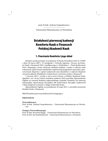 Wdrażanie budżetu zadaniowego w jednostkach 155 prof. dr hab. Andrzej Gospodarowicz Uniwersytet Ekonomiczny we Wrocławiu Działalność pierwszej kadencji Komitetu Nauk o Finansach Polskiej Akademii Nauk 1. Powstanie Komitetu i jego skład Komitet został powołany na podstawie Uchwały Prezydium PAN nr 5/2007 z dnia 20 marca 2007 r. W paragrafie 1 Uchwały zapisano: „Tworzy się Komitet Nauk o Finansach PAN, współpracujący z Wydziałem I – Nauk Społecznych PAN, obejmujący swoim zakresem działania badania i studia w zakresie nauk o finansach, opracowanie standardów i opiniowanie programów nauczania, opracowywanie ekspertyz i opinii naukowych oraz doradztwo w zakresie finansów oraz prowadzenie działalności wydawniczej i szerzenie wiedzy o finansach”. 1 stycznia 2011 r. weszła w życie nowa Ustawa o Polskiej Akademii Nauk. Zgodnie z art. 46 tej Ustawy, komitety naukowe PAN powołuje Zgromadzenie Ogólne na wniosek dziekana odpowiedniego wydziału. Komitety zaś stanowią samorządną reprezentację dyscypliny lub pokrewnych dyscyplin naukowych i służą integracji uczonych z całego środowiska kraju. Zgromadzenie Ogólne na posiedzeniu 26 maja 2011 r. powołało ponownie Komitet Nauk o Finansach. Skład Komitetu pierwszej kadencji był następujący: PREZYDIUM Przewodniczący: Prof. dr hab. Andrzej Gospodarowicz – Uniwersytet Ekonomiczny we Wrocławiu Zastępcy Przewodniczącego: Prof. dr hab. Krzysztof Jajuga – Uniwersytet Ekonomiczny we Wrocławiu Prof. dr hab. Jan Szambelańczyk – Uniwersytet Ekonomiczny w Poznaniu 156 prof. dr hab. Andrzej Gospodarowicz Sekretarz: Prof. dr hab. Leszek Dziawgo – Uniwersytet Mikołaja Kopernika w Toruniu Członkowie Prezydium: Prof. dr hab. Jan Czekaj – Uniwersytet Ekonomiczny w Krakowie Prof. dr hab. Jerzy Nowakowski – Szkoła Główna Handlowa w Warszawie Prof. dr hab. Jerzy Węcławski – Uniwersytet Marii Curie-Skłodowskiej w Lublinie Prof. dr hab. Małgorzata Zaleska – Szkoła Główna Handlowa w Warszawie Pozostali Członkowie Komitetu: Prof. dr hab. Wiesław Dębski – Uniwersytet Łódzki Dr hab. Zbigniew Dresler, prof. UE – Uniwersytet Ekonomiczny w Krakowie Prof. dr hab. Teresa Famulska – Uniwersytet Ekonomiczny w Katowicach Prof. dr hab. Stanisław Flejterski – Uniwersytet Szczeciński Prof. dr hab. Alfred Janc – Uniwersytet Ekonomiczny w Poznaniu Prof. dr hab. Stanisław Kasiewicz – Szkoła Główna Handlowa w Warszawie Prof. dr hab. Andrzej Kaźmierczak – Szkoła Główna Handlowa w Warszawie Krzysztof Markowski – Biuro Informacji Kredytowej Mateusz Morawiecki – Bank Zachodni WBK SA Prof. dr hab. Stanisław Owsiak – Uniwersytet Ekonomiczny w Krakowie Krzysztof Pietraszkiewicz – Związek Banków Polskich Jerzy Pietrewicz - Bank Ochrony Środowiska SA Prof. dr hab. Bogusław Pietrzak – Szkoła Główna Handlowa w Warszawie Prof. dr hab. Krystyna Piotrowska-Marczak – Uniwersytet Łódzki Prof. dr hab. Wanda Ronka-Chmielowiec – Uniwersytet Ekonomiczny we Wrocławiu Prof. dr hab. Maria Sierpińska – Uniwersytet Ekonomiczny w Krakowie Prof. dr hab. Andrzej Sławiński – Szkoła Główna Handlowa w Warszawie Dr hab. Jan Sobiech, prof. UE – Uniwersytet Ekonomiczny w Poznaniu Prof. dr hab. Adam Szewczuk – Uniwersytet Szczeciński Prof. dr hab. Waldemar Tarczyński – Uniwersytet Szczeciński Prof. dr hab. Ryszard Wierzba – Uniwersytet Gdański 2. Ważniejsze obszary aktywności i inicjatywy Komitetu 2.1. Zebrania plenarne Pierwsze zebranie plenarne Komitetu odbyło się 17 września 2007 r. w Pałacu Kultury i Nauki (PKiN) w Warszawie – siedzibie władz Akademii. Podjęto wtedy szereg ważnych decyzji: o przyjęciu regulaminu Komitetu, o utworzeniu czasopisma Komitetu pt. FINANSE, o utworzeniu Komisji ds. dyscypliny finanse oraz Komisji ds. dydaktyki. Zebrania plenarne odbywały się średnio 3-4 razy Działalność pierwszej kadencji... 157 w roku, najczęściej w Warszawie w PKiN. Oprócz rozpatrywania spraw bieżących, wygłaszane były referaty naukowe przygotowywane przez młodych pracowników naukowych, którzy niedawno uzyskali stopień doktora habilitowanego lub mieli zaawansowane rozprawy habilitacyjne. Oto lista osób, które kolejno prezentowały wyniki swoich badań naukowych: – – – – – – – – dr hab. Jacek Mizerka, prof. UE., Uniwersytet Ekonomiczny w Poznaniu – referat pt. Podejście opcyjne do finansowej oceny efektywności inwestycji rzeczowych, dr Paweł Niedziółka, Szkoła Główna Handlowa, referat pt. Kredytowe instrumenty pochodne a stabilność finansowa, dr Beata Świecka, Uniwersytet Szczeciński, referat pt. Niewypłacalność gospodarstw domowych, dr Mariusz Kicia, Uniwersytet Marii Curie-Skłodowskiej, referat pt. Mikrostrukturalne uwarunkowania mechanizmów zmienności rynku giełdowego – ujęcie interdyscyplinarne, dr Grażyna Woźniewska, Uniwersytet Ekonomiczny we Wrocławiu, referat pt. Potencjał konkurencyjności banku spółdzielczego, dr hab. Artur Walasik, Uniwersytet Ekonomiczny w Katowicach, referat pt. Redystrybucyjna funkcja finansów publicznych w ujęciu teoretycznym, dr hab. Teresa Czerwińska, prof. UG, Uniwersytet Gdański, referat pt. Polityka inwestycyjna instytucji ubezpieczeniowych. Istota, uwarunkowania, instrumenty, dr Anna Możdzierz, Uniwersytet Ekonomiczny w Krakowie, referat pt. Nierównowaga finansów publicznych. W dniu 8 grudnia 2009 r. zebranie plenarne odbyło się z udziałem Prezesa Narodowego Banku Polskiego, Sławomira Skrzypka. Gościem specjalnym był Prezes Polskiej Akademii Nauk, prof. Michał Kleiber. W trakcie posiedzenia miala miejsce dyskusja nad raportem przygotowanym przez Narodowy Bank Polski pt. Polska wobec światowego kryzysu gospodarczego. Na początku sześciu członków Komitetu wygłosiło referaty, w których odniosło się do poszczególnych części raportu oceniając je oraz proponując zmiany i uzupełnienia. Następnie głos zabrało siedmiu członków Komitetu zg
