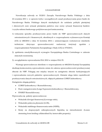 UZASADNIENIE Nowelizacja uchwały nr 53/2011 Zarządu Narodowego Banku Polskiego z dnia 22 września 2011 r. w sprawie trybu i szczegółowych zasad przekazywania przez banki do Narodowego Banku Polskiego danych niezbędnych do ustalania polityki pieniężnej i okresowych ocen sytuacji pieniężnej państwa oraz oceny sytuacji finansowej banków i ryzyka sektora bankowego podyktowana jest koniecznością: 1) wskazania sposobu przekazywania przez banki do NBP sprawozdawczych danych ostrożnościowych i finansowych, określonych w rozporządzeniu wykonawczym Komisji (UE) nr 680/2014 z dnia 16 kwietnia 2014 r. ustanawiającym wykonawcze standardy techniczne dotyczące sprawozdawczości nadzorczej instytucji zgodnie z rozporządzeniem Parlamentu Europejskiego i Rady (UE) nr 575/2013, 2) spełnienia zmodyfikowanych wymogów Europejskiego Banku Centralnego w zakresie statystyki monetarnej, 3) uwzględnienia wprowadzenia ESA 2010 w miejsce ESA 95. Wymogi sprawozdawcze określone w rozporządzeniu nr 680/2014 Komisji Europejskiej skutkują koniecznością wprowadzenia zmian do zakresu sprawozdawczości przekazywanej obecnie do NBP. Polegają one między innymi na zastąpieniu obecnie funkcjonujących i wprowadzeniu nowych pakietów sprawozdawczych. Zmianie ulega także częstotliwość przekazywania danych ostrożnościowych, objętych pakietem COREP Jednostkowy. Zastąpieniu ulegają pakiety: COREP Jednostkowy i Skonsolidowany, Duże zaangażowania (Large Exposures) Jednostkowy i Skonsolidowany, FINREP Skonsolidowany. Wprowadza się pakiety sprawozdawcze: Wskaźnik dźwigni finansowej (Leverage ratio), Wskaźniki pokrycia płynności (LCR), Wskaźniki stabilnego finansowania netto (NSFR), Straty na ekspozycjach zabezpieczonych hipoteką na nieruchomości (Losses stemming from lending collateralised by immovable property). Uzasadnienie do uchwały nr 40/2014 ZB Strona 1 z 4 Z uwagi na fakt, że rozporządzenie Komisji Europejskiej jest aktem prawnym mającym bezpośrednie zastosowanie we wszystkich krajach członkowskich UE, zakres zmian przedkładanego projektu nowelizacji uchwały obejmuje: uchylenie załączników nr 11 i 12 – obejmujących zakresem odpowiednio pakiety COREP i LE, ograniczenie stosowania załącznika nr 10 jedynie do sprawozdawczości przekazywanej na bazie jednostkowej – sprawozdawczość finansowa FINREP, uchylenie wzorów formularzy objętych załącznikiem nr 10 (dotyczącym pakietu FINREP), które obowiązywały wyłącznie dla sprawozdań skonsolidowanych, wskazanie nowego obowiązku sprawozdawczego wynikającego z rozporządzenia Komisji Europejskiej według terminów i w zakresie określonym w tym rozporządzeniu, wskazanie sposobu przekazywania do NBP danych objętych rozporządzeniem Komisji Europejskiej na dotychczasowych zasadach, wykorzystywanych dla obecnie obowiązującej sprawozdawczości SIS. W związku z tym, iż zapowiadane jest wydanie kolejnych rozporządzeń wykonawczych Komisji Europejskiej, określających standardy techniczne dla następnych zakresów danych sprawozdawczych, jak np. Forbearance and non-performing exposures oraz Asset encumbrance, konieczne będą kolejne nowelizacje uchwały nr 53/2011 jeszcze w bieżącym roku. Wejście w życie zmian związanych z opublikowaniem rozporządzenia wykonawczego nr 680/2014 Komisji Europejskiej z dnia 16 kwietnia 2014 r. określono na dzień opublikowania uchwały. To rozwiązanie będzie dotyczyło danych za czerwiec 2014 r. i będzie korzystne dla podmiotów, których obowiązek przekazania danych dotyczy, ponieważ ograniczy zakres przekazywanych dotychczas informacji. W projekcie proponuje się zmiany w formularzach sprawozdawczych, za pomocą których pozyskiwane są dane na potrzeby EBC, tj. w załączniku nr 2 wzory EBCXX i TR0XX, oraz w załączniku nr 15 wzory OPS/OPN. Wprowadzono dodatkowe przekroje analityczne, które umożliwią wypełnienie przez Narodowy Bank Polski zmodyfikowanych wymogów EBC w zakresie statystyki stanów bilansowych, transakcji oraz stóp procentowych, które zostały określone w rozporządzeniu Europejskiego Banku Centralnego nr 1071/2013 z dnia 24 września 2013 r., dotyczącym bilansu sektora monetarnych instytucji finansowych (wersja Uzasadnienie do uchwały nr 40/2014 ZB Strona 2 z 4 przekształcona) (EBC/2013/33) oraz w rozporządzeniu Europejskiego Banku Centralnego nr 1072/2013 z dnia 24 września 2013 r. w sprawie statystyki stóp procentowych stosowanych przez monetarne instytucje finansowe (wersja przekształcona) (EBC/2013/34). Wymienione rozporządzenia EBC uwzględniają standardy statystyczne ujęte w załączniku A do rozporządzenia Parlamentu Europejskiego i Rady (UE) nr 549/2013 z dnia 21 maja 2013 r. w sprawie europejskiego systemu rachunków narodowych i regionalnych w Unii Europejskiej, tj. ESA 2010, dotyczących zasad klasyfikacji sektorowej podmiotów gospodarczych oraz definicji instrumentów finansowych. W konsekwencji wymienionych wyżej zmian, w załączniku nr 2 na wzorach A0XXX, P0XXX, M0XXX, ID0XX i SEK0X, oraz w załączniku nr 18, we wzorze RPW1, ujednolicono nazewnictwo sektorów. W projekcie uchwały wprowadzenie zmian w sprawozdawczości, wynikających z wdrożenia ESA 2010, zaproponowano na dzień 1 grudnia 2014 r., co jest zgodne z terminem określonym w ww. rozporządzeniach EBC. Ponadto w uchwale wprowadzono zmianę formalną, wynikającą z faktu przystąpienia z dniem 1 stycznia 2015 r. Republiki Litewskiej do Unii Gospodarczej i Walutowej. Znajduje to swoje odzwierciedlenie we wzorach załącznika nr 3 do uchwały i dacie wejścia w życie § 1 pkt 11 lit. c uchwały również z dniem 1 stycznia 2015 r. W ramach procesu legislacyjnego uzgodniony wewnętrznie projekt uchwały skierowany został do zaopiniowania przez Związek Banków Polskich, Krajowy Związek Banków Spółdzielczych, banki oraz Komisję Nadzoru Finansowego. ZBP zgłosił uwagę dotyczącą wprowadzenia minimum 6 miesięcznego okresu przejściowego pomiędz