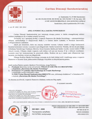 Caritas Diecezji Sandomierskiej ul. Opatowska10,27-600Sandomiez (15) tel.+48 64455 86, 64458 98,fax +48(15)832 11 45,taxwew.335 www.sandomiez.caritas.pl e-mail:[email protected], caritas Sandomierz, dnia 6 pńdziemika 2014 roku L. dz. W 1092/ SD/ 2014 APEL O POMOC DLA JAKUBA NOWICKTEGO Caritas Diecezji Sandomierskiej jest ins$rtucją niosącą pomoc w duchu ewangelicznej miłości osobom znajdującym się w trudnej sytuacji ryciowej. Zwracamy się z uprzejmą prośbąo wsparcie finansowe dla Jakuba Nowickiego - czternastoletniego chłopca, zamieszkałego w miejscowości Biała I, w Gminie Janów Lubęlski' w Powiecie Janowskim, rfuWoj ewództwie Lubelskim. Jakub jest dzieckiem, które ma znaczny niedobór wzrostu. Lekarze orzękli u niego konieczność leczenia hormonem wzrostu. Leczenie to jest długotrwdłei bardzo kosztowne. Niestety, lek ten nie jest objęty refundacją Narodowego Funduszu Zdrowia, Koszt |eczęnia Jakuba jest bardzo wysoki, wynosi około 27 000 złoĘch rocznie. Chłopiec dzięki wsparciu osób dobĘ woli jest juŻ |eczony 8 |at z dobrymi rezultatami. Leczenie musi byó konĘnuowane by prryniosło efekty. Rodzice nie są w stanie sami sfinansować tego |eczenia,tym bardziej, żejest ono dfugotrwałe. D|atego Rodzice Jakuba Nowickiego nttacają się do ludzi dobrej woli i wrazliwego serca o wsparcie finansowe w leczeniu Syna, jednocześniedziękując wszystkim za doĘchczasową pomoc. Jężę|izechcą Państwo pomóc Jakubowi Nowickiemu' mogą Państwo: 1. Prze|<azaó darowizny na ten cel na konto: PEKAO 33 |240 2786 ||1l0010 5ó70 9561 z dopiskiem rrDarowizna dla Jakuba Nowickiego" 2. Przeznaczyć lVo podatku odprowadzonego do Urzędu Skarbowego Uzupełniając roczne roz|iczenie o dane: Nr KRS Cańtas Diecezji Sandomierskiej 000021375l oraz ',informacje dodatkowe'' w formularzu PIT o dopisek rrDarowizna dla Jakuba Nowickiego". Za okazanąĘcz|iwość, wsparcie finansowe składamyserdecme Bóg zapŁać. Zwvrazami szacunku Je dnoc ze śnie infor muj e my: - osobyfizyczne zgodnie z art. 26 ust. I pkt. 9 b ustawy o podatlat dochodoll,ym od osóbfizycznych, daroltizny na ten cel mogq odliczyć do vysokości 6% od dochodu. - osoby pravne zgodnie z art. 18 usi I pla. la ustavy o podatku dochodolt,ym od osób pra.wnych, darowizny na ten cel mogą odliczyć od podstalły opodatkovania do 1096 dochodu. $"ł,'"t"\ -J KR$:ffiOXJZSI Wff rury.] APEL DAJE MoZLIwosC )Pa:Db",ą.Śl4rlll-'y,ą Iś,BogusławPttuchą UBIEGANIA sIĘ o PoMoC U osoB PRYWATNYCH I FIRM. APEL NIE DoTYCZY PARAFII. ISO 9001: 2008 ? , . DYREKToR Tłumaczenie ceĄfikatu HV 1317OO2,kontynuacja ' scq ' "*;*ł,-' 001056709561 PEKAO O/Sandomiez33124027861'111 BPH O/Sandomiez81 106000760000320000319541 NtP 864 00 09 741 REGON 040092844 KRS 0000213751