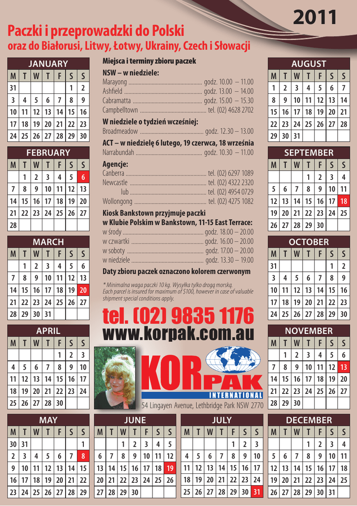 2011 Paczki i przeprowadzki do Polski oraz do Białorusi, Litwy, Łotwy, Ukrainy, Czech i Słowacji January M T W T F S S 31 3 10 17 24 4 11 18 25 5 12 19 26 6 13 20 27 7 14 21 28 1 8 15 22 29 2 9 16 23 30 February M T W T F S S 1 7 8 14 15 21 22 28 2 9 16 23 3 10 17 24 4 11 18 25 5 12 19 26 6 13 20 27 March M T W T F S S 7 14 21 28 1 8 15 22 29 2 9 16 23 30 3 10 17 24 31 4 11 18 25 5 12 19 26 6 13 20 27 April M T W T F S S 4 11 18 25 5 12 19 26 6 13 20 27 7 14 21 28 1 8 15 22 30 2 9 16 23 31 3 10 17 24 4 11 18 25 5 12 19 26 6 13 20 27 7 14 21 28 * Minimalna waga paczki 10 kg. Wysyłka tylko drogą morską. Each parcel is insured for maximum of $100, however in case of valuable shipment special conditions apply. tel. (02) 9835 1176 www.korpak.com.au 3 10 17 24 May M T W T F S S 30 2 9 16 23 Miejsca i terminy zbioru paczek NSW – w niedziele: Marayong . .................................................. godz. 10.00 – 11.00 Ashfield . ..................................................... godz. 13.00 – 14.00 Cabramatta ................................................. godz. 15.00 – 15.30 Campbelltown ............................................... tel. (02) 4628 2702 W niedziele o tydzień wcześniej: Broadmeadow ............................................. godz. 12.30 – 13.00 act – w niedzielę 6 lutego, 19 czerwca, 18 września Narrabundah . ............................................. godz. 10.30 – 11.00 Agencje: Canberra ........................................................ tel. (02) 6297 1089 Newcastle ...................................................... tel. (02) 4322 2320 lub ..................................................... tel. (02) 4954 0729 Wollongong . ................................................. tel. (02) 4275 1082 Kiosk Bankstown przyjmuje paczki w Klubie Polskim w Bankstown, 11-15 East Terrace: w środy ........................................................ godz. 18.00 – 20.00 w czwartki ................................................... godz. 16.00 – 20.00 w soboty ...................................................... godz. 17.00 – 20.00 w niedziele . ................................................. godz. 13.30 – 19.00 Daty zbioru paczek oznaczono kolorem czerwonym 1 8 15 22 29 August M T W T F S S 1 8 15 22 29 6 13 20 27 7 14 21 28 1 8 15 22 29 2 9 16 23 30 3 10 17 24 4 11 18 25 5 12 19 26 July M T W T F S S 4 11 18 25 5 12 19 26 6 13 20 27 7 14 21 28 1 8 15 22 29 2 9 16 23 30 3 10 17 24 31 3 10 17 24 31 4 11 18 25 5 12 19 26 6 13 20 27 7 14 21 28 September M T W T F S S 5 12 19 26 6 13 20 27 7 14 21 28 1 8 15 22 29 2 9 16 23 30 3 10 17 24 4 11 18 25 October M T W T F S S 31 3 10 17 24 4 11 18 25 5 12 19 26 6 13 20 27 7 14 21 28 1 8 15 22 29 2 9 16 23 30 november M T W T F S S 7 14 21 54 Lingayen Avenue, Lethbridge Park NSW 2770 28 June M T W T F S S 2 9 16 23 30 1 8 15 22 29 2 9 16 23 30 3 10 17 24 4 11 18 25 5 12 19 26 6 13 20 27 december M T W T F S S 5 12 19 26 6 13 20 27 7 14 21 28 1 8 15 22 29 2 9 16 23 30 3 10 17 24 31 4 11 18 25