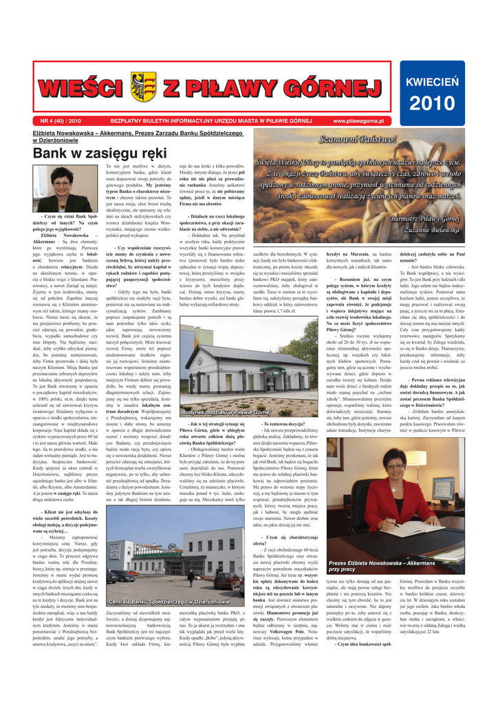 WIEŚCI NR 4 (40) / 2010 Z PIŁAWY GÓRNEJ BEZPŁATNY BIULETYN INFORMACYJNY URZĘDU MIASTA W PIŁAWIE GÓRNEJ Elżbieta Nowakowska – Akkermans, Prezes Zarządu Banku Spółdzielczego w Dzierżoniowie Bank w zasięgu ręki - Czym się różni Bank Spółdzielczy od innych? Na czym polega jego wyjątkowość? Elżbieta Nowakowska – Akkermans - Są dwa elementy, które go wyróżniają. Pierwsza jego wyjątkowa cecha to lokalność, bowiem jest bankiem o charakterze relacyjnym. Działa na określonym terenie, w oparciu o bliskie więzi z klientami. Pracownicy, a nawet Zarząd są tutejsi. Żyjemy w tym środowisku, znamy się od pokoleń. Zupełnie inaczej rozmawia się z Klientem anonimowym niż takim, którego znamy osobiście. Nieraz może się okazać, że ma przejściowe problemy, bo przecież zdarzają się powodzie, gradobicia, wypadki samochodowe czy inne kłopoty. Nie będziemy naciskać, żeby szybko odzyskać pieniądze, bo jesteśmy zainteresowani, żeby Firma przetrwała i dalej była naszym Klientem. Misją Banku jest przeznaczanie zebranych depozytów na lokalną aktywność gospodarczą. To jest Bank stworzony w oparciu o początkowy kapitał mieszkańców, w 100% polski, m.in. dzięki temu uchronił się od zawirowań kryzysu światowego. Działamy wyłącznie w oparciu o środki społeczeństwa, niezaangażowane w międzynarodowe korporacje. Nasz kapitał składa się z zysków wypracowanych przez 60 lat i to jest nasza główna wartość. Mało tego. Są to prawdziwe środki, a nie żaden wirtualny pieniądz. Jest to tradycyjna, bezpieczna bankowość. Kiedy spojrzeć za okno centrali w Dzierżoniowie, najbliższy prezes sąsiedniego banku jest albo w Irlandii, albo Rzymie, albo Amsterdamie. A ja jestem w zasięgu ręki. To nasza druga unikatowa cecha. - Klient nie jest odsyłany do wielu szczebli pośrednich. Koszty obsługi maleją, a decyzje podejmowane są szybciej… - Możemy zaproponować korzystniejszą cenę. Nieraz, gdy jest potrzeba, decyzje podejmujemy w ciągu dnia. To przecież odgrywa bardzo ważną rolę dla Przedsiębiorcy, który np. startuje w przetargu. Jesteśmy w stanie wydać promesę kredytową do aplikacji unijnej nawet w ciągu dwóch, trzech dni, kiedy w innych bankach miesiącami czeka się na te kredyty i decyzje. Bank jest na tyle nieduży, że możemy nim bezpośrednio zarządzać, więc u nas każdy kredyt jest faktycznie indywidualnym kredytem. Jesteśmy w stanie porozmawiać z Przedsiębiorcą bezpośrednio, ustalić jego potrzeby, a umowę kredytową „uszyć na miarę”. KWIECIEŃ To nie jest możliwe w dużym, komercyjnym banku, gdzie klient musi dopasować swoje potrzeby do gotowego produktu. My jesteśmy typem Banku o charakterze niszowym i chcemy takimi pozostać. To jest nasza misja, choć brzmi trochę idealistycznie, ale opieramy się właśnie na ideach stefczykowskich czy wzorcu działalności księdza Wawrzyniaka, ratującego ziemie wielkopolskie przed wykupem. - Czy współcześnie rzeczywiście mamy do czynienia z nowoczesną lichwą, której należy przeciwdziałać, by utrzymać kapitał w rękach rodaków i zapobiec postępującej pauperyzacji społeczeństwa? - Gdyby tego nie było, banki spółdzielcze nie miałyby racji bytu, ponieważ nie są nastawione na maksymalizację zysków. Zarabiamy poprzez zaspokojenie potrzeb i są nam potrzebne tylko takie zyski, jakie zapewniają nowoczesny rozwój. Bank jest częścią systemu naczyń połączonych. Może kreować rozwój Firmy, może też poprzez niedostosowanie środków zagrozić jej rozwojowi. Jesteśmy zainteresowani wspieraniem przedsiębiorczości lokalnej i zależy nam, żeby tutejszym Firmom dobrze się powodziło, bo wtedy mamy gwarancję długoterminowych relacji. Zajmujemy się nie tylko sprzedażą. Jesteśmy w zasadzie lokalnym centrum doradczym. Współpracujemy z Przedsiębiorcą, wskazujemy mu mocne i słabe strony, bo umiemy w oparciu o długie doświadczenie ocenić i możemy wesprzeć doradczo. Badamy, czy przedsięwzięcie będzie miało rację bytu, czy opiera się o nowatorską działalność. Nieraz przecież zdarzają się entuzjaści, których biznesplan trzeba zweryfikować negatywnie, po to tylko, aby uchronić przedsiębiorcę od upadku. Doradzamy z dużym powodzeniem. Jesteśmy jedynym Bankiem na tym terenie o tak długiej historii działania. ruje do nas kroki z kilku powodów. Miedzy innymi dlatego, że przez pół roku nic nie płaci za prowadzenie rachunku. Jesteśmy unikatowi również przez to, że nie pobieramy opłaty, jeżeli w danym miesiącu Firma nie ma obrotów. - Działacie na rzecz lokalnego społeczeństwa, a przy okazji zarabiacie na siebie, a nie odwrotnie? - Dokładnie tak. Na przykład w zeszłym roku, kiedy praktycznie wszystkie banki komercyjne prawie wycofały się z finansowania rolnictwa (ponieważ było bardzo nisko opłacalne w sytuacji wojny depozytowej, którą przeżyliśmy w związku z kryzysem), musieliśmy przejściowo do tych kredytów dopłacać. Dzisiaj, mimo kryzysu, mamy bardzo dobre wyniki, zaś banki globalne wykazują miliardowe straty. Centrala Banku Spółdzielczego w Dzierżoniowie Zaczynaliśmy od niewielkich możliwości, a dzisiaj dysponujemy najnowocześniejszą bankowością. Bank Spółdzielczy jest też najczęstszym bankiem pierwszego wyboru. Kiedy ktoś zakłada Firmę, kie- niewielką placówkę banku PKO, z całym wyposażeniem przejętą po nas. To ja akurat ją tworzyłam i ona tak wyglądała jak przed wielu laty. Kiedy upadło „Bobo”, jedyną aktywnością Piławy Górnej była wypłata www.pilawagorna.pl Szanowni Państwo! Święta Wielkiej Nocy to pamiątka spełnionych nadziei na lepsze życie. Z tej okazji życzę Państwu, aby świąteczny czas, zdrowo i wesoło spędzony w rodzinnym gronie, przyniósł wytchnienie od codziennych trosk i zaowocował realizacją życiowych planów oraz marzeń. Burmistrz Piławy Górnej Zuzanna Bielawska zasiłków dla bezrobotnych. W sy