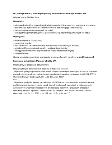 Dla naszego Klienta, poszukujemy osoby na stanowisko: Manager obiektu SPA Miejsce pracy: Bielsko- Biała Obowiązki: - odpowiedzialność za prawidłowe funkcjonowanie SPA w oparciu o stworzone procedury; - identyfikacja potrzeb klienta i monitorowanie poziomu jego zadowolenia; - tworzenie działań stymulujących sprzedaż; - rozwój strategii marketingowej i sprzedażowej wg najbardziej aktualnych trendów. Wymagania: - doświadczenie w zarządzaniu; - znajomość branży; - nastawienie na cel i ekonomiczną efektywność prowadzonych działań; - umiejętność oceny sytuacji, analizy, wyciągania wniosków; - umiejętność budowania odpowiednich relacji interpersonalnych; - zaangażowanie. Osoby spełniające powyższe wymagania prosimy o kontakt na adres: [email protected] Koniecznie z dopiskiem: Manager obiektu SPA Dziękujemy za przesłanie dokumentów Na przesyłanych dokumentach prosimy o dopisanie klauzuli: „Wyrażam zgodę na przetwarzanie moich danych osobowych zawartych w ofercie pracy dla potrzeb niezbędnych do realizacji procesu rekrutacji (zgodnie z ustawą z dnia 29.08.1997 o Ochronie Danych Osobowych, Dz. U. Nr 133, poz. 883)” oraz „Wyrażam zgodę dla Agencji zatrudnienia HR-SIGMA na przetwarzanie, administrowanie, archiwizowanie i wykorzystanie moich danych osobowych zawartych w dokumentach aplikacyjnych w zakresie niezbędnym dla realizacji obecnych i przyszłych procesów rekrutacji, selekcji, zgodnie z ustawą z dnia 29 sierpnia 1997 roku o Ochronie Danych Osobowych (tj. Dz. U. z 2002 r. Nr 101, poz. 926 z poźn. zm.).”