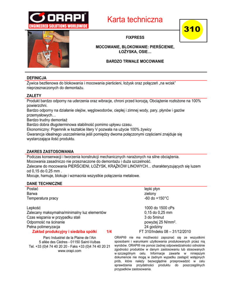 Karta techniczna FIXPRESS MOCOWANIE, BLOKOWANIE: PIERŚCIENIE, ŁOŻYSKA, OSIE… BARDZO TRWAŁE MOCOWANIE DEFINICJA Żywica beztlenowa do blokowania i mocowania pierścieni, łożysk oraz połączeń „na wcisk” nieprzeznaczonych do demontażu. ZALETY Produkt bardzo odporny na uderzenia oraz wibracje, chroni przed korozją. Obciążenie rozłożone na 100% powierzchni. Bardzo odporny na działanie olejów, węglowodorów, ciepłej i zimnej wody, pary, płynów i gazów przemysłowych… Bardzo trudny demontaż Bardzo dobra długoterminowa stabilność pomimo upływu czasu. Ekonomiczny: Pojemnik w kształcie litery V pozwala na użycie 100% żywicy Gwarancja idealnego uszczelnienia jeśli pomiędzy dwoma połączonymi częściami znajduje się wystarczająca ilość produktu. ZAKRES ZASTOSOWANIA Podczas konserwacji i tworzenia konstrukcji mechanicznych narażonych na silne obciążenia. Mocowania zasadniczo nie przeznaczone do demontażu i duża szczelność. Zalecane do mocowania PIERŚCIENI, ŁOŻYSK, KRĄŻKÓW LINOWYCH... charakteryzujących się luzem od 0,15 do 0,25 mm . Mocuje, hamuje, blokuje i wzmacnia wszystkie połączenia metalowe. DANE TECHNICZNE Postać Barwa Temperatura pracy Lepkość Zalecany maksymalna/minimalny luz elementów Czas wiązania w przypadku stali Odporność na ścinanie Pełna polimeryzacja Zakład produkcyjny i siedziba spółki 1/4 Parc Industriel de la Plaine de l’Ain 5 allée des Cèdres - 01150 Saint-Vulbas Tel. +33 (0)4 74 40 20 20 - Faks +33 (0)4 74 40 20 21 www.orapi.com lepki płyn zielony -60 do +150°C 1000 do 1500 cPs 0,15 do 0,25 mm 3 do 5minut powyżej 25 N/mm2. 24 godziny FT 310/Indeks 08 – 31/12/2010 ORAPI® nie ma możliwości zapoznać się ze wszystkimi sposobami i warunkami użytkowania produkowanych przez nią wyrobów. ORAPI® nie ponosi żadnej odpowiedzialności odnośnie zgodności produktów w danym zastosowaniu lub stosowanych w szczególnym celu. Informacje zawarte w niniejszym dokumencie nie mogą w żadnym wypadku zastąpić wstępnych prób, które należy bezwzględnie przeprowadzić w celu sprawdzenia przydatności produktu do poszczególnych przypadków zastosowania. Karta techniczna Wytrzymałość wyrażona w % wytrzymałości maksymalnej dla stali Prędkość polimeryzacji środka adhezyjnego Czas polimeryzacji w minutach Wytrzymałość wyrażona w % wytrzymałości maksymalnej dla stali Prędkość polimeryzacji produktu 310 FIXPRESS w zależności od rodzaju materiału Mosiądz Stal Stal ocynkowana Inox 50% wytrzymałości Czas polimeryzacji w minutach Zakład produkcyjny i siedziba spółki 2/4 Parc Industriel de la Plaine de l’Ain 5 allée des Cèdres - 01150 Saint-Vulbas Tel. +33 (0)4 74 40 20 20 - Faks +33 (0)4 74 40 20 21 www.orapi.com FT 310/Indeks 08 – 31/12/2010 ORAPI® nie ma możliwości zapoznać się ze wszystkimi sposobami i warunkami użytkowania produkowanych przez nią wyrobów. ORAPI® nie ponosi żadnej odpowiedzialności odnośnie zgodności produktów w danym zastosowaniu lub stosowanych w szczególnym celu. Informacje zawarte w niniejszym dokumencie nie mogą w żadnym wypadku zastąpić wstępnych prób, które należy bezwzględnie przeprowadzić w celu sprawdzenia przydatności produktu do poszczególnych przypadków zastosowania. Karta techniczna Wytrzymałość wyrażona w % wytrzymałości maksymalnej dla stali Prędkość polimeryzacji 310 FIXPRESS w zależności od występującego luzu Luz 0,05 Luz 0,015 Luz 0,25 50% wytrzymałości Czas polimeryzacji w minutach Wytrzymałość wyrażona w % wytrzymałości maksymalnej dla stali Prędkość polimeryzacji 310 FIXPRESS w zależności od temperatury otoczenia 40° C 22° C 5° C 50% wytrzymałości Czas polimeryzacji w minutach Zakład produkcyjny i siedziba spółki 3/4 Parc Industriel de la Plaine de l’Ain 5 allée des Cèdres - 01150 Saint-Vulbas Tel. +33 (0)4 74 40 20 20 - Faks +33 (0)4 74 40 20 21 www.orapi.com FT 310/Indeks 08 – 31/12/2010 ORAPI® nie ma możliwości zapoznać się ze wszystkimi sposobami i warunkami użytkowania produkowanych przez nią wyrobów. ORAPI® nie ponosi żadnej odpowiedzialności odnośnie zgodności produktów w danym zastosowaniu lub stosowanych w szczególnym celu. Informacje zawarte w niniejszym dokumencie nie mogą w żadnym wypadku zastąpić wstępnych prób, które należy bezwzględnie przeprowadzić w celu sprawdzenia przydatności produktu do poszczególnych przypadków zastosowania. Karta techniczna Wytrzymałość mechaniczna w % wytrzymałości w 25°C w zależności od temperatury ekspozycji Wytrzymałość SPOSÓB UŻYCIA Produkt jest gotowy do użycia. Temperatura zastosowania:+5 do +40°C Nałożyć preparat adhezyjny na czyste i suche powierzchnie w taki sposób, aby pozbyć się luzu elementów. Do czyszczenia zalecamy użyć produkt ŚRODEK CZYSZCZĄCY 3141. Złożyć części i nie poruszać nimi podczas wiązania (pierwsze 10 do 15 minut). W celu uzyskania szybszego mocowania (na stali nierdzewnej, metalach po obróbce lub na zimnie): użyć AKTYWATORA 3140. OPAKOWANIA Flakon 50 ml Flakon 250 ml nr katalogowy 1310 F3 nr katalogowy 1310 F5 x6 x1 HOMOLOGACJA AEROSPATIALE PQ 10053.060/061.03 Ocena produktu zgodnie ze specyfikacjami ARMII FRANCUSKIEJ. Zakład produkcyjny i siedziba spółki 4/4 Parc Industriel de la Plaine de l’Ain 5 allée des Cèdres - 01150 Saint-Vulbas Tel. +33 (0)4 74 40 20 20 - Faks +33 (0)4 74 40 20 21 www.orapi.com FT 310/Indeks 08 – 31/12/2010 ORAPI® nie ma możliwości zapoznać się ze wszystkimi sposobami i warunkami użytkowania produkowanych przez nią wyrobów. ORAPI® nie ponosi żadnej odpowiedzialności odnośnie zgodności produktów w danym zastosowaniu lub stosowanych w szczególnym celu. Informacje zawarte w niniejszym dokumencie nie mogą w żadnym wypadku zastąpić wstępnych prób, które należy bezwzględnie przeprowadzić w celu sprawdzenia przydatności produktu do poszczególnych przypadków zastosowania.