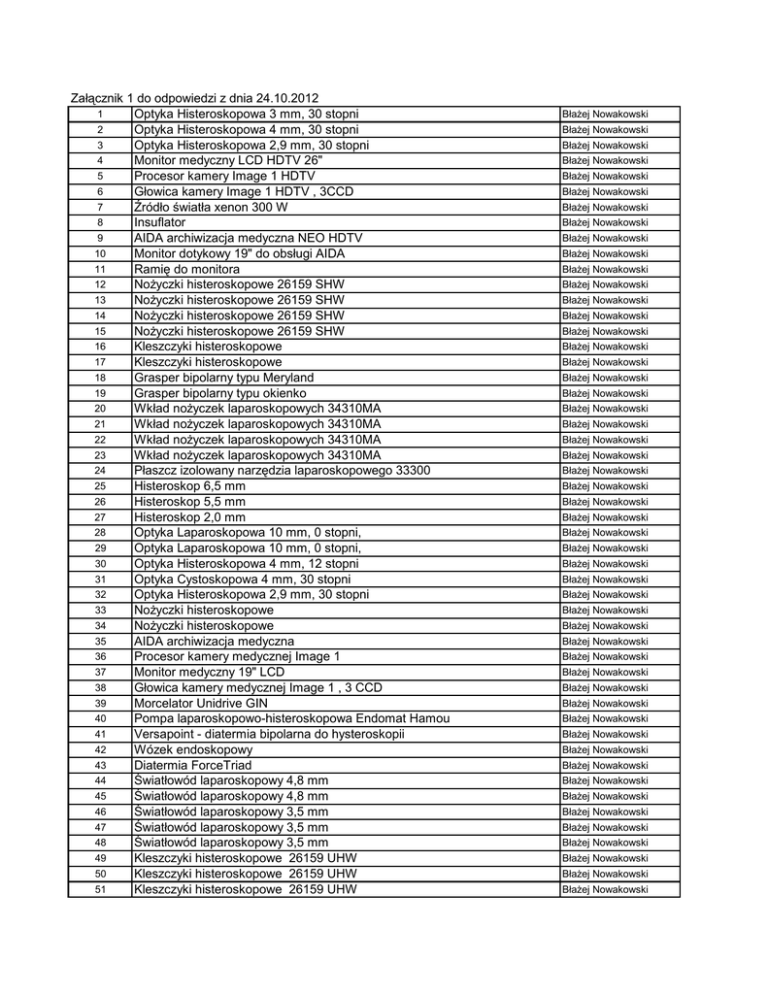 Załącznik 1 do odpowiedzi z dnia 24.10.2012 1 Optyka Histeroskopowa 3 mm, 30 stopni 2 Optyka Histeroskopowa 4 mm, 30 stopni 3 Optyka Histeroskopowa 2,9 mm, 30 stopni 4 Monitor medyczny LCD HDTV 26" 5 Procesor kamery Image 1 HDTV 6 Głowica kamery Image 1 HDTV , 3CCD 7 Źródło światła xenon 300 W 8 Insuflator 9 AIDA archiwizacja medyczna NEO HDTV 10 Monitor dotykowy 19" do obsługi AIDA 11 Ramię do monitora 12 Nożyczki histeroskopowe 26159 SHW 13 Nożyczki histeroskopowe 26159 SHW 14 Nożyczki histeroskopowe 26159 SHW 15 Nożyczki histeroskopowe 26159 SHW 16 Kleszczyki histeroskopowe 17 Kleszczyki histeroskopowe 18 Grasper bipolarny typu Meryland 19 Grasper bipolarny typu okienko 20 Wkład nożyczek laparoskopowych 34310MA 21 Wkład nożyczek laparoskopowych 34310MA 22 Wkład nożyczek laparoskopowych 34310MA 23 Wkład nożyczek laparoskopowych 34310MA 24 Płaszcz izolowany narzędzia laparoskopowego 33300 25 Histeroskop 6,5 mm 26 Histeroskop 5,5 mm 27 Histeroskop 2,0 mm 28 Optyka Laparoskopowa 10 mm, 0 stopni, 29 Optyka Laparoskopowa 10 mm, 0 stopni, 30 Optyka Histeroskopowa 4 mm, 12 stopni 31 Optyka Cystoskopowa 4 mm, 30 stopni 32 Optyka Histeroskopowa 2,9 mm, 30 stopni 33 Nożyczki histeroskopowe 34 Nożyczki histeroskopowe 35 AIDA archiwizacja medyczna 36 Procesor kamery medycznej Image 1 37 Monitor medyczny 19" LCD 38 Głowica kamery medycznej Image 1 , 3 CCD 39 Morcelator Unidrive GIN 40 Pompa laparoskopowo-histeroskopowa Endomat Hamou 41 Versapoint - diatermia bipolarna do hysteroskopii 42 Wózek endoskopowy 43 Diatermia ForceTriad 44 Światłowód laparoskopowy 4,8 mm 45 Światłowód laparoskopowy 4,8 mm 46 Światłowód laparoskopowy 3,5 mm 47 Światłowód laparoskopowy 3,5 mm 48 Światłowód laparoskopowy 3,5 mm 49 Kleszczyki histeroskopowe 26159 UHW 50 Kleszczyki histeroskopowe 26159 UHW 51 Kleszczyki histeroskopowe 26159 UHW Błażej Nowakowski Błażej Nowakowski Błażej Nowakowski Błażej Nowakowski Błażej Nowakowski Błażej Nowakowski Błażej Nowakowski Błażej Nowakowski Błażej Nowakowski Błażej Nowakowski Błażej Nowakowski Błażej Nowakowski Błażej Nowakowski Błażej Nowakowski Błażej Nowakowski Błażej Nowakowski Błażej Nowakowski Błażej Nowakowski Błażej Nowakowski Błażej Nowakowski Błażej Nowakowski Błażej Nowakowski Błażej Nowakowski Błażej Nowakowski Błażej Nowakowski Błażej Nowakowski Błażej Nowakowski Błażej Nowakowski Błażej Nowakowski Błażej Nowakowski Błażej Nowakowski Błażej Nowakowski Błażej Nowakowski Błażej Nowakowski Błażej Nowakowski Błażej Nowakowski Błażej Nowakowski Błażej Nowakowski Błażej Nowakowski Błażej Nowakowski Błażej Nowakowski Błażej Nowakowski Błażej Nowakowski Błażej Nowakowski Błażej Nowakowski Błażej Nowakowski Błażej Nowakowski Błażej Nowakowski Błażej Nowakowski Błażej Nowakowski Błażej Nowakowski 52 53 54 55 56 57 58 59 60 84 85 86 87 88 89 90 91 92 93 94 95 96 97 98 99 100 101 102 103 104 105 106 107 108 109 110 111 112 113 114 115 116 117 118 119 120 121 122 123 124 125 126 Kleszczyki histeroskopowe kulociąg Nożyczki histeroskopowe Morcelator Rotocut G1 - kpl. 12 mm Manipulator macicy HOHL - kpl. Grasper bipolarny RoBi typ Kelly Przewód bipolarny Przewód bipolarny Przewód bipolarny Storz -Erbe Imadło 26173ML Imadło 26173SC Imadło REDA Nożyczki laparoskopowe Wkład nożyczek laparoskopowych 34310MS Wkład nożyczek laparoskopowych 30519SL mikro Nożyczki laparoskopowe 34321MS Nożyczki laparoskopowe 34321MA Wkład nożyczek laparoskopowych 34310MA Wkład nożyczek laparoskopowych 34310MA Grasper laparoskopowy typu okienko Wkład disektora typu Kelly Grasper laparoskopowy typu Kelly 33321ML Grasper laparoskopowy typu zagięty disektor 33321R Grasper z drobnymi zębami (kulociąg) Wkład graspera z drobnymi zębami Kulociąg jednozębny Rurka ssąco-płucząca Igła punkcyjna Haczyk laparoskopowy Haczyk ruchomy na końcu Igła veressa 12 mm Igła veressa 15 mm Tuleja gwintowana na trokar 6 mm Tuleja gwintowana na trokar 6 mm Tuleja gwintowana na trokar 11mm Redukcja podpinana 11/5 mm Trokar 11 mm gładki Trokar Endotip Trokar 11 mm gwintowany Trokar 6 mm gładki Trokar 6 mm gwintowany Trokar 5,5 mm gładki Gwóźdź do trokara 6 mm Gwóźdź do trokara 6 mm Histeroskop 6,5 mm Histeroskop 2,9 mm Histeroskop 2,9 mm Histeroskop 4,0 mm Resektoskop Przewód monopolarny Przewód monopolarny Dren do gazu CO2 Penseta Valleylab Błażej Nowakowski Błażej Nowakowski Błażej Nowakowski Błażej Nowakowski Błażej Nowakowski Błażej Nowakowski Błażej Nowakowski Błażej Nowakowski Błażej Nowakowski Błażej Nowakowski Błażej Nowakowski Błażej Nowakowski Błażej Nowakowski Błażej Nowakowski Błażej Nowakowski Błażej Nowakowski Błażej Nowakowski Błażej Nowakowski Błażej Nowakowski Błażej Nowakowski Błażej Nowakowski Błażej Nowakowski Błażej Nowakowski Błażej Nowakowski Błażej Nowakowski Błażej Nowakowski Błażej Nowakowski Błażej Nowakowski Błażej Nowakowski Błażej Nowakowski Błażej Nowakowski Błażej Nowakowski Błażej Nowakowski Błażej Nowakowski Błażej Nowakowski Błażej Nowakowski Błażej Nowakowski Błażej Nowakowski Błażej Nowakowski Błażej Nowakowski Błażej Nowakowski Błażej Nowakowski Błażej Nowakowski Błażej Nowakowski Błażej Nowakowski Błażej Nowakowski Błażej Nowakowski Błażej Nowakowski Błażej Nowakowski Błażej Nowakowski Błażej Nowakowski Błażej Nowakowski 127 128 129 130 131 132 133 134 135 136 137 138 139 Dren do gazu CO2 Dren do gazu CO2 Dreny jednorazowe do histeroskopii do pompy Endomat Hamou - 20 szt. Dreny jednorazowe do laparoskopii do pompy Endomat Hamou - 20 szt. LigaSure Atlas 10 mm LigaSure Atlas 10 mm Końcówka LigaSure do laparotomii tzw Max Trokar jednorazowy - 15 szt. Nożyczki laparoskopowo Elektroda versapoint Elektroda versapoint Dren do pompy histeroskopowej Lemke Głowica ultradźwiękowa do aparatu USG ALOKA ProSound 3500 B