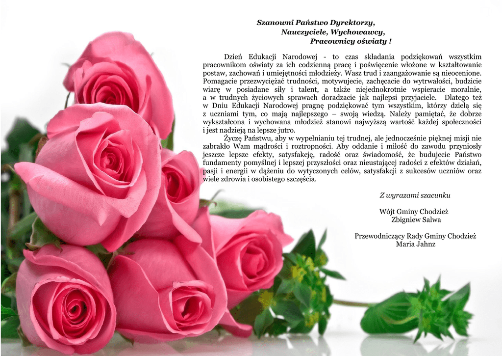 Szanowni Państwo Dyrektorzy, Nauczyciele, Wychowawcy, Pracownicy oświaty ! Dzień Edukacji Narodowej - to czas składania podziękowań wszystkim pracownikom oświaty za ich codzienną pracę i poświęcenie włożone w kształtowanie postaw, zachowań i umiejętności młodzieży. Wasz trud i zaangażowanie są nieocenione. Pomagacie przezwyciężać trudności, motywujecie, zachęcacie do wytrwałości, budzicie wiarę w posiadane siły i talent, a także niejednokrotnie wspieracie moralnie, a w trudnych życiowych sprawach doradzacie jak najlepsi przyjaciele. Dlatego też w Dniu Edukacji Narodowej pragnę podziękować tym wszystkim, którzy dzielą się z uczniami tym, co mają najlepszego – swoją wiedzą. Należy pamiętać, że dobrze wykształcona i wychowana młodzież stanowi najwyższą wartość każdej społeczności i jest nadzieją na lepsze jutro. Życzę Państwu, aby w wypełnianiu tej trudnej, ale jednocześnie pięknej misji nie zabrakło Wam mądrości i roztropności. Aby oddanie i miłość do zawodu przyniosły jeszcze lepsze efekty, satysfakcję, radość oraz świadomość, że budujecie Państwo fundamenty pomyślnej i lepszej przyszłości oraz nieustającej radości z efektów działań, pasji i energii w dążeniu do wytyczonych celów, satysfakcji z sukcesów uczniów oraz wiele zdrowia i osobistego szczęścia. Z wyrazami szacunku Wójt Gminy Chodzież Zbigniew Salwa Przewodniczący Rady Gminy Chodzież Maria Jahnz