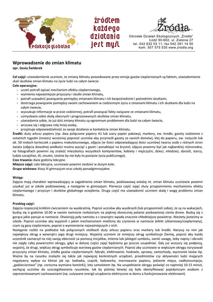 Ośrodek Działań Ekologicznych „Źródła” Łódź 90-602, ul. Zielona 27 tel. 042 632 03 11, fax 042 291 14 50 kom. 507 575 535 www.zrodla.org Wprowadzenie do zmian klimatu opr. Gosia Świderek Cel zajęć: uświadomienie uczniom, że zmiany klimatu powodowane przez emisje gazów cieplarnianych są faktem, uświadomienie skali skutków zmian klimatu na życie ludzi na całym świecie. Cele operacyjne: - uczeń potrafi opisać mechanizm efektu cieplarnianego, - wymienia najważniejsze przyczyny i skutki zmian klimatu, - potrafi uzasadnić powiązanie pomiędzy zmianami klimatu i ich bezpośrednimi i pośrednimi skutkami, - dostrzega powiązanie pomiędzy swoim zachowaniem w codziennym życiu a zmianami klimatu i ich skutkami dla ludzi na całym świecie, - wyszukuje informacje w prasie codziennej, potrafi powiązać fakty związane ze zmianami klimatu, - uzmysławia sobie skalę obecnych i prognozowanych skutków zmian klimatu, - uświadamia sobie, że już dziś zmiany klimatu są ogromnym problemem dla ludzi na całym świecie, - wczuwa się i odgrywa rolę innej osoby, - przyjmuje odpowiedzialność za swoje działania w kontekście zmian klimatu. Środki: duży arkusz papieru (np. dwa połączone papiery A1 lub szary papier pakowy), markery, ew. kredki, gazety codzienne z ostatnich tygodni (możesz wcześniej poprosić uczniów aby przynieśli gazety ze swoich domów), klej do papieru, ew. nożyczki lub ok. 50 małych karteczek z papieru makulaturowego, zdjęcia (w ilości odpowiadającej ilości uczniów) twarzy osób z różnych stron świata (zdjęcia dowolnej wielkości można wyciąć z gazet i ponaklejać na brystol; zdjęcia powinny być jak najbardziej różnorodne, na fotografiach powinni się znaleźć mieszkańcy wszystkich kontynentów, kobiety i mężczyźni, dzieci, młodzież, dorośli, starcy, ludzie szczęśliwi, źli, smutni, istotne by nie były to postacie życia publicznego). Czas trwania: dwie godziny lekcyjne. Miejsce zajęć: sala lekcyjna, uczniowie powinni siedzieć w dużym kole. Grupa wiekowa: klasy III gimnazjum oraz szkoły ponadgimnazjalne. Wstęp: Zajęcia mają charakter wprowadzający w zagadnienia zmian klimatu, podstawową wiedzę nt. zmian klimatu uczniowie powinni uzyskać już w szkole podstawowej, a następnie w gimnazjum. Pierwsza część zajęć służy przypomnieniu mechanizmu efektu cieplarnianego i przyczyn i skutków globalnego ocieplenia. Druga część ma uświadomić uczniom skalę i wagę problemu zmian klimatu. Przebieg zajęć: Zajęcia rozpocznij krótkim ćwiczeniem na wyobraźnię. Poproś uczniów aby wyobrazili (lub przypomnieli sobie), że są na wakacjach, budzą się o godzinie 10.00 w swoim namiocie rozłożonym na pięknej słonecznej polanie pozbawionej cienia drzew. Budzą się z gorąca jakie panuje w namiocie. Otwierają poły namiotu a z zewnątrz wpada znacznie chłodniejsze powietrze. Niestety jesteśmy w szkole. Poproś uczniów aby wyjaśnili z jakim mechanizmem mieliśmy do czynienia w namiocie (efekt szklarniowy/cieplarniany), czym są gazy cieplarniane, poproś o wymienienie najważniejszych z nich. Następnie rozłóż na podłodze lub połączonych stolikach duży arkusz papieru oraz markery lub kredki. Narysuj na nim jak największy okrąg a wewnątrz jego drugi mniejszy. Wyjaśnij uczniom że mniejszy okrąg symbolizuje Ziemię, poproś aby każdy uczestnik zaznaczył na niej swoją obecność za pomocą inicjałów, imienia lub jakiegoś symbolu, zwróć uwagę, żeby napisy i obrazki nie zajęły całej powierzchni okręgu, gdyż w dalszej części zajęć będziemy go jeszcze uzupełniać. Gdy już wszyscy się podpiszą, wyjaśnij, że drugi, większy okrąg symbolizuje warstwę gazów cieplarnianych. Poproś aby uczniowie w większym okręgu narysowali przyczyny zmian klimatu, źródła gazów cieplarnianych: fabryki, elektrownie, hodowle, uprawy, samochody, wycinanie lasów itp. Ważne by na rysunku znalazło się także jak najwięcej konkretnych urządzeń, przedmiotów czy aktywności ludzi mających negatywny wpływ na klimat jak np. lodówka, czajnik, ładowarka, marnowanie papieru, jedzenie mięsa, nadkonsumpcja, „gadżeciarstwo” (np. coroczna wymiana komórki), loty samolotem itp. Na uzupełnianie okręgu poświęć co najmniej 10-15 minut, zachęcaj uczniów do uszczegóławiania rysunków, tak by później łatwiej się było identyfikować pojedynczym osobom z zaprezentowanymi zachowaniami (np. zużywane energii urządzenia elektryczne w domu a funkcjonowanie elektrowni). Kolejny etap poświęć na zapełnienie mniejszego okręgu symbolizującego Ziemię. Poproś aby uczniowie wrysowali (ewentualnie wpisali) obecne i prognozowane skutki zmian klimatu na życie na ziemi zarówno te bezpośrednie jak i pośrednie, np. długotrwałe susze lub intensywne powodzie, zapaść rolnictwa, brak dostępu do czystej wody, niedożywienie i głód, choroby, wojny o wodę. Gdy już pomysły się wyczerpią poproś o odłożenie markerów i podziel uczniów na 2-3 osobowe grupy. Rozdaj grupom gazety codzienne z ostatnich tygodni. W zależności czy chcesz poświęcić gazety możesz rozdać nożyczki aby uczniowie wycinali potrzebne cytaty, albo rozdać małe karteczki (najlepiej z makulatury, kartka A4 pocięta na 4-6 kawałków) i pisaki by uczniowie wynotowywali najważniejsze informacje. Poproś uczniów aby przejrzeli gazety pod kątem doniesień związanych wg nich z istniejącymi zmianami klimatu, mogą to być doniesienia o kataklizmach, ekstremalnych zjawiskach pogodowych zarówno w Polsce jak i na świecie, informacje o podwyżkach cen żywności, chorobach, sytuacji w krajach Globalnego Południa, informacje z działu gospodarka. Wynalezione artykuły lub ich fragmenty należy wyciąć z gazety, zaznaczyć kolorowym pisakiem najważniejsze fragmenty (lub przepisać na karteczki najważniejsze informacje). Po zakończeniu prac przedstawiciele kolejnych grup podchodzą do rysunku z kręg