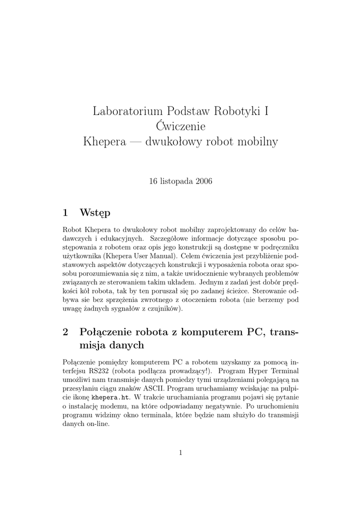 Laboratorium Podstaw Robotyki I Ćwiczenie Khepera — dwukołowy robot mobilny 16 listopada 2006 1 Wstęp Robot Khepera to dwukołowy robot mobilny zaprojektowany do celów badawczych i edukacyjnych. Szczegółowe informacje dotyczące sposobu postępowania z robotem oraz opis jego konstrukcji są dostępne w podręczniku użytkownika (Khepera User Manual). Celem ćwiczenia jest przybliżenie podstawowych aspektów dotyczących konstrukcji i wyposażenia robota oraz sposobu porozumiewania się z nim, a także uwidocznienie wybranych problemów związanych ze sterowaniem takim układem. Jednym z zadań jest dobór prędkości kół robota, tak by ten poruszał się po zadanej ścieżce. Sterowanie odbywa sie bez sprzężenia zwrotnego z otoczeniem robota (nie berzemy pod uwagę żadnych sygnałów z czujników). 2 Połączenie robota z komputerem PC, transmisja danych Połączenie pomiędzy komputerem PC a robotem uzyskamy za pomocą interfejsu RS232 (robota podłącza prowadzący!). Program Hyper Terminal umożliwi nam transmisje danych pomiedzy tymi urządzeniami polegającą na przesyłaniu ciągu znaków ASCII. Program uruchamiamy wciskając na pulpicie ikonę khepera.ht. W trakcie uruchamiania programu pojawi się pytanie o instalację modemu, na które odpowiadamy negatywnie. Po uruchomieniu programu widzimy okno terminala, które będzie nam służyło do transmisji danych on-line. 1 Symbol komendy A B C D E F G H I J K L N O P T R W Tablica 1: Komendy Khepery. Krótki opis działania Konfigurowanie nastaw regulatora PID prędkości zadanej Odczytywanie wersji oprogramowania Ustawianie zadanej pozycji kół Ustawianie prędkości kół Odczytywanie prędkości kół Konfigurowanie nastaw regulatora PID pozycji zadanej Ustawianie wartości licznika pozycji kół Odczytywanie pozycji Odczytywanie wejścia A/D Konfigurowanie profilu regulatora prędkości Odczytywanie stanu regulatora ruchu Zmienianie stanu diod LED Odczytywanie stanu sensorów odległości Odczytywanie stanu sensorów oświetlenia Ustawianie PWM Wysyłanie wiadomości do dodatkowego modułu robota Odczytywanie bajtu z dodatkowego modułu robota Zapisywanie bajtu do dodatkowego modułu robota Przykład. Test połączenia - wersja oprogramowania robota. Duża litera B stanowi zapytanie o wersję oprogramowania Khepery tj. wersje oprogramowania biosu oraz protokolu transmisji szeregowej. Wpiszmy tę literę w okno terminala i naciśnijmy ENTER. Po krótkiej chwili robot powinien odpowiedzieć b,X,Y gdzie X, Y są kodami odpowiadającymi wersji oprogramowania robota. 3 Porozumiewanie się z robotem Z robotem porozumiewamy się za pomocą komend, z których każda ma swój jednoliterowy kod (duże litery od A do W) oraz opcjonalną listę parametrów odseparowanych przecinkami. Komendy możemy podzielić na te, które zadają wartości parametrów robota (np. prędkości kół) i te, które o wartości parametrów pytają. Listę dostępnych komend przedstawia tabela 3 a ich szczegółowy opis znajduje się na końcu niniejszej instrukcji. 3.1 Ćwiczenia Korzystając ze szczegółowych opisów komend Khepery należy wykonać poniższe ćwiczenia: 1. Zmienić stan diod LED 2. Zdjąć charakterystyki czujników odległości (porównać otrzymane wykresy z wykresami zamieszczonymi w Podręczniku Użytkownika) 3. Zdjąć charakterystyki czujników oświetlenia (porównać otrzymane wykresy z wykresami zamieszczonymi w Podręczniku Użytkownika) 4. Obliczyć promień koła robota wiedząc, że licznik zlicza 600 impulsów na obrót koła, co odpowiada 1 impulsowi na 0, 08mm ścieżki zakreślanej przez punkt kontaktu koła z podłożem. 5. Wyzerować licznik położenia każdego z kół, przejechać po prostej dystans 10cm. Jakie powinny być wartości parametrów komendy C? Odczytać wartości liczników położenia kół. 4 Wysyłanie ciągu komend zapisanych w pliku Ciąg komend zapisanych w pliku możemy wysłać do robota korzystając z menu terminala: Transfer->Send_Text_File i podając nazwę pliku (uwaga: na końcu każdego pliku musi znajdować się znak nowej linii). Czas wysyłania pojedynczego znaku do Khepery ustawia się w oknie terminala File->Properties->Settings->ASCII_Setup w polu Character_delay. Natomiast w polu Line_delay ustawia się czas wysylania pustej linii. Dzięki tym parametrom będziemy mogli sterować czasem podczas działania Khepery (np. wpisując do pliku puste linie). 4.1 Ćwiczenia 1. Wykorzystując komendę C zapisać w pliku program, który przemieści robota po płaszczyźnie tak, że jego środek symetrii zakreśli kwadrat o boku 10cm. 2. Program z poprzedniego ćwiczenia zmodyfikować tak, by robot czekał w każdym z narożników kwadratu 2 sekundy. 3. Naturalnymi sterowaniami robota są prędkości kątowe ω1 , ω2 jego kół. Niech u = (ω1 , ω2 ) ∈ R2 będzie pewną funkcją sterowań np. rys. 1. Sterowania te przeprowadzą robota od położenia początkowego S do końcowego G na płaszczyźnie ruchu. Należy sprawdzić czy sterowania û = u−1 (u−1 oznacza funkcję odwrotną do u) przeprowadzą robota od punktu G do S. Jeżeli nie to jak musiałaby wyglądać funkcja sterowań û? ω1 0 ω2 t 0 t Rysunek 1: Przebiegi prędkości kół Khepery w czasie. 5 Zadanie do wykonania Celem zadania jest napisanie programu, który przeprowadzi robota od punktu startowego S do końcowego G po zadanej ścieżce (np. rys. 3). Ścieżka składa się z kilku łuków o znanych promieniach krzywizny (promienie zadaje prowadzący). Zadanie można rozwiązać bazując na poniższym przykładzie. Po wykonaniu zadania należy porównać wyniki doświadczalne z teoretycznymi oraz zastanowić się co wpływa na rozbieżności między tymi wynikami. Przykład. Zakreślanie okręgu o promieniu R = 5cm przez punkt leżący w środku symetrii robota. Rozwiązanie. Długość promienia podstawy robota r wynosi w przybliżeniu 25mm. Chcemy znaleźć takie prędkości liniowe kół v1 , v2 , aby środek 