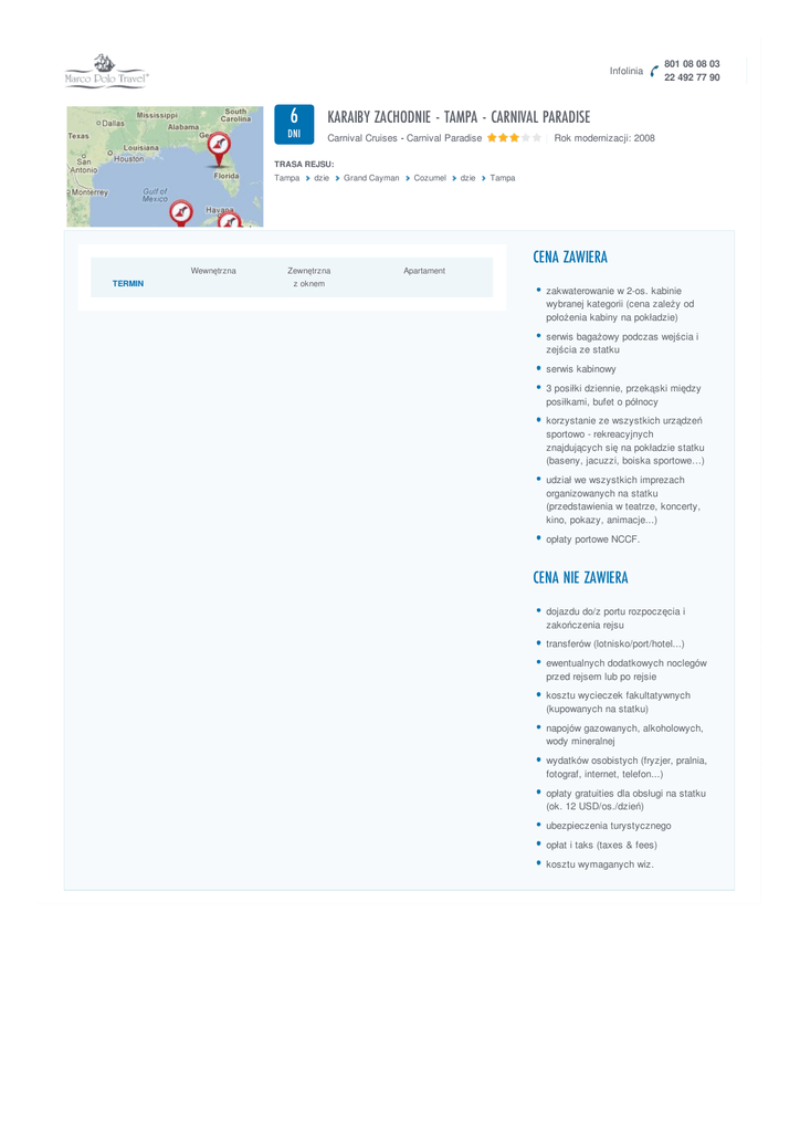 Infolinia 6 KARAIBY ZACHODNIE - TAMPA - CARNIVAL PARADISE DNI Carnival Cruises - Carnival Paradise 801 08 08 03 22 492 77 90 | Rok modernizacji: 2008 TRASA REJSU: Tampa Wewnętrzna TERMIN dzie Zewnętrzna z oknem Grand Cayman Cozumel Apartament dzie Tampa CENA ZAWIERA zakwaterowanie w 2-os. kabinie wybranej kategorii (cena zależy od położenia kabiny na pokładzie) serwis bagażowy podczas wejścia i zejścia ze statku serwis kabinowy 3 posiłki dziennie, przekąski między posiłkami, bufet o północy korzystanie ze wszystkich urządzeń sportowo - rekreacyjnych znajdujących się na pokładzie statku (baseny, jacuzzi, boiska sportowe…) udział we wszystkich imprezach organizowanych na statku (przedstawienia w teatrze, koncerty, kino, pokazy, animacje...) opłaty portowe NCCF. CENA NIE ZAWIERA dojazdu do/z portu rozpoczęcia i zakończenia rejsu transferów (lotnisko/port/hotel...) ewentualnych dodatkowych noclegów przed rejsem lub po rejsie kosztu wycieczek fakultatywnych (kupowanych na statku) napojów gazowanych, alkoholowych, wody mineralnej wydatków osobistych (fryzjer, pralnia, fotograf, internet, telefon...) opłaty gratuities dla obsługi na statku (ok. 12 USD/os./dzień) ubezpieczenia turystycznego opłat i taks (taxes & fees) kosztu wymaganych wiz.