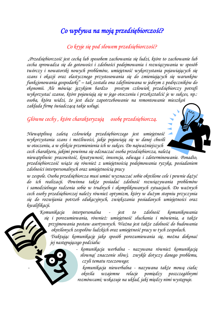 Co wpływa na moją przedsiębiorczość? Co kryje się pod słowem przedsiębiorczość? „Przedsiębiorczość jest cechą lub sposobem zachowania się ludzi, które to zachowanie lub cecha sprowadza się do gotowości i zdolności podejmowania i rozwiązywania w sposób twórczy i nowatorski nowych problemów, umiejętność wykorzystania pojawiających się szans i okazji oraz elastycznego przystosowania się do zmieniających się warunków funkcjonowania gospodarki” – tak została ona zdefiniowana w jednym z podręczników do ekonomii. Ale mówiąc językiem bardzo prostym człowiek przedsiębiorczy potrafi wykorzystać szanse, które pojawiają się w jego otoczeniu i przekształcić je w sukces, np.: osoba, która widzi, że jest duże zapotrzebowanie na remontowanie mieszkań zakłada firmę świadczącą takie usługi. Główne cechy , które charakteryzują osobę przedsiębiorczą. Niewątpliwą zaletą człowieka przedsiębiorczego jest umiejętność wykorzystania szans i możliwości, jakie pojawiają się w danej chwili w otoczeniu, a w efekcie przemienienia ich w sukces. Do najważniejszych cech charakteru, jakimi powinna się odznaczać osoba przedsiębiorcza, należą niewątpliwie: pracowitość, kreatywność, inwencja, odwaga i zdeterminowanie. Ponadto, przedsiębiorczość wiąże się również z umiejętnością podejmowania ryzyka, posiadaniem zdolności interpersonalnych oraz umiejętnością pracy w zespole. Osoba przedsiębiorcza musi umieć wyznaczać sobie określone cele i pewnie dążyć do ich realizacji. Powinna także posiadać zdolność rozwiązywania problemów i samodzielnego radzenia sobie w trudnych i skomplikowanych sytuacjach. Do ważnych cech osoby przedsiębiorczej należy również optymizm, który w dużym stopniu przyczynia się do rozwijania potrzeb edukacyjnych, zwiększania posiadanych umiejętności oraz kwalifikacji. Komunikacja interpersonalna - jest to zdolność komunikowania się i porozumiewania, również: umiejętność słuchania i mówienia, a także przyjmowania postaw asertywnych. Ważna jest także zdolność do budowania określonych zespołów ludzkich oraz umiejętność pracy w tych zespołach. Traktując komunikację jako sposób porozumiewania się, można dokonać jej następującego podziału: - komunikacja werbalna - nazywana również komunikacją słowną( znaczenie słów), zwykle dotyczy danego problemu, czyli tematu rzeczowego; komunikacja niewerbalna - nazywana także mową ciała; określa wzajemne relacje pomiędzy poszczególnymi rozmówcami; wskazuje na układ, jaki między nimi występuje. Jak stać się osobą przedsiębiorczą? Człowiek , który chce osiągnąć zaplanowane cele, musi odpowiednio kształtować swoją osobowość. Osoba , chcąc się rozwijać , powinna poszukiwać nowych doświadczeń , analizować sytuacje, w których uczestniczyła i wyciągać wnioski , a także zbierać informacje o swoich zachowaniach . Przedsiębiorcza osoba charakteryzuje się inteligencją , pewnością siebie , dążeniem do osiągnięć , odwagą , odpornością na stres i umiejętnością do dostosowywania się do sytuacji. Tabela cech osobowości i umiejętności osoby przedsiębiorczej Cechy osobowości Umiejętności - pewność siebie - ambicja - orientacja na osiągnięcia i sukcesy - asertywność - odporność na stres - upór i stanowczość - inteligencja - odwaga - kreatywność - komunikatywność - szybkie podejmowanie decyzji - takt i talenty dyplomatyczne - podejmowanie trafnych decyzji - wykorzystywanie szans -umiejętność przyjmowania porażek wyciągania konstruktywnych wniosków i - nie zrażanie się niepowodzeniami - wytrwałość - pracowitość - systematyczność - determinacja Jakie warunki muszą być spełnione , aby cechy przedsiębiorczości mogły się rozwijać ? Rozwojowi przedsiębiorczości sprzyjają następujące czynniki : System ekonomiczny danego kraju ( system rynkowy pobudza przedsiębiorczość , system scentralizowany ją hamuje ) Indywidualne cechy człowieka , jego intuicja i wyczucie rynku Wykształcenie Kultura otoczenia danego człowieka Pojęcia tożsame z przedsiębiorczością . Z przedsiębiorczością łączą się również pojęcia : Ekspansywność – termin ten oznacza wytaczanie sobie ambitnych zadań i celów których realizacja pozwala na osiągnięcie większych niż dotychczas efektów. Ekspansywność to dążenie do dorównania najsilniejszym i najlepszym Innowacyjność – wprowadzanie wszelkich twórczych ulepszeń – od drobnych usprawnień do rewolucyjnych zmian w organizacji i technice Innowacyjność i ekspansywność , a więc postawy kładące nacisk na stały rozwój , uważa się za charakterystyczne cechy przedsiębiorczości . Rodzaje przedsiębiorczości. W zależności od warunków mających decydujący wpływ na rozwój przedsiębiorczości wyróżnia się kilka jej typów : Przedsiębiorczość żywiołowa - wynika z cech charakterologicznych człowieka Przedsiębiorczość ewolucyjna - jest ona efektem rozwoju form przedsiębiorczych . Przedsiębiorczość systemowa - dotyczy ona gospodarek krajów rozwiniętych , jest związana ze świadomym kształtowaniem przez państwo społeczeństwa przedsiębiorczego . Powszechny jest pogląd że przedsiębiorczość sprowadza się do zakładania i prowadzenia małych przedsiębiorstw . Nie ulega wątpliwości , że taka działalność jest najważniejszym przejawem przedsiębiorczości , nie można jednak zapominać , iż przedsiębiorczość ma również szerszy wymiar . Z postawami kładącymi nacisk na ekspansywność i innowacyjność możemy się zetknąć w przedsiębiorstwach , jak i w życiu codziennym . Niezależność , liczenie na własne siły , ambicja do osiągnięcia jak najwyższych efektów , szukanie jak najlepszych rozwiązań w pracy zawodowej ,efektywne gospodarowanie posiadanymi środkami – również stanowią objaw przedsiębiorczości mimo iż nie tow