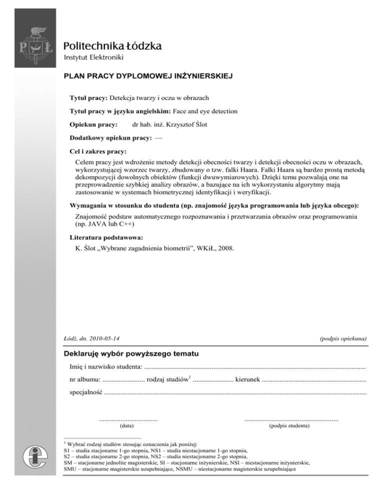 PLAN PRACY DYPLOMOWEJ INśYNIERSKIEJ Tytuł pracy: Detekcja twarzy i oczu w obrazach Tytuł pracy w języku angielskim: Face and eye detection Opiekun pracy: dr hab. inŜ. Krzysztof Ślot Dodatkowy opiekun pracy: — Cel i zakres pracy: Celem pracy jest wdroŜenie metody detekcji obecności twarzy i detekcji obecności oczu w obrazach, wykorzystującej wzorzec twarzy, zbudowany o tzw. falki Haara. Falki Haara są bardzo prostą metodą dekompozycji dowolnych obiektów (funkcji dwuwymiarowych). Dzięki temu pozwalają one na przeprowadzenie szybkiej analizy obrazów, a bazujące na ich wykorzystaniu algorytmy mają zastosowanie w systemach biometrycznej identyfikacji i weryfikacji. Wymagania w stosunku do studenta (np. znajomość języka programowania lub języka obcego): Znajomość podstaw automatycznego rozpoznawania i przetwarzania obrazów oraz programowania (np. JAVA lub C++) Literatura podstawowa: K. Ślot „Wybrane zagadnienia biometrii”, WKiŁ, 2008. Łódź, dn. 2010-05-14 (podpis opiekuna) Deklaruję wybór powyŜszego tematu Imię i nazwisko studenta: ............................................................................................................................. nr albumu: ........................ rodzaj studiów1 ....................... kierunek ........................................................... specjalność .................................................................................................................................................... ................................. (data) ..................................................... (podpis studenta) –––––––––––––––––––––––– 1 Wybrać rodzaj studiów stosując oznaczenia jak poniŜej: S1 – studia stacjonarne 1-go stopnia, NS1 – studia niestacjonarne 1-go stopnia, S2 – studia stacjonarne 2-go stopnia, NS2 – studia niestacjonarne 2-go stopnia, SM – stacjonarne jednolite magisterskie, SI – stacjonarne inŜynierskie, NSI – niestacjonarne inŜynierskie, SMU – stacjonarne magisterskie uzupełniające, NSMU – niestacjonarne magisterskie uzupełniające