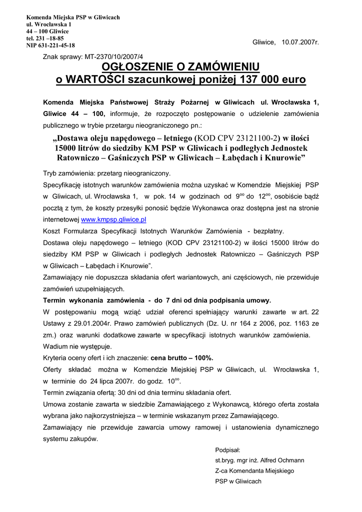 Komenda Miejska PSP w Gliwicach ul. Wrocławska 1 44 – 100 Gliwice tel. 231 –18-85 NIP 631-221-45-18 Gliwice, 10.07.2007r. Znak sprawy: MT-2370/10/2007/4 OGŁOSZENIE O ZAMÓWIENIU o WARTOŚCI szacunkowej poniżej 137 000 euro Komenda Miejska Państwowej Straży Pożarnej w Gliwicach ul. Wrocławska 1, Gliwice 44 – 100, informuje, że rozpoczęto postępowanie o udzielenie zamówienia publicznego w trybie przetargu nieograniczonego pn.: „Dostawa oleju napędowego – letniego (KOD CPV 23121100-2) w ilości 15000 litrów do siedziby KM PSP w Gliwicach i podległych Jednostek Ratowniczo – Gaśniczych PSP w Gliwicach – Łabędach i Knurowie” Tryb zamówienia: przetarg nieograniczony. Specyfikację istotnych warunków zamówienia można uzyskać w Komendzie Miejskiej PSP w Gliwicach, ul. Wrocławska 1, w pok. 14 w godzinach od 9oo do 12oo, osobiście bądź pocztą z tym, że koszty przesyłki ponosić będzie Wykonawca oraz dostępna jest na stronie internetowej www.kmpsp.gliwice.pl Koszt Formularza Specyfikacji Istotnych Warunków Zamówienia - bezpłatny. Dostawa oleju napędowego – letniego (KOD CPV 23121100-2) w ilości 15000 litrów do siedziby KM PSP w Gliwicach i podległych Jednostek Ratowniczo – Gaśniczych PSP w Gliwicach – Łabędach i Knurowie”. Zamawiający nie dopuszcza składania ofert wariantowych, ani częściowych, nie przewiduje zamówień uzupełniających. Termin wykonania zamówienia - do 7 dni od dnia podpisania umowy. W postępowaniu mogą wziąć udział oferenci spełniający warunki zawarte w art. 22 Ustawy z 29.01.2004r. Prawo zamówień publicznych (Dz. U. nr 164 z 2006, poz. 1163 ze zm.) oraz warunki dodatkowe zawarte w specyfikacji istotnych warunków zamówienia. Wadium nie występuje. Kryteria oceny ofert i ich znaczenie: cena brutto – 100%. Oferty składać można w Komendzie Miejskiej PSP w Gliwicach, ul. Wrocławska 1, w terminie do 24 lipca 2007r. do godz. 10oo. Termin związania ofertą: 30 dni od dnia terminu składania ofert. Umowa zostanie zawarta w siedzibie Zamawiającego z Wykonawcą, którego oferta została wybrana jako najkorzystniejsza – w terminie wskazanym przez Zamawiającego. Zamawiający nie przewiduje zawarcia umowy ramowej i ustanowienia dynamicznego systemu zakupów. Podpisał: st.bryg. mgr inż. Alfred Ochmann Z-ca Komendanta Miejskiego PSP w Gliwicach
