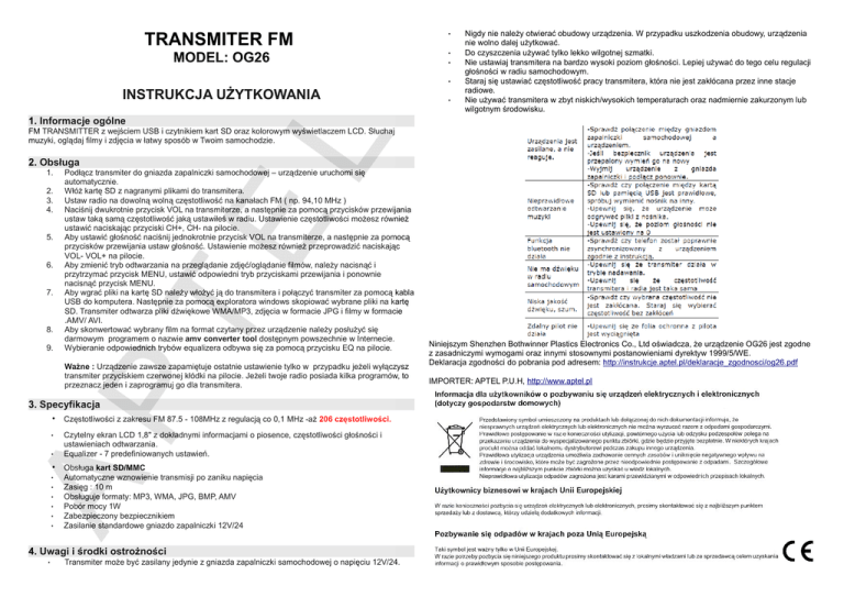 TRANSMITER FM MODEL: OG26 INSTRUKCJA UŻYTKOWANIA • • • • • Nigdy nie należy otwierać obudowy urządzenia. W przypadku uszkodzenia obudowy, urządzenia nie wolno dalej użytkować. Do czyszczenia używać tylko lekko wilgotnej szmatki. Nie ustawiaj transmitera na bardzo wysoki poziom głośności. Lepiej używać do tego celu regulacji głośności w radiu samochodowym. Staraj się ustawiać częstotliwość pracy transmitera, która nie jest zakłócana przez inne stacje radiowe. Nie używać transmitera w zbyt niskich/wysokich temperaturach oraz nadmiernie zakurzonym lub wilgotnym środowisku. 1. Informacje ogólne FM TRANSMITTER z wejściem USB i czytnikiem kart SD oraz kolorowym wyświetlaczem LCD. Słuchaj muzyki, oglądaj filmy i zdjęcia w łatwy sposób w Twoim samochodzie. 2. Obsługa 1. 2. 3. 4. 5. 6. 7. 8. 9. Podłącz transmiter do gniazda zapalniczki samochodowej – urządzenie uruchomi się automatycznie. Włóż kartę SD z nagranymi plikami do transmitera. Ustaw radio na dowolną wolną częstotliwość na kanałach FM ( np. 94,10 MHz ) Naciśnij dwukrotnie przycisk VOL na transmiterze, a następnie za pomocą przycisków przewijania ustaw taką samą częstotliwość jaką ustawiłeś w radiu. Ustawienie częstotliwości możesz również ustawić naciskając przyciski CH+, CH- na pilocie. Aby ustawić głośność naciśnij jednokrotnie przycisk VOL na transmiterze, a następnie za pomocą przycisków przewijania ustaw głośność. Ustawienie możesz również przeprowadzić naciskając VOL- VOL+ na pilocie. Aby zmienić tryb odtwarzania na przeglądanie zdjęć/oglądanie filmów, należy nacisnąć i przytrzymać przycisk MENU, ustawić odpowiedni tryb przyciskami przewijania i ponownie nacisnąć przycisk MENU. Aby wgrać pliki na kartę SD należy włożyć ją do transmitera i połączyć transmiter za pomocą kabla USB do komputera. Następnie za pomocą exploratora windows skopiować wybrane pliki na kartę SD. Transmiter odtwarza pliki dźwiękowe WMA/MP3, zdjęcia w formacie JPG i filmy w formacie .AMV/ AVI. Aby skonwertować wybrany film na format czytany przez urządzenie należy posłużyć się darmowym programem o nazwie amv converter tool dostępnym powszechnie w Internecie. Wybieranie odpowiednich trybów equalizera odbywa się za pomocą przycisku EQ na pilocie. Ważne : Urządzenie zawsze zapamiętuje ostatnie ustawienie tylko w przypadku jeżeli wyłączysz transmiter przyciskiem czerwonej kłódki na pilocie. Jeżeli twoje radio posiada kilka programów, to przeznacz jeden i zaprogramuj go dla transmitera. 3. Specyfikacja • • Częstotliwości z zakresu FM 87.5 - 108MHz z regulacją co 0,1 MHz -aż 206 częstotliwości. • Czytelny ekran LCD 1,8" z dokładnymi informacjami o piosence, częstotliwości głośności i ustawieniach odtwarzania. Equalizer - 7 predefiniowanych ustawień. • • • • • • Obsługa kart SD/MMC Automatyczne wznowienie transmisji po zaniku napięcia Zasięg : 10 m Obsługuje formaty: MP3, WMA, JPG, BMP, AMV Pobór mocy 1W Zabezpieczony bezpiecznikiem Zasilanie standardowe gniazdo zapalniczki 12V/24 • 4. Uwagi i środki ostrożności • Transmiter może być zasilany jedynie z gniazda zapalniczki samochodowej o napięciu 12V/24. Niniejszym Shenzhen Bothwinner Plastics Electronics Co., Ltd oświadcza, że urządzenie OG26 jest zgodne z zasadniczymi wymogami oraz innymi stosownymi postanowieniami dyrektyw 1999/5/WE. Deklaracja zgodności do pobrania pod adresem: http://instrukcje.aptel.pl/deklaracje_zgodnosci/og26.pdf IMPORTER: APTEL P.U.H, http://www.aptel.pl