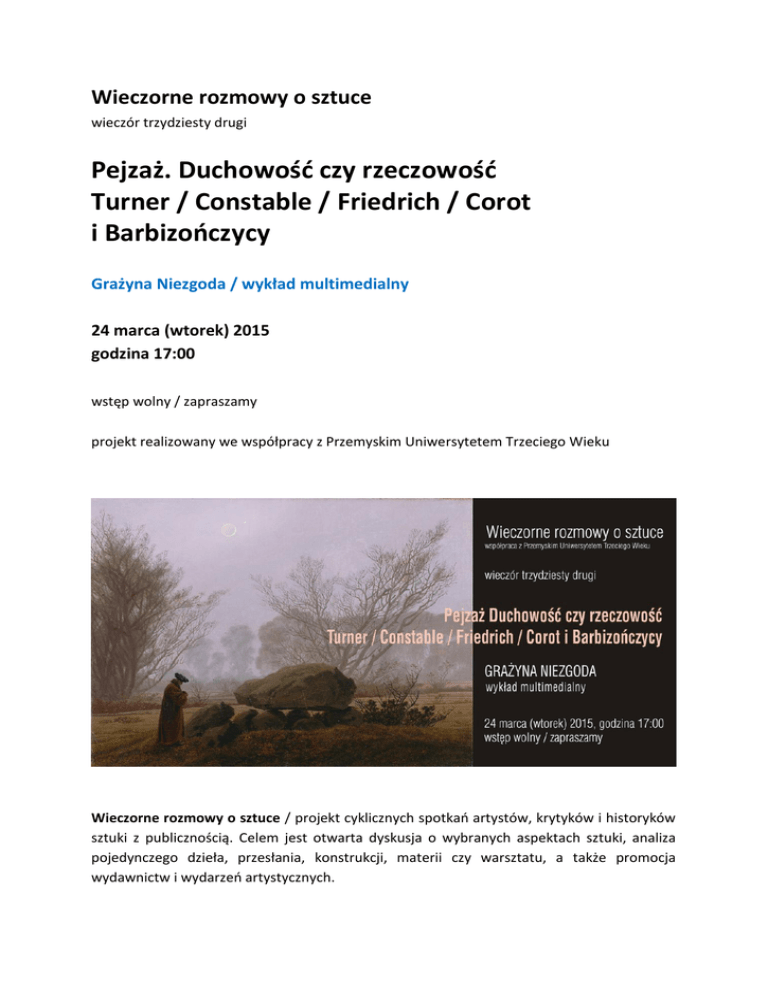 Wieczorne rozmowy o sztuce wieczór trzydziesty drugi Pejzaż. Duchowość czy rzeczowość Turner / Constable / Friedrich / Corot i Barbizończycy Grażyna Niezgoda / wykład multimedialny 24 marca (wtorek) 2015 godzina 17:00 wstęp wolny / zapraszamy projekt realizowany we współpracy z Przemyskim Uniwersytetem Trzeciego Wieku Wieczorne rozmowy o sztuce / projekt cyklicznych spotkań artystów, krytyków i historyków sztuki z publicznością. Celem jest otwarta dyskusja o wybranych aspektach sztuki, analiza pojedynczego dzieła, przesłania, konstrukcji, materii czy warsztatu, a także promocja wydawnictw i wydarzeń artystycznych. Pejzaż jako temat malarski zyskał autonomię u progu XIX wieku. Jest tematem "wzniosłym", lub "przyjemnym", "poetycznym" lub "trywialnie prostym", może też być wyrażeniem boskiej obecności. Na płótnach rozpętują się żywioły i heroicznie walczymy o przetrwanie lub w ciszy i medytując czekamy na wschód księżyca. W obliczu natury człowiek sprowadzony jest do niewielkiej sylwetki lub jako odwrócony do nas tyłem obserwator zachęca do wniknięcia w rzeczywistość obrazu. Stoimy jednak nie tylko przed wyobrażeniem natury, stoimy także u progu nowej epoki w sztuce. Zaczyna się nowoczesność, rzeczowe badanie świata i ludzkiej duchowości. O oślepiającym blasku słońca i mroku nocy, o mgle i burzy śnieżnej, ogniu i lodzie, księżycu, chmurach, wietrze, dębach i cmentarzach, o łąkach i morzach - opowiem, zapraszam Grażyna Niezgoda * Grażyna Niezgoda / fotografka, antykwariuszka, galerzystka, krytyczka sztuki, rzeczoznawczyni Ministra Kultury w specjalizacji: ocena i wycena dzieła sztuki; biegła sądowa z zakresu sztuki i antyków. Zorganizowała 22 wystawy indywidualne fotografii. W 2007 roku odbyła się wystawa "Twarze między wierszami, książki ilustrowane fotografiami Grażyny Niezgody". W roku 2010 wraz z Kazimierzem Wiśniakiem opublikowała album "Narodziny obrazu". Jej prace prezentowano m.in. w albumach "Sztuka fotografii", "Fotografowie", "Mistrzowie polskiego pejzażu". ZAPRASZAMY www.bwaprzemysl.pl