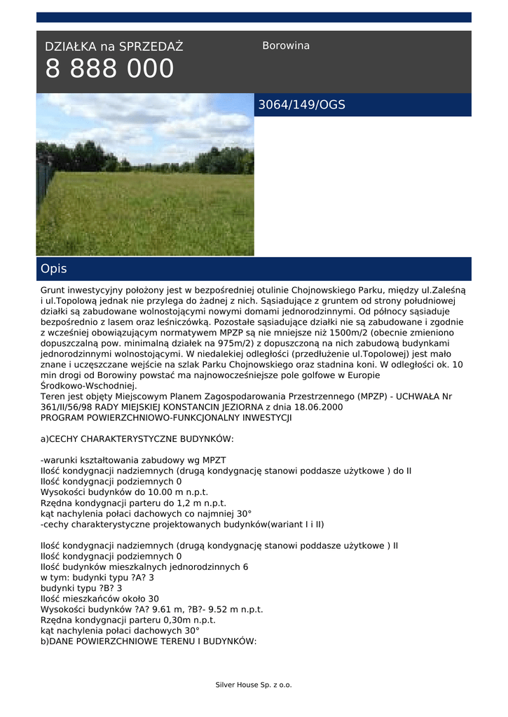 Borowina DZIAŁKA na SPRZEDAŻ 8 888 000 3064/149/OGS Opis Grunt inwestycyjny położony jest w bezpośredniej otulinie Chojnowskiego Parku, między ul.Zaleśną i ul.Topolową jednak nie przylega do żadnej z nich. Sąsiadujące z gruntem od strony południowej działki są zabudowane wolnostojącymi nowymi domami jednorodzinnymi. Od północy sąsiaduje bezpośrednio z lasem oraz leśniczówką. Pozostałe sąsiadujące działki nie są zabudowane i zgodnie z wcześniej obowiązującym normatywem MPZP są nie mniejsze niż 1500m/2 (obecnie zmieniono dopuszczalną pow. minimalną działek na 975m/2) z dopuszczoną na nich zabudową budynkami jednorodzinnymi wolnostojącymi. W niedalekiej odległości (przedłużenie ul.Topolowej) jest mało znane i uczęszczane wejście na szlak Parku Chojnowskiego oraz stadnina koni. W odległości ok. 10 min drogi od Borowiny powstać ma najnowocześniejsze pole golfowe w Europie Środkowo-Wschodniej. Teren jest objęty Miejscowym Planem Zagospodarowania Przestrzennego (MPZP) - UCHWAŁA Nr 361/II/56/98 RADY MIEJSKIEJ KONSTANCIN JEZIORNA z dnia 18.06.2000 PROGRAM POWIERZCHNIOWO-FUNKCJONALNY INWESTYCJI a)CECHY CHARAKTERYSTYCZNE BUDYNKÓW: -warunki kształtowania zabudowy wg MPZT Ilość kondygnacji nadziemnych (drugą kondygnację stanowi poddasze użytkowe ) do II Ilość kondygnacji podziemnych 0 Wysokości budynków do 10.00 m n.p.t. Rzędna kondygnacji parteru do 1,2 m n.p.t. kąt nachylenia połaci dachowych co najmniej 30° -cechy charakterystyczne projektowanych budynków(wariant I i II) Ilość kondygnacji nadziemnych (drugą kondygnację stanowi poddasze użytkowe ) II Ilość kondygnacji podziemnych 0 Ilość budynków mieszkalnych jednorodzinnych 6 w tym: budynki typu ?A? 3 budynki typu ?B? 3 Ilość mieszkańców około 30 Wysokości budynków ?A? 9.61 m, ?B?- 9.52 m n.p.t. Rzędna kondygnacji parteru 0,30m n.p.t. kąt nachylenia połaci dachowych 30° b)DANE POWIERZCHNIOWE TERENU I BUDYNKÓW: Silver House Sp. z o.o. UWAGA Bilans powierzchni terenu, który przedstawiono w dwóch wariantach, odnosi się do całej działki oznaczonej literami A-B-C-D-A. -warunki kształtowania zabudowy wg MPZT(maksymalne pow. i współczynniki) powierzchnia terenu oznaczonego literami A-B-C-D-A = 20155 m? Pow. Zabudowy = 1394,02 m? Pow. użytkowa = 2403,48 m? Pow. utwardzona(dojścia, dojazdy, tarasy) = 1629,23 m? Pow. dojazdów indywidual. i dróg dojazdowych z siatką AREAL = 906,48 m? (nie wliczane do powierzchni utwardzonej) Powierzchnia zieleni na terenie objętym inwestycją = 17455.54 m2 Powierzchnia terenu czynna biologicznie = min 85% Współczynnik intensywności zabudowy = max 1,5 -projektowane dane powierzchniowe terenu- WARIANT I powierzchnia terenu oznaczonego literami A-B-C-D-A = 20155 m? Pow. Zabudowy = 1496,13 m? Pow. użytkowa = 2540,46 m? Pow. utwardzona(dojścia, dojazdy, tarasy) = 1203,33 m? Pow. dojazdów indywidual. i dróg dojazdowych z siatką AREAL = 906,48 m? (nie wliczane do powierzchni utwardzonej) Powierzchnia zieleni na terenie objętym inwestycją = 17455.54 m2 Powierzchnia terenu czynna biologicznie (liczona zgodnie z warunkami zawartymi w MPZP) 17455,54 m2 co stanowi 86.61 % powierzchni terenu objętego inwestycją. Współczynnik intensywności zabudowy (liczony zgodnie z warunkami zawartymi w MPZP) wynosi 0,158 -projektowane dane powierzchniowe terenu- WARIANT II powierzchnia terenu oznaczonego literami A-B-C-D-A = 20155 m? Pow. Zabudowy = 1796 m? Pow. użytkowa = 3000 m? Pow. utwardzona(dojścia, dojazdy, tarasy) = 1203,33 m? Pow. dojazdów indywidual. i dróg dojazdowych z siatką AREAL = 906,48 m? (nie wliczane do powierzchni utwardzonej) Powierzchnia zieleni na terenie objętym inwestycją = 17155.67 m2 Powierzchnia terenu czynna biologicznie (liczona zgodnie z warunkami zawartymi w MPZP) 17455,54 m2 co stanowi 85.12 % powierzchni terenu objętego inwestycją. Współczynnik intensywności zabudowy (liczony zgodnie z warunkami zawartymi w MPZP) wynosi 0,188 *Informacje zawarte w opisie nieruchomości nie stanowią oferty w rozumieniu Kodeksu Cywilnego. Dążymy do tego, aby informacje zawarte w opisach oferowanych przez nas nieruchomości były możliwie dokładne, kompletne i aktualne. Z uwagi jednak na fakt, iż czasami pochodzą one od osób trzecich i część z nich nie zawsze daje się zweryfikować, Silver House Sp. z o.o. nie ponosi odpowiedzialności za ich dokładność, kompletność i aktualność. Silver House Sp. z o.o. tel. 22 319 8000 email: [email protected] Silver House Sp. z o.o. Powered by TCPDF (www.tcpdf.org)