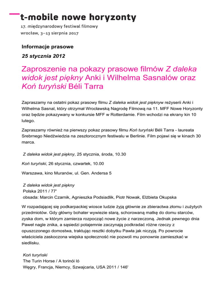 Informacje prasowe 25 stycznia 2012 Zaproszenie na pokazy prasowe filmów Z daleka widok jest piękny Anki i Wilhelma Sasnalów oraz Koń turyński Béli Tarra Zapraszamy na ostatni pokaz prasowy filmu Z daleka widok jest pięknyw reżyserii Anki i Wilhelma Sasnal, który otrzymał Wrocławską Nagrodę Filmową na 11. MFF Nowe Horyzonty oraz będzie pokazywany w konkursie MFF w Rotterdamie. Film wchodzi na ekrany kin 10 lutego. Zapraszamy również na pierwszy pokaz prasowy filmu Koń turyński Béli Tarra - laureata Srebrnego Niedźwiedzia na zeszłorocznym festiwalu w Berlinie. Film pojawi się w kinach 30 marca. Z daleka widok jest piękny, 25 stycznia, środa, 10.30 Koń turyński, 26 stycznia, czwartek, 10.00 Warszawa, kino Muranów, ul. Gen. Andersa 5 Z daleka widok jest piękny Polska 2011 / 77' obsada: Marcin Czarnik, Agnieszka Podsiadlik, Piotr Nowak, Elżbieta Okupska W rozpadającej się podkarpackiej wiosce ludzie żyją głównie ze zbieractwa złomu i zużytych przedmiotów. Gdy główny bohater wywiezie starą, schorowaną matkę do domu starców, zyska dom, w którym zamierza rozpocząć nowe życie z narzeczoną. Jednak pewnego dnia Paweł nagle znika, a sąsiedzi potajemnie zaczynają podkradać różne rzeczy z opuszczonego domostwa, traktując resztki dobytku Pawła jak niczyją. Po powrocie właściciela zaskoczona wiejska społeczność nie pozwoli mu ponownie zamieszkać w siedlisku. Koń turyński The Turin Horse / A torinói ló Węgry, Francja, Niemcy, Szwajcaria, USA 2011 / 146' obsada: János Derzsi, Erika Bók, Mihály Kormos Utrzymany w mrocznej atmosferze, film jest refleksją nad rozpadem świata. Autorem scenariusza został jak zwykle współpracownik i przyjaciel Tarra, pisarz, autor Szatańskiego tanga - László Krasznahorkai. Punktem wyjścia Konia turyńskiego jest anegdota o Fryderyku Nietzschem, który w 1889 roku pochylił się nad losem konia bitego przez chłopa przy drodze. Filozof obejmuje zwierzę za szyję i płacząc, popada w obłęd, który na zawsze oddzieli go od świata. Tarr i Krasznahorkai podkreślają, że to właśnie Nietzsche był dla nich źródłem inspiracji. W swym dziele Tarr zawarł wszystko, co zawsze składało się na jego charakterystyczny styl: niechęć do słów, czarno-biały obraz, powolne tempo. Akcja rozgrywa się w ciągu sześciu dni w ciemnej, wiejskiej chacie, a całość układa się w spójną, przytłaczającą wizję końca świata. Materiały graficzne do filmów oraz pressbooki znajdują się pod adresem: ftp://nowehoryzonty.pl login i hasło: press Kontakt dla mediów: Marcin Pieńkowski, [email protected]