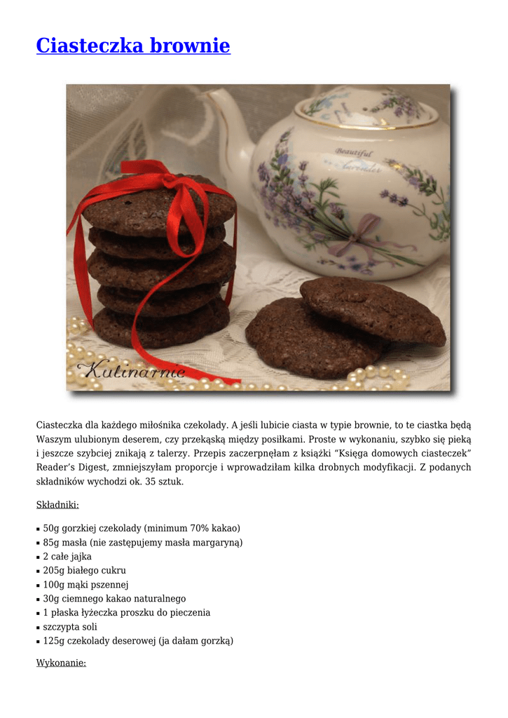 Ciasteczka brownie Ciasteczka dla każdego miłośnika czekolady. A jeśli lubicie ciasta w typie brownie, to te ciastka będą Waszym ulubionym deserem, czy przekąską między posiłkami. Proste w wykonaniu, szybko się pieką i jeszcze szybciej znikają z talerzy. Przepis zaczerpnęłam z książki “Księga domowych ciasteczek” Reader’s Digest, zmniejszyłam proporcje i wprowadziłam kilka drobnych modyfikacji. Z podanych składników wychodzi ok. 35 sztuk. Składniki: ■ ■ ■ ■ ■ ■ ■ ■ ■ 50g gorzkiej czekolady (minimum 70% kakao) 85g masła (nie zastępujemy masła margaryną) 2 całe jajka 205g białego cukru 100g mąki pszennej 30g ciemnego kakao naturalnego 1 płaska łyżeczka proszku do pieczenia szczypta soli 125g czekolady deserowej (ja dałam gorzką) Wykonanie: 1. Gorzką czekoladę (70% kakao) rozpuszczamy w kąpieli wodnej z dodatkiem masła. Dobrze mieszamy i odstawiamy do ostygnięcia. 2. Jajka ucieramy z cukrem na puszystą masę. 3. Do miski wsypujemy mąkę, kakao, proszek do pieczenia oraz sól i mieszamy. 4. 125g gorzkiej czekolady siekamy na drobno lub rozdrabniamy blenderem. 5. Do masy jajecznej wlewamy roztopioną czekoladę z masłem i dobrze mieszamy. 6. Stopniowo wsypujemy mieszankę mąki i kakao, delikatnie łączymy. 7. Do masy wsypujemy posiekaną czekoladę, dobrze mieszamy, po czym przykrywamy ściereczką i wstawiamy na godzinę do lodówki. 8. Blachy wykładamy papierem do pieczenia. Na blachę wykładamy kleksy ciasta, najwygodniej dużą łyżką (można sobie pomóc małą). Pomiędzy kleksami zachowujemy odstępy około 5cm. 9. Ciasteczka pieczemy w temperaturze ok. 180 stopni Celsjusza, przez około 10 minut, do chwili, kiedy upieką się na brzegach, a na środkach zaczną pękać. Nie trzymamy ich w piekarniku za długo, bo za mocno wyschną. 10. Po upieczeniu zostawiamy ciasteczka na blaszce przez 2-3 minuty, po czym przekładamy je na kratkę, by wystygły. 11. Na koniec można ciastka ozdobić roztopioną czekoladą, ale nie jest to konieczne. Nam bardzo smakowały również bez tego.