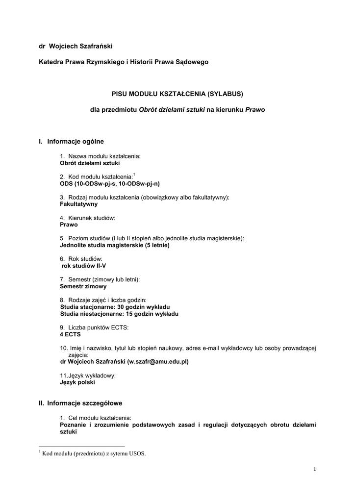 dr Wojciech Szafrański Katedra Prawa Rzymskiego i Historii Prawa Sądowego PISU MODUŁU KSZTAŁCENIA (SYLABUS) dla przedmiotu Obrót dziełami sztuki na kierunku Prawo I. Informacje ogólne 1. Nazwa modułu kształcenia: Obrót dziełami sztuki 1 2. Kod modułu kształcenia: ODS (10-ODSw-pj-s, 10-ODSw-pj-n) 3. Rodzaj modułu kształcenia (obowiązkowy albo fakultatywny): Fakultatywny 4. Kierunek studiów: Prawo 5. Poziom studiów (I lub II stopień albo jednolite studia magisterskie): Jednolite studia magisterskie (5 letnie) 6. Rok studiów: rok studiów II-V 7. Semestr (zimowy lub letni): Semestr zimowy 8. Rodzaje zajęć i liczba godzin: Studia stacjonarne: 30 godzin wykładu Studia niestacjonarne: 15 godzin wykładu 9. Liczba punktów ECTS: 4 ECTS 10. Imię i nazwisko, tytuł lub stopień naukowy, adres e-mail wykładowcy lub osoby prowadzącej zajęcia: dr Wojciech Szafrański ([email protected]) 11. Język wykładowy: Język polski II. Informacje szczegółowe 1. Cel modułu kształcenia: Poznanie i zrozumienie podstawowych zasad i regulacji dotyczących obrotu dziełami sztuki 1 Kod modułu (przedmiotu) z sytemu USOS. 1 Wymagania wstępne w zakresie wiedzy, umiejętności oraz kompetencji społecznych (jeśli obowiązują): Wymagania wstępne w zakresie wiedzy są następujące: Zalecana podstawowa wiedza w zakresie rozumienia pojęcia prawa cywilnego i karnego oraz ekonomii odpowiadająca treści kształcenia modułów Prawo cywilne, Prawo karne, Ekonomia Brak szczególnych wymagań w zakresie umiejętności i kompetencji społecznych. 2. Efekty kształcenia w zakresie wiedzy, umiejętności oraz kompetencji społecznych dla modułu 2 3 kształcenia i odniesienie do efektów kształcenia dla kierunku studiów: Symbol efektów 4 kształcenia ODS_01 ODS_02 Odniesienie do efektów Po zakończeniu modułu (przedmiotu) i potwierdzeniu kształcenia dla kierunku osiągnięcia efektów kształcenia student: 5 studiów Ma pogłębioną wiedzę o teoretycznej istocie prawa, K_W03, K_U01, K_K01 a w szczególności o rodzajach, treści i funkcjach przepisów prawa i norm prawnych, jak równieŜ o pojęciach prawnych. Rozumie prawny kontekst otaczającej go rzeczywistości i potrafi analizować ją w oparciu o reguły prawniczego rozumowania i obowiązujące normy prawne. jest świadomym i kreatywnym uczestnikiem Ŝycia społecznego, jak równieŜ jest świadomy szczególnej roli prawa i prawnika w Ŝyciu społecznym i w funkcjonowania państwa Ma ogólną teoretyczna wiedzę z ekonomii, socjologii K_W17, K_U02, K_K01 ze szczególnym uwzględnieniem powiązania tych dyscyplin z prawem z uwagi na konieczność rozumienia mechanizmów funkcjonujących na rynku sztuki, potrafi wykorzystać swoją jest świadomym i kreatywnym uczestnikiem Ŝycia społecznego wiedzę prawniczą w Ŝyciu codziennym, ODS_03 Ma pogłębioną wiedzę o teoretycznej istocie obrotu K_W03, K_K07, K_U13 dziełami sztuki – z punktu widzenia przedmiotu i podmiotów funkcjonujących na rynku sztuki. Rozumie potrzebę permanentnego dokształcenia się w zakresie prawa i nauk prawnych. Ma zdolność dalszego kształcenia się w ramach podyplomowych i doktoranckich studiów z zakresu prawa. ODS_04 Ma rozszerzoną wiedzę o kształtowaniu się rodzimego i obcego prawa regulującego obrót dziełami sztuki ochrony zabytków w obszarze prawa administracyjnego. Potrafi zakwalifikować prawnie podstawowe zdarzenie faktyczne na podstawie obowiązującego prawa. Potrafi w podstawowym zakresie przedstawić sposoby prawnego rozwiązania konfliktu z zakresu administracyjnych K_W06, K_U05, K_K03 2 Zasadniczo naleŜy nawiązać do kierunkowych efektów kształcenia z zakresu wiedzy i umiejętności społecznych. Jednak nie naleŜy dzielić efektów kształcenia danego modułu na kategorie wiedzy, umiejętności i kompetencji społecznych. KaŜdy moduł (przedmiot) nie musi obejmować wszystkich trzech kategorii efektów kształcenia, ani teŜ kaŜdego efektu. Jeśli efektem kształcenia jest np. analiza wymagająca określonej wiedzy, to nie trzeba oddzielnie definiować efektów kształcenia w kategorii wiedzy. 3 Zaleca się, aby, w zaleŜności od modułu, liczba efektów kształcenia zawierała się w przedziale: 5-10. 4 Kod modułu kształcenia, np. PK_01 (PK-kod modułu „Prawo karne” w USOS). 5 Efekty kształcenia dla kierunku studiów Prawo (np. K_W01, K_U01,...), gdzie: W – wiedza; U – umiejętności; K – kompetencje społeczne (wyszczególnione tylko w symbolach kierunkowych efektów kształcenia); 01, 02…– numer efektu kształcenia. 2 aspektów obrotu dziełami sztuki ODS_05 Ma rozszerzoną wiedzę o kształtowaniu się rodzimego i obcego prawa regulującego obrót dziełami sztuki w obszarze prawa karnego. Potrafi zakwalifikować prawnie podstawowe zdarzenie faktyczne na podstawie obowiązującego prawa. Potrafi w podstawowym zakresie przedstawić sposoby prawnego rozwiązania konfliktu z zakresu prawnokarnych aspektów obrotu dziełami sztuki K_W06, K_U05, K_K03 ODS_06 Ma rozszerzoną wiedzę o kształtowaniu się rodzimego i obcego prawa regulującego obrót dziełami sztuki w obszarze prawa cywilnego. Potrafi zakwalifikować prawnie podstawowe zdarzenie faktyczne na podstawie obowiązującego prawa. Potrafi w podstawowym zakresie przedstawić sposoby prawnego rozwiązania konfliktu z zakresu cywilnoprawnych aspektów rynku sztuki Ma rozszerzoną wiedzę o kształtowaniu się regulacji rynku sztuki w obszarze prawa międzynarodowego i europejskiego. Ma rozszerzoną teoretyczną wiedzę o instytucjach i prawie Unii Europejskiej i wzajemnych relacjach pomiędzy prawem polskim i prawem Unii Europejskiej. Potrafi zakwalifikować prawnie podstawowe zdarzenie faktyczne na podstawie obowiązującego prawa. Potrafi w podstawowym zakresie przedstawić sposoby prawnego rozwiązania konfliktu z zakresu międzynarodowych i europejskich regulacji obrotu dziełami sztuki. Ma rozszerzoną wiedzę o sposobach odnajdowania podst