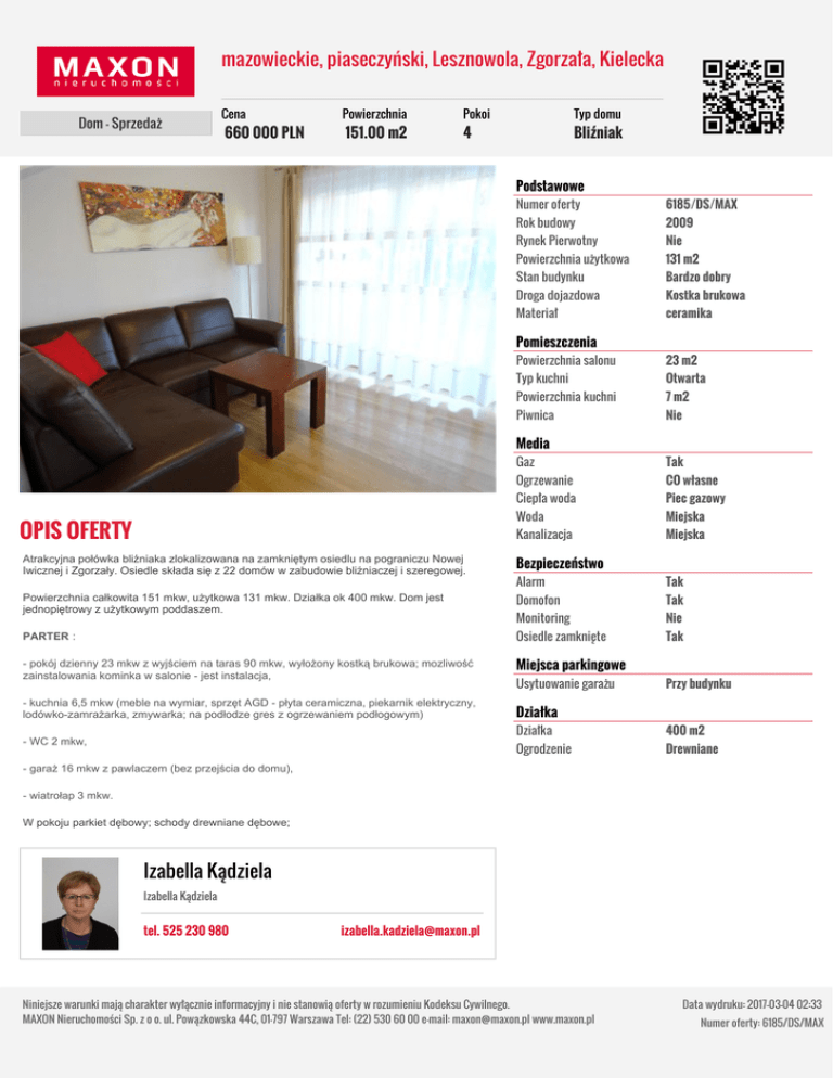 mazowieckie, piaseczyński, Lesznowola, Zgorzała, Kielecka Dom - Sprzedaż Cena 660 000 PLN Powierzchnia 151.00 m2 Pokoi Typ domu 4 Bliźniak Podstawowe Numer oferty 6185/DS/MAX Rok budowy 2009 Rynek Pierwotny Nie Powierzchnia użytkowa 131 m2 Stan budynku Bardzo dobry Droga dojazdowa Kostka brukowa Materiał ceramika Pomieszczenia Powierzchnia salonu 23 m2 Typ kuchni Otwarta Powierzchnia kuchni 7 m2 Piwnica Nie Media OPIS OFERTY Gaz Tak Ogrzewanie CO własne Ciepła woda Piec gazowy Woda Miejska Kanalizacja Miejska Atrakcyjna połówka bliźniaka zlokalizowana na zamkniętym osiedlu na pograniczu Nowej Iwicznej i Zgorzały. Osiedle składa się z 22 domów w zabudowie bliźniaczej i szeregowej. Bezpieczeństwo Alarm Tak Powierzchnia całkowita 151 mkw, użytkowa 131 mkw. Działka ok 400 mkw. Dom jest jednopiętrowy z użytkowym poddaszem. Domofon Tak Monitoring Nie PARTER : Osiedle zamknięte Tak - pokój dzienny 23 mkw z wyjściem na taras 90 mkw, wyłożony kostką brukowa; mozliwość zainstalowania kominka w salonie - jest instalacja, Miejsca parkingowe - kuchnia 6,5 mkw (meble na wymiar, sprzęt AGD - płyta ceramiczna, piekarnik elektryczny, lodówko-zamrażarka, zmywarka; na podłodze gres z ogrzewaniem podłogowym) Działka - WC 2 mkw, Usytuowanie garażu Przy budynku Działka 400 m2 Ogrodzenie Drewniane - garaż 16 mkw z pawlaczem (bez przejścia do domu), - wiatrołap 3 mkw. W pokoju parkiet dębowy; schody drewniane dębowe; Izabella Kądziela Izabella Kądziela tel. 525 230 980 [email protected] Niniejsze warunki mają charakter wyłącznie informacyjny i nie stanowią oferty w rozumieniu Kodeksu Cywilnego. MAXON Nieruchomości Sp. z o o. ul. Powązkowska 44C, 01-797 Warszawa Tel: (22) 530 60 00 e-mail: [email protected] www.maxon.pl Data wydruku: 2017-03-04 02:33 Numer oferty: 6185/DS/MAX