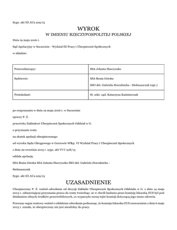 Sygn. akt III AUa 919/15 WYROK W IMIENIU RZECZYPOSPOLITEJ POLSKIEJ Dnia 19 maja 2016 r. Sąd Apelacyjny w Szczecinie - Wydział III Pracy i Ubezpieczeń Społecznych w składzie: Przewodniczący: SSA Jolanta Hawryszko Sędziowie: SSA Beata Górska SSO del. Gabriela Horodnicka - Stelmaszczuk (spr.) Protokolant: St. sekr. sąd. Katarzyna Kaźmierczak po rozpoznaniu w dniu 19 maja 2016 r. w Szczecinie sprawy P. Ż. przeciwko Zakładowi Ubezpieczeń Społecznych Oddział w G. o przyznanie renty na skutek apelacji ubezpieczonego od wyroku Sądu Okręgowego w Gorzowie Wlkp. VI Wydział Pracy i Ubezpieczeń Społecznych z dnia 29 września 2015 r. sygn. akt VI U 918/13 oddala apelację. SSA Beata Górska SSA Jolanta Hawryszko SSO del. Gabriela Horodnicka Stelmaszczuk Sygn. akt III AUa 919/15 UZASADNIENIE Ubezpieczony P. Ż. wniósł odwołanie od decyzji Zakładu Ubezpieczeń Społecznych Oddziału w G. z dnia 14 maja 2013 r. odmawiającej przyznania prawa do renty twierdząc, że w chwili badania przez komisję lekarską ZUS był pod działaniem silnych środków przeciwbólowych, co wypaczyło ocenę tejże komisji dotyczącą jego stanu zdrowia. Pozwany organ rentowy wniósł o oddalenie odwołania podnosząc, że komisja lekarska ZUS orzeczeniem z dnia 6 maja 2013 r. uznała, że ubezpieczony nie jest niezdolny do pracy. Wyrokiem z dnia 29 września 2015 roku Sąd Okręgowy w Gorzowie Wielkopolskim VI Wydział Sąd Pracy i Ubezpieczeń Społecznych oddalił odwołanie. Sąd Okręgowy oparł swoje rozstrzygnięcie na następujących ustaleniach faktycznych i rozważaniach prawnych: Ubezpieczony P. Ż. urodził się w dniu (...) Posiada on wykształcenie zawodowe w specjalności: stolarz budowlany. Dotychczas pracował w okresie od 3 listopada 1971 r. do 1 października1998 r. w różnych zakładach na stanowisku stolarza. Okresowo był zatrudniony jako krawiec po przyuczeniu stanowiskowym. W ramach tego zatrudnienia szył ocieplacze robocze. Nie kończył dodatkowych kursów zawodowych. W dniu 2 października 1998 r. ubezpieczony złożył w ZUS wniosek o przyznanie prawa do renty. Po otrzymaniu z ZUS decyzji odmownej z dnia 23 października 1998 r. odwołał się do Sądu Okręgowego - Sądu Pracy i Ubezpieczeń Społecznych w Gorzowie Wielkopolskim, który prawomocnym wyrokiem z dnia 12 kwietnia 2000 r. zmienił zaskarżoną decyzję i przyznał ubezpieczonemu prawo do renty z tytułu częściowej niezdolności do pracy na okres 2 lat od zaprzestania otrzymywania przez niego zasiłku chorobowego. Decyzją z dnia 22 sierpnia 2000 r. pozwany przyznał ubezpieczonemu prawo do renty począwszy od 23 lutego 1999 r. do 28 lutego 2001 r., a następnie decyzją z dnia 12 czerwca 2001 r. odmówił dalszej wypłaty renty. Odwołanie od tej decyzji oddalił Sąd Okręgowy - Sąd Pracy i Ubezpieczeń Społecznych w Gorzowie Wielkopolskim prawomocnym wyrokiem z dnia 8 października 2003 r. W dniu 13 marca 2013 r. ubezpieczony ponownie złożył w ZUS wniosek o przyznanie prawa do renty z tytułu niezdolności do pracy. Komisja lekarska ZUS w Z. orzeczeniem z dnia 6 maja 2013 r. ustaliła, że ubezpieczony nie jest niezdolny do pracy i w oparciu o to orzeczenie pozwany decyzją z dnia 14 maja 2013 r. odmówił przyznania ubezpieczonemu prawa do renty. Ubezpieczony w dniu 7 czerwca 2013 r. odwołał się do Sądu Okręgowego - Sądu Pracy i Ubezpieczeń Społecznych w Gorzowie Wielkopolskim. W trakcie postępowania Sąd Okręgowy dopuścił dowód z opinii biegłych z zakresu ortopedii, neurologii i medycyny pracy. Biegli rozpoznali u ubezpieczonego: • zespół bólowy, okresowy kręgosłupa szyjnego i lędźwiowo – krzyżowego bez cech podrażnienia obwodowego układu nerwowego, na podłożu zmian zwyrodnieniowo dyskopatycznych, • przebytą częściową amputację opuszka kciuka u osoby praworęcznej z zachowaną chwytnością obu rąk, • niedosłuch ucha prawego (z oprotezowaniem aparatem słuchowym) pozostający do oceny biegłego otolaryngologa, • otyłość W związku z powyższym rozpoznaniem biegli uznali, że ubezpieczony nie jest niezdolny do pracy, ale przeciwwskazana jest praca połączona z dźwiganiem ciężarów. Ubezpieczony nie zgodził się z opiniami twierdząc, że pracę dozorcy może wykonywać tylko po zaopatrzeniu w ortezę i gorset, a nadto występuje u niego wzmożona senność. Powołany przez Sąd Okręgowy inny biegły z zakresu medycyny pracy rozpoznał u ubezpieczonego: • przewlekły zespół bólowy odcinka lędźwiowego kręgosłupa na tle zmian zwyrodnieniowych i przepukliny na wysokości od L-l do L-5 i L-5/S-1 z promieniowaniem bólu do kończyny dolnej prawej, • zmiany zwyrodnieniowo-wytwórcze odcinka szyjnego kręgosłupa z zespołem bólowym, • niedosłuch odbiorczy obustronny asymetryczny (bardziej ucha prawego) z oprotezowaniem aparatem słuchowym, • otyłość prostą miernego stopnia, • obturacyjny bezdech senny - postać ciężka Na podstawie powyższego rozpoznania lekarz medycyny pracy uznał, że ubezpieczony jest częściowo niezdolny do pracy od kwietnia 2014 r. na okres 2 lat. W opinii uzupełniającej drugi biegły medycyny pracy podtrzymał swoją opinię o częściowej niezdolności ubezpieczonego do pracy i potwierdził, że obturacyjny bezdech senny w ciężkiej postaci rozpoznano u ubezpieczonego w lutym 2014 r. Postanowieniem z dnia 28 sierpnia 2015 r. Sąd Okręgowy dopuścił dowód z opinii innego zespołu biegłych z zakresu ortopedii, neurologii, kardiologii, laryngologii i medycyny pracy. Biegły kardiolog rozpoznał u ubezpieczonego: - zespół bezdechu śródsennego – postać ciężką, - niedosłuch, - chorobę zwyrodnieniowo – zniekształcającą kręgosłupa, - nadciśnienie tętnicze w wywiadzie, - otyłość pokarmową - i stwierdził, że ubezpieczony jest częściowo niezdolny do pracy oraz, że podziela opinię drugiego biegłego z zakresu medycyny pracy. Biegli ortopeda i neurolog po przebadaniu ubezpieczone