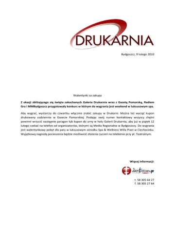 Bydgoszcz, 9 lutego 2010 Walentynki za zakupy Z okazji zbliżającego się święta zakochanych Galeria Drukarnia wraz z Gazetą Pomorską, Radiem Gra i MMBydgoszcz przygotowały konkurs w którym do wygrania jest weekend w luksusowym spa. spa Aby wygrać, wystarczy do czwartku włącznie zrobić zakupy w Drukarni. Drukarni Można też wyciąć kupon drukowany codziennie w Gazecie Pomorskiej. Podając swój numer kontaktowy wszyscy chętni powinni wrzucić następnie paragon lub kupon do urny w holu Galerii Drukarnia, Drukarnia, aby już w piątek 12 lutego czekać na telefon od organizatorów, którymi są Media Regionalne w Bydgoszczy. Do wygrania jest walentynkowy pobyt dla pary w luksusowym ośrodku Spa & Wellness Willa Piast w Ciechocinku. Wyjątkową nagrodą pocieszenia będzie możliwość złożenia złożenia życzeń na telebimie przy pl. Teatralnym. Więcej informacji: t. 58 305 64 27 f. 58 305 27 64