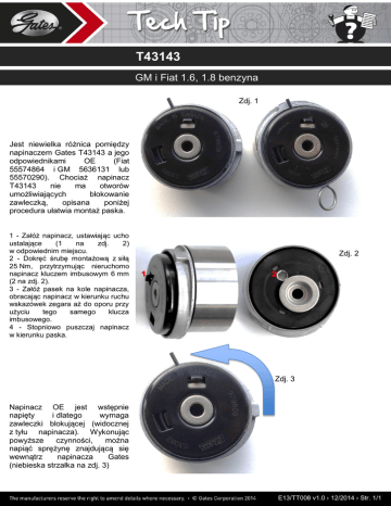T43143 GM i Fiat 1.6, 1.8 benzyna Zdj. 1 Jest niewielka różnica pomiędzy napinaczem Gates T43143 a jego odpowiednikami OE (Fiat 55574864 i GM 5636131 lub 55570290). Chociaż napinacz T43143 nie ma otworów umożliwiających blokowanie zawleczką, opisana poniżej procedura ułatwia montaż paska. 1 - Załóż napinacz, ustawiając ucho ustalające (1 na zdj. 2) w odpowiednim miejscu. 2 - Dokręć śrubę montażową z siłą 25 Nm, przytrzymując nieruchomo napinacz kluczem imbusowym 6 mm (2 na zdj. 2). 3 - Załóż pasek na kole napinacza, obracając napinacz w kierunku ruchu wskazówek zegara aż do oporu przy użyciu tego samego klucza imbusowego. 4 - Stopniowo puszczaj napinacz w kierunku paska. Zdj. 2 1 2 Zdj. 3 Napinacz OE jest wstępnie napięty i dlatego wymaga zawleczki blokującej (widocznej z tyłu napinacza). Wykonując powyższe czynności, można napiąć sprężynę znajdującą się wewnątrz napinacza Gates (niebieska strzałka na zdj. 3) E13/TT008 v1.0 › 12/2014 › Str. 1/1