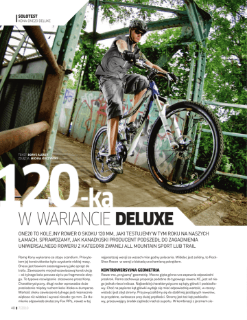 solotest Kona One20 Deluxe Tekst: Borys Aleksy, Zdjęcia: michał kuczyński w wariancie Deluxe One20 to kolejny rower o skoku 120 mm, jaki testujemy w tym roku na naszych łamach. Sprawdzamy, jak kanadyjski producent podszedł do zagadnienia uniwersalnego roweru z kategorii zwanej all mountain sport lub trail Ramę Kony wykonano ze stopu scandium. Priorytetem jej konstruktorów było uzyskanie niskiej masy, One20 jest bowiem zaszeregowany jako sprzęt do trailu. Zawieszenie ma jednozawiasową konstrukcję – oś tylnego koła porusza się tu po fragmencie okręgu. To typowe rozwiązanie stosowane przez Konę. Charakterystyczny, długi rocker wprowadza duże przełożenie między ruchem koła i tłoka w dumperze. Wartość skoku zawieszenia tylnego jest nieznacznie większa niż widelca i wynosi niecałe 130 mm. Za tłumienie odpowiada skuteczny Fox RP2, nawet w tej 40 7/2010 najprostszej wersji ze wszech miar godny polecenia. Widelec jest solidny, to RockShox Recon w wersji z blokadą uruchamianą pokrętłem. Kontrowersyjna geometria Rower ma „przyjazną” geometrię. Mocno gięta górna rura zapewnia odpowiedni przekrok. Rama zachowuje proporcje podobne do typowego roweru XC, jest od niego jednak nieco krótsza. Najbardziej charakterystyczne są kąty główki i podsiodłowy. Choć na papierze kąt główki wydaje się mieć odpowiednią wartość, w rzeczywistości jest zbyt stromy. Przyzwyczailiśmy się do stabilniej jeżdżących rowerów, to przydatne, zwłaszcza przy dużej prędkości. Stromy jest też kąt podsiodłowy, przesuwający środek ciężkości nad oś suportu. W kombinacji z jarzmem sio- solotest Kona One20 Deluxe Charakterystyczny dla Kony fragment zawieszenia, tzw. „rocker”, do którego jest mocowany tłumik od góry dła, pozbawionym offsetu oraz charakterystycznym kształtem siodła WTB, daje to efekt bardzo „krótkiej”, przesuniętej na przód pozycji ciała. Testerzy odbierali to jako wadę One20. Niekorzystny efekt powinien zniknąć po zastosowaniu wspornika z mocniejszym odchyleniem do tyłu. Wyposażenie skromne Najbardziej kontrowersyjny element całego wyposażenia to sztyca podsiodłowa z jarzemkiem na wprost rury. Wolelibyśmy cofnięte Kupując Konę One20, płacimy przede wszystkim za ramę wykonaną z rzadkiego stopu. To jedyna konkluzja, do jakiej można dojść, odnotowawszy obecność napędu Deore i tanich hamulców. Najlepiej bronią się w tym zestawieniu koła Mavic Crossride z oponami Kendy, chociaż to też model budżetowy. Kręcimy nosem bez skrępowania, bo, przypomnijmy, Kona kosztuje 8499 złotych. Ładne są komponenty własne producenta, ale one ani nie podnoszą wartości roweru, ani nie obniżają masy. Całość waży 14 kg, a to całkiem sporo. Efektownie asymetryczny wahacz obniżono z prawej strony, by zapobiec uderzaniu przez łańcuch o ten fragment ramy ułatwiają podjeżdżanie, dzięki nim Kona odróżnia się od rowerów nastawionych wyłącznie na zjeżdżanie. Rama jest krótka, ciasno zakręca i łatwo wchodzi na koło, oczekiwalibyśmy za to większej stabilności w zakrętach i podczas szybkiej jazdy w dół. Pomóc mógłby widelec z większym skokiem. Wyposażenie jest bardzo podstawowe, a to rzutuje na wskazania wagi. n Skuteczne zawieszenie Kona jest znana z pięknie działających systemów zawieszenia, model One20 nie jest wyjątkiem. Rama ugina się z liniowo narastającym oporem, ruch jest dość mocno stłumiony nawet przy całkowitym odkręceniu pokrętła tłumienia na Fox’ie. Po odsunięciu siodła maksymalnie do tyłu uzyskaliśmy niezłe rozłożenie ciężaru na oba koła i wzajemnie dopasowaną pracę przedniego i tylnego zawieszenia. Amortyzator przedni wyraźnie jednak odbiega charakterem od pluszowo uginającej się ramy. Znów zachciało nam się czegoś dłuższego i liniowo uginającego, na myśl przychodził nam np. Manitou Minute. Kona wymusza krótką pozycję za kierownicą za sprawą „pionowego” ustawienia rury podsiodłowej Wyposażenie Zawieszenie, pochłaniające różnorodne nierówności, jest ważną zaletą Kony One20. Strome kąty ramy Cena: Rama ❘ zawieszenie: Widelec ❘ tłumik: Napęd: Hamulce: Koła ❘ Opony: Osprzęt: Masa: Rozmiary: 14/16/17/[18]/19/20/22’’ 8499 zł scandium, cieniowana ❘ jednozawiasowe, 127 mm RockShox Recon SL Solo Air, blokowany, 120 mm ❘ Fox Float RP2 manetki i przerzutki Shimano Deore M590 ❘ korba Shimano SLX M660, 44-32-22 z. ❘ kaseta SRAM PG970, 11-32 z., 9 b. ❘ łańcuch SRAM PC-971 Shimano M575, tarcze 160/180 mm Mavic Crossride ❘ Kenda Komodo 26x2.1’’ mostek Kona XC/BC ❘ kierownica Kona XC/BC, gięta, szerokość 620 mm ❘ sztyca Kona XC/BC; 31,8 mm ❘ siodło WTB Rocket V Comp ❘ stery TH zintegrowane ❘ pedały Shimano M540, zatrzaskowe 14 kg (bez pedałów) Dystrybutor: Kona Polska, tel. 22 837 18 06, konaworld.pl 120 mm 583 mm 74° 69° 425 mm 1109 mm 7/2010 41 solotest Author Era 3.0 Era all mountain Tekst: Borys Aleksy, Zdjęcia: Łukasz Szrubkowski Czy Author Era to rower do wszystkiego? Prawie. Oto jak ten trailowo-maratonowo-all mountainowy rower z Czech wypadł w naszym teście Era 3.0 to najwyższy model z tej serii rowerów marki Author. Ma 130 mm skoku, zawieszenie z Horst-linkiem i ciekawy zestaw osprzętu. Jako rower z natury uniwersalny łączy crosscountrową geometrię z niemałym skokiem i sztywną osią z przodu. Uniwersalny i zwrotny Era ma geometrię umożliwiającą sprawne podjeżdżanie. Wyciągnięta do przodu pozycja, dobre ułożenie ciała względem korb i równomiernie rozłożony nacisk na koła sprawiają, że można poczuć się na Erze jak na dobrym rowerze do maratonów MTB. Sterowanie przednim kołem wymaga pewnego trzymania kierownicy, bo rower szybko skręca i jest lekko nadsterowny. Na zjazdach z dużą prędkością zachowuje się jednak wy- 42 7/2010 starczająco przewidywalnie. Era łatwo poddaje się sygnałom wysyłanym przez całe ciało, ogólnie kontrola n