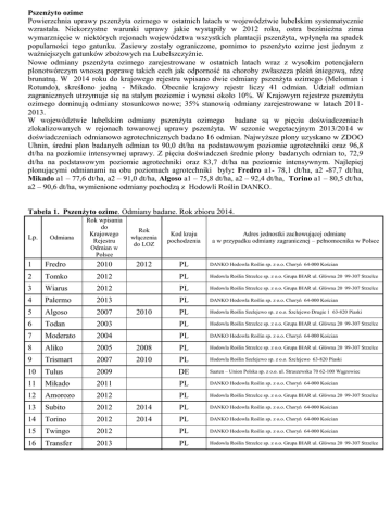 Pszenżyto ozime Powierzchnia uprawy pszenżyta ozimego w ostatnich latach w województwie lubelskim systematycznie wzrastała. Niekorzystne warunki uprawy jakie wystąpiły w 2012 roku, ostra bezśnieżna zima wymarznięcie w niektórych rejonach województwa wszystkich plantacji pszenżyta, wpłynęła na spadek popularności tego gatunku. Zasiewy zostały ograniczone, pomimo to pszenżyto ozime jest jednym z ważniejszych gatunków zbożowych na Lubelszczyźnie. Nowe odmiany pszenżyta ozimego zarejestrowane w ostatnich latach wraz z wysokim potencjałem plonotwórczym wnoszą poprawę takich cech jak odporność na choroby zwłaszcza pleśń śniegową, rdzę brunatną. W 2014 roku do krajowego rejestru wpisano dwie odmiany pszenżyta ozimego (Meloman i Rotundo), skreślono jedną - Mikado. Obecnie krajowy rejestr liczy 41 odmian. Udział odmian zagranicznych utrzymuje się na stałym poziomie i wynosi około 10%. W Krajowym rejestrze pszenżyta ozimego dominują odmiany stosunkowo nowe; 35% stanowią odmiany zarejestrowane w latach 20112013. W województwie lubelskim odmiany pszenżyta ozimego badane są w pięciu doświadczeniach zlokalizowanych w rejonach towarowej uprawy pszenżyta. W sezonie wegetacyjnym 2013/2014 w doświadczeniach odmianowo agrotechnicznych badano 16 odmian. Najwyższe plony uzyskano w ZDOO Uhnin, średni plon badanych odmian to 90,0 dt/ha na podstawowym poziomie agrotechniki oraz 96,8 dt/ha na poziomie intensywnej uprawy. Z pięciu doświadczeń średnie plony badanych odmian to, 72,9 dt/ha na podstawowym poziomie agrotechniki oraz 83,7 dt/ha na poziomie intensywnym. Najlepiej plonującymi odmianami na obu poziomach agrotechniki były: Fredro a1- 78,1 dt/ha, a2 -87,7 dt/ha, Mikado a1 – 77,6 dt/ha, a2 – 91,0 dt/ha, Algoso a1 – 75,8 dt/ha, a2 – 92,4 dt/ha, Torino a1 – 80,5 dt/ha, a2 – 90,6 dt/ha, wymienione odmiany pochodzą z Hodowli Roślin DANKO. Tabela 1. Pszenżyto ozime. Odmiany badane. Rok zbioru 2014. Lp. Odmiana Rok wpisania do Krajowego Rejestru Odmian w Polsce Rok włączenia do LOZ Kod kraju pochodzenia 2012 PL DANKO Hodowla Roślin sp. z o.o. Choryń 64-000 Kościan Adres jednostki zachowującej odmianę a w przypadku odmiany zagranicznej – pełnomocnika w Polsce 1 Fredro 2010 2 Tomko 2012 PL Hodowla Roślin Strzelce sp. z o.o. Grupa IHAR ul. Główna 20 99-307 Strzelce 3 Wiarus 2012 PL Hodowla Roślin Strzelce sp. z o.o. Grupa IHAR ul. Główna 20 99-307 Strzelce 4 Palermo 2013 PL DANKO Hodowla Roślin sp. z o.o. Choryń 64-000 Kościan 5 Algoso 2007 PL Hodowla Roślin Szelejewo sp. z o.o. Szelejewo Drugie 1 63-820 Piaski 6 Todan 2003 PL Hodowla Roślin Strzelce sp. z o.o. Grupa IHAR ul. Główna 20 99-307 Strzelce 7 Moderato 2004 PL DANKO Hodowla Roślin sp. z o.o. Choryń 64-000 Kościan 8 Aliko 2005 2008 PL Hodowla Roślin Strzelce sp. z o.o. Grupa IHAR ul. Główna 20 99-307 Strzelce 9 Trismart 2007 2010 PL Hodowla Roślin Szelejewo sp. z o.o. Szelejewo 63-820 Piaski 10 Tulus 2009 DE Saaten – Union Polska sp. z o.o. ul. Straszewska 70 62-100 Wągrowiec 11 Mikado 2011 PL DANKO Hodowla Roślin sp. z o.o. Choryń 64-000 Kościan 12 Amorozo 2012 PL Hodowla Roślin Strzelce sp. z o.o. Grupa IHAR ul. Główna 20 99-307 Strzelce 13 Subito 2012 2014 PL DANKO Hodowla Roślin sp. z o.o. Choryń 64-000 Kościan 14 Torino 2012 2014 PL DANKO Hodowla Roślin sp. z o.o. Choryń 64-000 Kościan 15 Twingo 2012 PL DANKO Hodowla Roślin sp. z o.o. Choryń 64-000 Kościan 16 Transfer 2013 PL Hodowla Roślin Strzelce sp. z o.o. Grupa IHAR ul. Główna 20 99-307 Strzelce 2010 Tabela 2. Pszenżyto ozime. Warunki polowe doświadczeń. Rok zbioru 2014. ZDOO Bezek Miejscowość Powiat Kompleks rolniczej przydatności gleby Klasa bonitacyjna gleby pH gleby w KCL Przedplon Data siewu Obsada nasion ( szt/m2 ) Data zbioru N na poziomie a1 (kg/ha) N na poziomie a2 (kg/ha) P 2O 5 (kg/ha) K 2O (kg/ha) Nawożenie dolistne preparatami wieloskładnikowymi na poziomie a2 (l/ha) SDOO Cicibór chełmski ZDOO Czesławice SHR Palikije puławski lubelski pszenny b. dobry pszenny dobry II 6,5 gorczyca 25.09 400 28.08 II 6,73 rzepak ozimy 24.09 400 30.07 70 110 40 75 75 115 60 90 Basfoliar 36 Extra 11,0L Basfoliar 36 Extra 11,0L ADOB Cu, Mn 9,0 L ZDOO Uhnin bialski parczewski żytni bardzo żytni bardzo dobry dobry IIIb IV a 6,14 5,57 rzepak ozimy rzepak jary 01.10 25.09 400 400 30.07 31.07 Nawożenie mineralne 95 98 135 138 40 60 60 90 pszenny wadliwy III b 7,2 rzepak ozimy 27.09 400 30.07 88 128 60 90 Basfoliar 36 Extra 11,0L Basfoliar 36 Extra 11,0L Środki ochrony roślin Funaben T Kinto Duo 080 Fs Lamandor FLO 500 SC + Peridiam Ferti Funaben T Kinto Duo 080 Fs Herbicyd (nazwa,dawka/ha) Rubin SX 50 SG – 150g Axial 100 EC 0,3L + Adigor 440 EC 0,9L + Glean 75 WG 25g Snajper 600 SC + Lentipur Flo 500 SC + Glean 75 WG 1,0 L+ 1,0 L+ 10g Linter 70 WG 3,0L Starane 250 EC + Chwastox extra 0,5+3,0L Maraton 375 SC 4,0 L Insektycyd BI 58 Nowy –0,5 L nie stosowano nie stosowano nie stosowano BI 58 Nowy – 0,5 L Zaprawa nasienna (nazwa) (nazwa,dawka/ha) (tylko na poziomie a2 ) Fungicyd -pierwszy zabieg (nazwa,dawka/ha) Fungicyd -drugi zabieg (nazwa,dawka/ha) Regulator wzrostu (nazwa,dawka/ha) Wirtuoz 520 EC 1,0 L Wirtuoz 520 EC 1,0 L Wirtuoz 520 EC 1,0 L Wirtuoz 520 EC 1,0 L Leander 750 EC Reveller 280 SC 1,0 L Reveller 280 SC 1,0 L Reveller 280 SC 1,0 L Reveller 280 SC 1,0 L Gwarant 500 SC + Tebu 250 EW 1,0+0,6 L Antywylegacz Płynny 675 SL 2,0 L Cerone 480 SL 1,0L Cerone 480 SL 1,0L Antywylegacz Płynny 675 SL 1,5 L Stabilan 750 SL – 1,0 L Tabela 3. Pszenżyto ozime. Wyniki ogólne doświadczeń. Rok zbioru 2014. Lp. Cecha ZDOO Bezek a1 SDOO Cicibór a2 a1 Stan roślin p-d zimą(skala9o) Stan roślin po zimie(skala9o) Martwe rośliny (%) Termin kłoszenia(dzień, mc) Termin dojrzałości woskowej (dzień, m-c) Wysokość roślin (cm) 105,0 95,0 131,6 7 Wyleganie roślin w fazie dojrzałości mlecznej (skala 9o) 9,0 9,0 8 Wyleganie roślin przed zbiorem (skala 9o) 9,0 9,0