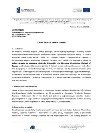 Projekt „Rozwój potencjału Szkoły Wyższej Psychologii Społecznej poprzez dostosowanie oferty edukacyjnej do potrzeb rynku pracy i gospodarki opartej na wiedzy” jest współfinansowany przez Unię Europejską w ramach Europejskiego Funduszu Społecznego Poznań, dnia 11.10.2011 r. Zamawiający Szkoła Wyższa Psychologii Społecznej ul. Chodakowska 19/31 03-815 Warszawa ZAPYTANIE OFERTOWE 1. Założenia W związku z realizacją projektu „Rozwój potencjału Szkoły Wyższej Psychologii Społecznej poprzez dostosowanie oferty edukacyjnej do potrzeb rynku pracy i gospodarki opartej na wiedzy”, w ramach Programu Operacyjnego Kapitał Ludzki, na podstawie umowy o dofinansowanie zawartej z Ministerstwem Nauki i Szkolnictwa Wyższego, zwracamy się z prośbą o przedstawienie oferty na zakup sprzętu do pracowni stolarsko-ślusarskiej dla kierunku Wzornictwo (School of Form), w zakresie przedstawionym w punkcie 4. Niniejszy projekt jest współfinansowany ze środków Unii Europejskiej w ramach Europejskiego Funduszu Społecznego. Nie dopuszcza się składania ofert częściowych. Zamawiający ma prawo odstąpienia od realizacji przedmiotowego Zapytania ofertowego, w przypadku nie otrzymania zgody z Ministerstwa Nauki i Szkolnictwa Wyższego na finansowanie przedmioty zamówienia. Zamawiający zastrzega sobie prawo do modyfikacji przedmiotu zamówienia oraz wzoru umowy. 2. Informacje o Zamawiającym Szkoła Wyższa Psychologii Społecznej to nowoczesne centrum naukowo-dydaktyczne, które oferuje interdyscyplinarne studia humanistyczne na 20 kierunkach: w Warszawie, Wrocławiu, Sopocie, Poznaniu i Katowicach. Od 14 lat Szkoła jest jednym z najważniejszych ośrodków studiów psychologicznych w kraju. Jest także najlepszą niepubliczną uczelnią humanistyczną w Polsce (Ranking Niepublicznych Uczelni Magisterskich 2009, „Perspektywy” i „Rzeczpospolita”). 3. Informacje o projekcie Projekt zakłada rozwój oferty dydaktycznej uczelni o 2 nowe kierunki studiów I stopnia (Wzornictwo, Grafika), wsparcie studentów i absolwentów na rynku pracy, rozszerzenie oferty o przedmioty realizowane w formie e-learningu, wsparcie dla osób niepełnosprawnych. Czas realizacji projektu: od Szkoła Wyższa Psychologii Społecznej ul. Chodakowska 19/31, 03-815 Warszawa tel. 022 517 96 00, faks 022 517 96 25 www.swps.pl Projekt „Rozwój potencjału Szkoły Wyższej Psychologii Społecznej poprzez dostosowanie oferty edukacyjnej do potrzeb rynku pracy i gospodarki opartej na wiedzy” jest współfinansowany przez Unię Europejską w ramach Europejskiego Funduszu Społecznego 01 stycznia 2011 roku do 30 września 2015 roku. Projekt będzie realizowany we wszystkich wydziałach SWPS. 4. Opis przedmiotu zamówienia Przedmiotem zamówienia jest dostawa sprzętu do pracowni stolarsko-ślusarskiej, zgodne z przedstawionym poniżej zakresem: Szczegółowy opis przedstawia się następująco: Lp. Nazwa: 1. Szlifierka taśmowa ręczna Ilość (szt.): 2 2. Strug ręczny elektryczny 1 3 Pilarka tarczowa ręczna 2 Minimalne wymagania techniczne: Maszyna elektryczna ręczna. Wymagania: -zastosowanie profesjonalne -zasilanie 230V 50Hz -możliwość odsysania pyłu /do worka lub odkurzacza/ - system wstępnego doboru prędkości szlifowania - szybkość szlifowania 200-330 m/min - wymiary taśmy szlifującej 533 x 75 - nominalna moc 750 W - przeniesienie napędu paskiem zębatym - płyta szlifierska powlekana grafitem - waga 3,5 kg +/- 10% - instrukcja obsługi w języku polskim - okres gwarancji min. 36 miesięcy - deklaracja zgodności CE Elektronarzędzie Wymagania: -zastosowanie profesjonalne -zasilanie 230V 50Hz - możliwość odsysania pyłu /do worka lub odkurzacza/ - prędkość obrotowa niezależna od obciążenia - możliwość obsługi przez osoby prawo i lewo ręczne - moc nominalna 850 W - regulacja grubości strugania 0 – 4,0 mm - szerokość strugania 82 mm -instrukcja obsługi w języku polskim - okres gwarancji min. 36miesięcy - deklaracja zgodności CE Elektronarzędzie Wymagania: -zastosowanie profesjonalne -zasilanie 230V 50Hz - możliwość odsysania pyłu /do worka lub odkurzacza/ -moc nominalna 2200 W +/-2% -prędkość obrotowa bez obciążenia 5.000 obr/min +/- 5% -średnica wałka /otwór tarczy/ 30 mm Szkoła Wyższa Psychologii Społecznej ul. Chodakowska 19/31, 03-815 Warszawa tel. 022 517 96 00, faks 022 517 96 25 www.swps.pl Projekt „Rozwój potencjału Szkoły Wyższej Psychologii Społecznej poprzez dostosowanie oferty edukacyjnej do potrzeb rynku pracy i gospodarki opartej na wiedzy” jest współfinansowany przez Unię Europejską w ramach Europejskiego Funduszu Społecznego 4. Piła ukośnica 1 5. Frezarka górnowrzecionowa 1 6. Wyrzynarka 3 -średnica piły tarczowej 235 mm +/- 2% -max głębokość cięcia /90 °/ 85 mm +/- 5% -max głębokość cięcia /45°/ 65 mm +/- 3% -funkcja blokady wrzeciona -system łagodnego rozruchu -instrukcja obsługi w języku polskim -okres gwarancji min. 36miesięcy - deklaracja zgodności CE Elektronarzędzie stacjonarne. Wymagania: -zastosowanie profesjonalne -zasilanie 230V 50Hz -możliwość odsysania pyłu /do worka lub odkurzacza/ -max przekrój cięcia przy 0° 110 x 305 mm +/-5% -max przekrój cięcia przy 45° 110 x 217 mm +/- 5% -max przekrój cięcia przy 45°/ukośnie/ 63 x 305 mm +/-5% -ustawienie kąta lewo-60° +/- 14% prawo 60° +/-14% -ustawienie kąta nachylenia prawo/lewo 50° +/- 6% -prędkość obrotowa bez obciążenia 3800 obr/min +/-5% -moc nominalna 1800 W -średnica tarczy tnącej 305 mm +/-3% -średnica wałka /otwór tarczy/ 30 mm -funkcja blokady wrzeciona -instrukcja obsługi w języku polskim -okres gwarancji min. 36 miesięcy - deklaracja zgodności CE Elektronarzędzie Wymagania: -zastosowanie profesjonalne -zasilanie 230V 50Hz -możliwość odsysania pyłu /do worka lub odkurzacza/ -prędkość obrotowa bez obciążenia 8000 do 21000 obr/min +/-5% -moc nominalna 2000 W -średnica chwytów frezó