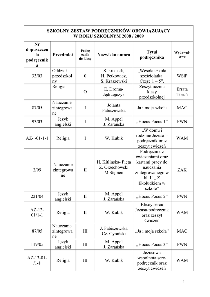 SZKOLNY ZESTAW PODRĘCZNIKÓW OBOWIĄZUJĄCY W ROKU SZKOLNYM 2008 / 2009 Nr dopuszczen ia Przedmiot podręcznik a Oddział 33/03 przedszkol ny Religia 87/05 93/03 Nauczanie zintegrowa ne Język angielski Podrę cznik do klasy Nazwisko autora 0 S. Łukasik, H. Petkowicz, S. Kraszewski O E. DromaJędrzejczyk I Jolanta Fabiszewska Ja i moja szkoła MAC I M. Appel J. Zarańska „Hocus Pocus 1” PWN AZ- -01-1-1 Religia I 2/99 Nauczanie zintegrowa ne II 221/04 Język angielski II AZ-1201/1-1 Religia II 87/05 119/05 AZ-13-01/1-1 Nauczanie zintegrowa ne Język angielski Religia Tytuł podręcznika „Wesoła szkoła sześciolatka. Część 1 – 5”. Zeszyt ucznia klasy przedszkolnej „W domu i rodzinie Jezusa”W. Kubik podręcznik oraz zeszyt ćwiczeń Podręcznik z ćwiczeniami oraz H. Kitlińska- Pięta kartami pracy do Z. Orzechowski nauczania M.Stępień zintegrowanego w kl. II „ Z Ekoludkiem w szkole” M. Appel „Hocus Pocus 2” J. Zarańska Bliscy sercu Jezusa-podręcznik W. Kubik oraz zeszyt ćwiczeń Wydawnictwo WSiP Errata Toruń WAM śAK PWN WAM III J. Fabiszewska Cz. Cyrański „Ja i moja szkoła” MAC III M. Appel J. Zarańska „Hocus Pocus 3” PWN W. Kubik Jezusowa wspólnota sercpodręcznik oraz zeszyt ćwiczeń WAM III 1 38/06 170/99 Przyroda Matematyka 149/01 Język polski 216/99 Język angielski IV IV E. Gromek E. Kłos, W. Kofta E. Laskowska A. Melson M. Dobrowolska P. Zarzycki IV A. Łuczak A. Murdzek IV A. Walewska A.Kasztelawic 428/02 Historia IV M. Błaut H. Chamczyk I. Miklikowska 53/04 Muzyka IV T. Wójcik AZ-2101/1-1 Religia IV Z. Marek 52/04 Plastyka V A. Misior – Waś W. Sygut „Przyrodo witaj! W domu i w okolicy” podręcznik i zeszyt ćwiczeń „Matematyka 4” Podręcznik i 3 zeszyty ćwiczeń (Liczby naturalne, Figury geometryczne i Ułamki) Pod redakcją Wawrzyń ca Kofty, Warszaw a 2006 GWO „Między nami. Język polski” podręcznik dla klasy czwartej szkoły podstawowej. (podręcznik i ćwiczenia) GWO „MAXI TAXI 1” WYDAWNI CTWO SZKOLNE PWN „Moja historia. Podręcznik i ćwiczenia do historii i społeczeństwa dla klasy czwartej szkoły podstawowej” „Muzyczny świat” część 1 zeszyt ćwiczeń + podręcznik dla klas 4 - 6 Zaproszeni przez Boga- podręcznik oraz zeszyt ćwiczeń „Lubię tworzyć” podręcznik + ćwiczenia cz. I Nowa Era MAC WAM MAC 2 433/03 180/02 131/04 Muzyka Język polski Historia V V „Moja Muzyka” A. Łuczak A. Murdzek Między nami. Język polski” podręcznik dla klasy piątej szkoły podstawowej. (podręcznik i ćwiczenia) GWO „Historia i społeczeństwo. Moja historia. Podręcznik i ćwiczenia dla klasy V szkoły podstawowej M. RoŜak „Przyrodo witaj!” podręcznik i zeszyt ćwiczeń WSiP V M. Błaut 139/06 Przyroda V E. Gromek E. Kłos, W. Kofta E. Laskowska A. Melson 299/00 Matematyka V M.Dobrowolska M. Kurpiński P. Zarzycki 437/02 Język angielski V E. DzierŜawska I. Kubrakiewicz AZ-2201/1-1 Religia V Z. Marek 242/01 101/07 159/05 Matematyka Przyroda Historia VI VI VI M. RoŜak E. Korowajczyk M.Dobrowolska M. Kurpiński P. Zarzycki M. Jucewicz E. Gromek E. Kłos, W. Kofta E. Laskowska A. Melson M. RoŜak „Matematyka z plusem” Podręcznik + 3 zeszyty ćwiczeń „Bingo 5” podręcznik + ćwiczenia Obdarowani przez Boga- podręcznik oraz zeszyt ćwiczeń „Matematyka z plusem” Podręcznik + 3 zeszyty ćwiczeń „Przyrodo witaj!” podręcznik i zeszyt ćwiczeń GWO PWN WAM GWO WSiP „Historia i społeczeństwo dla klasy 6, „Moja M. RoŜak historia” podręcznik cz. 1 i 2, ćwiczenia 3 245/03 Język polski VI A. Łuczak A. Murdzek 52/04 Plastyka VI A. Misior – Waś W. Sygut 7/00 Język angielski VI E. DzierŜawska VI M. Braun VI Z. Marek Uzupełnieni e do Matematyka podręcznika 242/01 AZ-2301/1-1 Religia „Między nami” podręcznik i ćwiczenia „Lubię tworzyć” cz. 2 i ćwiczenia „Bingo 6” podręcznik + ćwiczenia Kalendarz szóstoklasisty, wydanie rozszerzone Przemienieni przez Bogapodręcznik oraz zeszyt ćwiczeń GWO MAC PWN GWO WAM Zatwierdzono na posiedzeniu Rady Pedagogicznej -28 marca 2007. 4