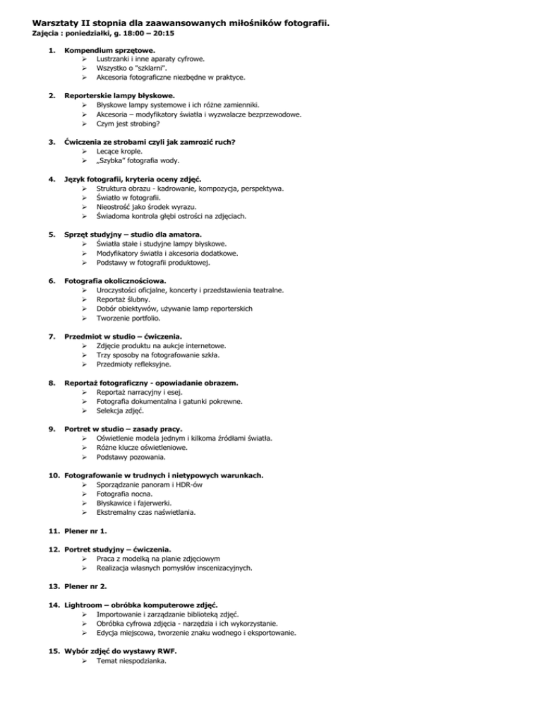 Warsztaty II stopnia dla zaawansowanych miłośników fotografii. Zajęcia : poniedziałki, g. 18:00 – 20:15 1. Kompendium sprzętowe. Lustrzanki i inne aparaty cyfrowe. Wszystko o "szklarni". Akcesoria fotograficzne niezbędne w praktyce. 2. Reporterskie lampy błyskowe. Błyskowe lampy systemowe i ich różne zamienniki. Akcesoria – modyfikatory światła i wyzwalacze bezprzewodowe. Czym jest strobing? 3. Ćwiczenia ze strobami czyli jak zamrozić ruch? Lecące krople. „Szybka” fotografia wody. 4. Język fotografii, kryteria oceny zdjęć. Struktura obrazu - kadrowanie, kompozycja, perspektywa. Światło w fotografii. Nieostrość jako środek wyrazu. Świadoma kontrola głębi ostrości na zdjęciach. 5. Sprzęt studyjny – studio dla amatora. Światła stałe i studyjne lampy błyskowe. Modyfikatory światła i akcesoria dodatkowe. Podstawy w fotografii produktowej. 6. Fotografia okolicznościowa. Uroczystości oficjalne, koncerty i przedstawienia teatralne. Reportaż ślubny. Dobór obiektywów, używanie lamp reporterskich Tworzenie portfolio. 7. Przedmiot w studio – ćwiczenia. Zdjęcie produktu na aukcje internetowe. Trzy sposoby na fotografowanie szkła. Przedmioty refleksyjne. 8. Reportaż fotograficzny - opowiadanie obrazem. Reportaż narracyjny i esej. Fotografia dokumentalna i gatunki pokrewne. Selekcja zdjęć. 9. Portret w studio – zasady pracy. Oświetlenie modela jednym i kilkoma źródłami światła. Różne klucze oświetleniowe. Podstawy pozowania. 10. Fotografowanie w trudnych i nietypowych warunkach. Sporządzanie panoram i HDR-ów Fotografia nocna. Błyskawice i fajerwerki. Ekstremalny czas naświetlania. 11. Plener nr 1. 12. Portret studyjny – ćwiczenia. Praca z modelką na planie zdjęciowym Realizacja własnych pomysłów inscenizacyjnych. 13. Plener nr 2. 14. Lightroom – obróbka komputerowe zdjęć. Importowanie i zarządzanie biblioteką zdjęć. Obróbka cyfrowa zdjęcia - narzędzia i ich wykorzystanie. Edycja miejscowa, tworzenie znaku wodnego i eksportowanie. 15. Wybór zdjęć do wystawy RWF. Temat niespodzianka.
