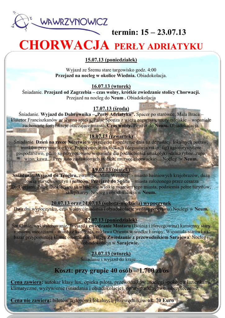 termin: 15 – 23.07.13 CHORWACJA PERŁY ADRIATYKU 15.07.13 (poniedziałek) Wyjazd ze Śremu stare targowisko godz. 4:00 Przejazd na nocleg w okolice Wiednia. Obiadokolacja. 16.07.13 (wtorek) Śniadanie. Przejazd od Zagrzebia – czas wolny, krótkie zwiedzanie stolicy Chorwacji. Przejazd na nocleg do Neum . Obiadokolacja 17.07.13 (środa) Śniadanie. Wyjazd do Dubrownika –„Perły Adriatyku”. Spacer po starówce, Mala Braca – klasztor Franciszkanów ze słynną apteką, Pałac Sponza z wieżą zegarową, mury miejskie – wspaniale zachowane fortyfikacje otaczające miasto. Czas wolny. Powrót do Neum. Obiadokolacja. 18.07.13 (czwartek) Śniadanie. Dzień na rzece Neretwie wypłynięcie i spędzenie dnia na degustacji lokalnych potraw, trunków przy muzyce live. Przepłyniecie na łódkach (degustacja rakiji, fig) agroturystyczne gospodarstwo, gdzie są przygotowane wspaniale dla podniebienia smakołyki -dania rybne, zupa, wino, kawa.....Przy suto zastawionych stolach, muzyce chorwackiej... Nocleg w Neum. 19.07.13 (piątek) Śniadanie. Wyjazd do Trogiru, zwanego „Małą Wenecją” - miasto baśniowych krajobrazów, dużą ilością starych świątyń i pałaców. Przejazd do Splitu – miasta założonego przez cesarza Dioklecjana. Pałac Dioklecjana to właściwie wielkie muzeum tego miasta, podziemia pełne turystów, sklepikarzy. Nocleg i obiadokolacja w Neum. 20.07.13 oraz 21.07.13 (sobota-niedziela) wypoczynek Dwa dni wypoczynku, czas wolny (śniadania i obiadokolacje według programu).Noclegi w Neum. 22.07.13 (poniedziałek) Śniadanie, wykwaterowanie. Wyjazd i zwiedzanie Mostaru (Bośnia i Hercegowina) kamienny stary mostem, meczetami - miasto z kamienia, enklawa Orientu w środku Europy. Wspaniała starówka i bazar przypominają klimat otomańskiej Turcji. Zwiedzanie z przewodnikiem Sarajewa. Nocleg i obiadokolacja w Sarajewie. 23.07.13 (wtorek) Śniadanie i wyjazd do kraju…. Koszt: przy grupie 40 osób – 1.700 zł/os Cena zawiera: autokar klasy lux, opieka pilota, przewodników ,noclegi -pokoje z łazienkami, klimatyczne, wyżywienie (śniadania i obiadokolacje), opłaty parkingowe, ubezpieczenie. Cena nie zawiera: biletów wstępów i lokalnych przewodników ok. 70 Euro