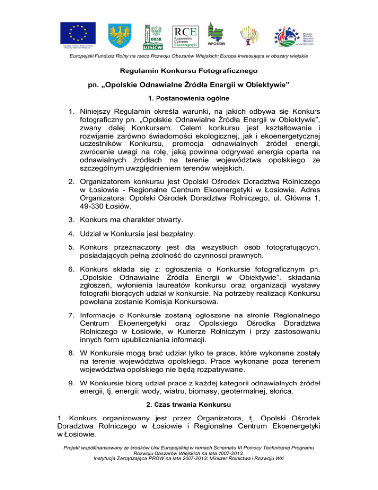 Europejski Fundusz Rolny na rzecz Rozwoju Obszarów Wiejskich: Europa inwestująca w obszary wiejskie Regulamin Konkursu Fotograficznego pn. „Opolskie Odnawialne Źródła Energii w Obiektywie” 1. Postanowienia ogólne 1. Niniejszy Regulamin określa warunki, na jakich odbywa się Konkurs fotograficzny pn. „Opolskie Odnawialne Źródła Energii w Obiektywie”, zwany dalej Konkursem. Celem konkursu jest kształtowanie i rozwijanie zarówno świadomości ekologicznej, jak i ekoenergetycznej uczestników Konkursu, promocja odnawialnych źródeł energii, zwrócenie uwagi na rolę, jaką powinna odgrywać energia oparta na odnawialnych źródłach na terenie województwa opolskiego ze szczególnym uwzględnieniem terenów wiejskich. 2. Organizatorem konkursu jest Opolski Ośrodek Doradztwa Rolniczego w Łosiowie - Regionalne Centrum Ekoenergetyki w Łosiowie. Adres Organizatora: Opolski Ośrodek Doradztwa Rolniczego, ul. Główna 1, 49-330 Łosiów. 3. Konkurs ma charakter otwarty. 4. Udział w Konkursie jest bezpłatny. 5. Konkurs przeznaczony jest dla wszystkich osób fotografujących, posiadających pełną zdolność do czynności prawnych. 6. Konkurs składa się z: ogłoszenia o Konkursie fotograficznym pn. „Opolskie Odnawialne Źródła Energii w Obiektywie”, składania zgłoszeń, wyłonienia laureatów konkursu oraz organizacji wystawy fotografii biorących udział w konkursie. Na potrzeby realizacji Konkursu powołana zostanie Komisja Konkursowa. 7. Informacje o Konkursie zostaną ogłoszone na stronie Regionalnego Centrum Ekoenergetyki oraz Opolskiego Ośrodka Doradztwa Rolniczego w Łosiowie, w Kurierze Rolniczym i przy zastosowaniu innych form upubliczniania informacji. 8. W Konkursie mogą brać udział tylko te prace, które wykonane zostały na terenie województwa opolskiego. Prace wykonane poza terenem województwa opolskiego nie będą rozpatrywane. 9. W Konkursie biorą udział prace z każdej kategorii odnawialnych źródeł energii, tj. energii: wody, wiatru, biomasy, geotermalnej, słońca. 2. Czas trwania Konkursu 1. Konkurs organizowany jest przez Organizatora, tj. Opolski Ośrodek Doradztwa Rolniczego w Łosiowie i Regionalne Centrum Ekoenergetyki w Łosiowie. Projekt współfinansowany ze środków Unii Europejskiej w ramach Schematu III Pomocy Technicznej Programu Rozwoju Obszarów Wiejskich na lata 2007-2013. Instytucja Zarządzająca PROW na lata 2007-2013: Minister Rolnictwa i Rozwoju Wsi Europejski Fundusz Rolny na rzecz Rozwoju Obszarów Wiejskich: Europa inwestująca w obszary wiejskie 2. Zgłoszenia przyjmowane będą do dnia 30.06.2013r., do godz.24:00. Ogłoszenie wyników i rozdanie nagród nastąpi w dniu 12.09.2013r. na Rynku w Opolu. 3. Prace nadesłane po wyznaczonym terminie zgłoszenia nie będą rozpatrywane. 3. Komisja Konkursowa 1. Celem zapewnienia prawidłowej organizacji i przebiegu Konkursu, a w szczególności w celu dokonania oceny prawidłowości zgłoszeń do Konkursu oraz wyłonienia osób nagrodzonych, Organizator powoła Komisję Konkursową (zwaną dalej Jury). 2. Jury złożone z profesjonalnych fotografików i pracowników Organizatora dokona wyboru do 32 nominowanych fotografii, spośród których wyłoni 5 laureatów niniejszego Konkursu oraz przyzna nagrody. 4. Warunki udziału w Konkursie 1. Warunkiem uczestnictwa w Konkursie jest wypełnienie formularza zgłoszeniowego, zamieszczonego na stronach internetowych: www.oodr.pl, www.rce.oodr.pl. 2. Każdy uczestnik może nadesłać maksymalnie do 3 pojedynczych prac lub zestawu 5 fotografii, które będą traktowane jako jedna praca. Maksymalna ilość to 15 fotografii. 3. Zgłoszenie do Konkursu jest jednoznaczne z oświadczeniem, że: - osoba przedstawiająca fotografie jest ich autorem i posiada do nich pełne prawa autorskie, w przypadku naruszenia powyższych wymogów, za zaspokojenie roszczeń osób trzecich odpowiada wyłącznie Uczestnik, - z momentem nadesłania fotografii do Konkursu, Uczestnik udziela Organizatorowi nieodpłatnej, nieograniczonej co do czasu i terytorium licencji na korzystanie z nadesłanej fotografii na następujących polach eksploatacji w rozumieniu Ustawy z dnia 4 lutego 1994r. o prawie autorskim i prawach pokrewnych (Dz. U. Z 2000 r., Nr 80, poz. 904 z późn. zmianami): • rozpowszechnianie – wykorzystanie w publikacjach (w tym do umieszczenia w folderach), wystawienie, wyświetlenie, publiczne udostepnienie fotografii w taki sposób że każdy może mieć do niej dostęp w miejscu i czasie przez siebie wybranym, • wprowadzania do sieci komputerowych, internetu, wielokrotne utrwalanie i zwielokrotnianie każdą techniką, przesyłanie zdjęcia innym podmiotom współpracującym w jakiejkolwiek formie i jakikolwiek sposób w celu ich udostępniania publiczności oraz oceny przez Komisję Konkursową Projekt współfinansowany ze środków Unii Europejskiej w ramach Schematu III Pomocy Technicznej Programu Rozwoju Obszarów Wiejskich na lata 2007-2013. Instytucja Zarządzająca PROW na lata 2007-2013: Minister Rolnictwa i Rozwoju Wsi Europejski Fundusz Rolny na rzecz Rozwoju Obszarów Wiejskich: Europa inwestująca w obszary wiejskie - zgłaszający się do Konkursu wyraża zgodę na przetwarzanie swoich danych osobowych na potrzeby Konkursu oraz w celach marketingowych, zgodnie z Ustawą z dnia 29 sierpnia 1997 r. o ochronie danych osobowych (tekst jedn. Dz.U. z 2002 r. Nr 101, poz. 926 z późn. zmianami). 4. Pełna lista uczestników zakwalifikowanych do Konkursu umieszczona zostanie na stronie internetowej www.oodr.pl oraz www.rce.opole.pl do dnia 31.07.2013r. 5. W przypadku braku wystarczającej liczby chętnych, Organizator wyznaczyć może nowy termin naboru. 6. Na konkurs będą przyjmowane prace wcześniej nie publikowane. 7. Prace na konkurs będą przyjmowane wyłącznie drogą mailową na adres: [email protected] 8. Warunki techniczne nadsyłanych prac: - długość krótszego boku min. 2000 pikseli - akceptowalny format 