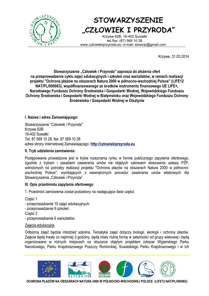 STOWARZYSZENIE „CZŁOWIEK I PRZYRODA” Krzywe 62B, 16-402 Suwałki tel./fax: (87) 569 10 28 www.czlowiekiprzyroda.eu e-mail: [email protected] Krzywe, 31.03.2014 Stowarzyszenie „Człowiek i Przyroda” zaprasza do złożenia ofert na przeprowadzenie cyklu zajęć edukacyjnych i szkoleń oraz warsztatów, w ramach realizacji projektu "Ochrona płazów na obszarach Natura 2000 w północno-wschodniej Polsce" (LIFE12 NAT/PL/000063), współfinansowanego ze środków instrumentu finansowego UE LIFE+, Narodowego Funduszu Ochrony Środowiska i Gospodarki Wodnej, Wojewódzkiego Funduszu Ochrony Środowiska i Gospodarki Wodnej w Białymstoku oraz Wojewódzkiego Funduszu Ochrony Środowiska i Gospodarki Wodnej w Olsztynie I. Nazwa i adres Zamawiającego: Stowarzyszenie "Człowiek i Przyroda" Krzywe 62B 16-402 Suwałki Tel. 87 569 10 28, fax: 87 569 10 28 adres strony internetowej Zamawiającego: http://czlowiekiprzyroda.eu II. Tryb udzielenia zamówienia: Postępowanie prowadzone jest w trybie rozeznania rynku w formie publicznego zapytania ofertowego, zgodnie z trybem i zasadami zawierania umów nie objętych zakresem stosowania ustawy PZP, wdrożonych na potrzeby realizacji projektu "Ochrona płazów na obszarach Natura 2000 w północnowschodniej Polsce", wynikających z wewnętrznych procedur zawierania umów właściwych dla Stowarzyszenia „Człowiek i Przyroda”. III. Opis przedmiotu zapytania ofertowego 1. Przedmiot zamówienia został podzielony na następujące dwie części: Część 1 - przeprowadzenie 10 zajęć edukacyjnych; - przeprowadzenie 9 szkoleń. Część 2 - przeprowadzenie 6 warsztatów. Zajęcia edukacyjne Odbiorcą zajęć będzie młodzież szkolna. Tematyka zajęć dotyczy biologii, ekologii i ochrony płazów. Zajęcia będą trwały co najmniej 3 godziny, będą miały różną formę w zależności od grupy wiekowej i będą organizowane w różnych miejscach na obszarze objętym projektem (obszar Wigierskiego Parku Narodowego, Parku Krajobrazowego Puszczy Rominckiej, Suwalskiego Parku Krajobrazowego i w ich OCHRONA PŁAZÓW NA OBSZARACH NATURA 2000 W PÓŁNOCNO-WSCHODNIEJ POLSCE (LIFE12 NAT/PL/000063) okolicy). Zajęcia będą polegały m.in. na wspólnym prowadzeniu obserwacji przyrodniczych - obserwacji płazów w różnych środowiskach i w różnych okresach rozwoju, rozpoznawaniu gatunków płazów - m.in. przy wykorzystaniu modeli płazów, rozpoznawaniu głosów płazów, prowadzeniu akcji ratowania płazów przy szlakach komunikacyjnych podczas wiosennych ich wędrówek czy wspólnych zabawach - quizach, konkursach o tematyce dotyczącej płazów. Podczas zajęć należy wykorzystywać pakiety edukacyjne dostarczone przez Zamawiającego. W pojedynczych zajęciach weźmie udział od 20 do 50 osób. Przewiduje się, że w 2014 i 2015 roku odbędzie się po 5 zajęć. Liczba osób prowadzących zajęcia edukacyjne - 1. Szkolenia Odbiorcą szkoleń będą przedstawiciele podmiotów biorących udział w sieci monitoringu zagrożeń płazów przy szlakach komunikacyjnych (m.in.: nauczyciele, pracownicy parków narodowych i krajobrazowych, studenci, uczniowie). Tematyka szkoleń będzie zatem dotyczyła prowadzenia monitoringu, posługiwania się specjalnie zakupionym sprzętem (odbiorniki GPS, aparaty cyfrowe, laptopy, bariery naprowadzające) do monitoringu oraz opracowywaniem danych i ich wizualizacją. Szkolenia będą trwały 5,5 godziny, w tym 0,5 godz. przerwa na posiłek, będą organizowane w różnych miejscach na terenie realizacji projektu (obszar Wigierskiego Parku Narodowego, Narwiańskiego Parku Narodowego, Parku Krajobrazowego Puszczy Rominckiej, Suwalskiego Parku Krajobrazowego i w ich okolicy). W trakcie szkoleń należy wykorzystywać specjalnie przygotowane pakiety informacyjno-edukacyjne oraz sprzęt pomocny przy prowadzeniu monitoringu płazów (elementy te dostarcza Zamawiający). W pojedynczych zajęciach weźmie udział 30 osób. Przewiduje się, że w 2014 odbędzie się 5 szkoleń, a w 2015 roku 4 szkolenia. Zamawiający Liczba osób prowadzących szkolenia - 2. Warsztaty Odbiorcą warsztatów będą nauczyciele (różnych poziomów nauczania), szeroko rozumiane służby ochrony przyrody (pracownicy parków narodowych i krajobrazowych, pracownicy Regionalnych Dyrekcji Ochrony Środowiska, odpowiedni urzędnicy z urzędów gminnych i Starostwa, przedstawiciele przyrodniczych organizacji pozarządowych) oraz projektanci i przedstawiciele budownictwa drogowego. Celem warsztatów będzie zapoznanie się z metodami stosowanymi w ochronie drobnych zwierząt, w tym płazów, na drogach i budowach, zasadami postępowania administracyjnego dotyczącego ograniczania śmiertelności zwierząt oraz doskonalenie umiejętności w przeprowadzaniu ocen oddziaływania różnych inwestycji na środowisko (populacje płazów i siedliska, w których one występują). W przypadku nauczycieli warsztaty będą dotyczyły umiejętności wykorzystania wiedzy o płazach, ich znaczeniu i metodach ochrony w zajęciach szkolnych i pozaszkolnych, które będą kształtowały postawy przyjazne środowisku. Warsztaty będą trwały 7,5 godziny, w tym 0,5 godz. przerwa na posiłek, będą organizowane w różnych miejscach na terenie realizacji projektu (obszar Wigierskiego Parku Narodowego, Parku Krajobrazowego Puszczy Rominckiej i w ich okolicy). W pojedynczych warsztatach weźmie udział 20 osób. Przewiduje się, że w 2014 i 2015 roku odbędzie się po 3 warsztaty. Liczba osób prowadzących warsztaty - 2. 2. Termin wykonania zamówienia. Całe zamówienie musi zostać zrealizowane w terminie od daty zawarcia umowy do 30 listopada 2015 roku. O terminach poszczególnych zajęć edukacyjnych i szkoleń oraz miejscach ich odbywania się Zamawiający poinformuje Wykonawcę co najmniej na 3 tygodnie przed spotkaniami. 3. Wykonawcy opracują szczegółową tematykę poszczególnych spotkań, którą musi zatwierdzić Zamawiający. Tematyka spotkań będzie zróżn