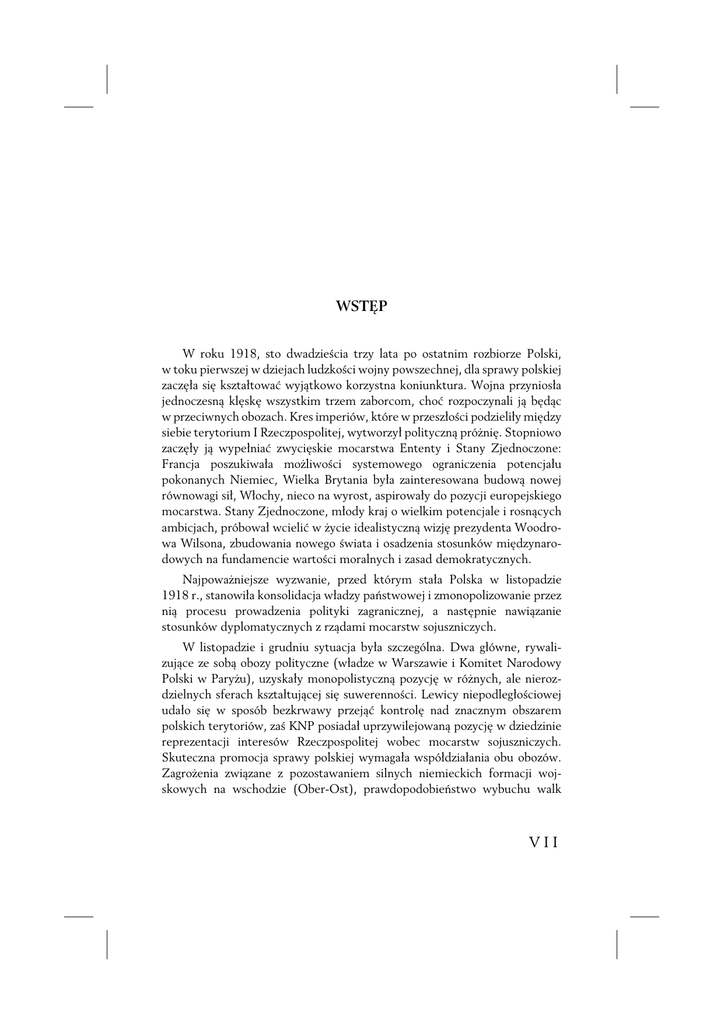 WSTĘP W roku 1918, sto dwadzieścia trzy lata po ostatnim rozbiorze Polski, w toku pierwszej w dziejach ludzkości wojny powszechnej, dla sprawy polskiej zaczęła się kształtować wyjątkowo korzystna koniunktura. Wojna przyniosła jednoczesną klęskę wszystkim trzem zaborcom, choć rozpoczynali ją będąc w przeciwnych obozach. Kres imperiów, które w przeszłości podzieliły między siebie terytorium I Rzeczpospolitej, wytworzył polityczną próżnię. Stopniowo zaczęły ją wypełniać zwycięskie mocarstwa Ententy i Stany Zjednoczone: Francja poszukiwała możliwości systemowego ograniczenia potencjału pokonanych Niemiec, Wielka Brytania była zainteresowana budową nowej równowagi sił, Włochy, nieco na wyrost, aspirowały do pozycji europejskiego mocarstwa. Stany Zjednoczone, młody kraj o wielkim potencjale i rosnących ambicjach, próbował wcielić w życie idealistyczną wizję prezydenta Woodrowa Wilsona, zbudowania nowego świata i osadzenia stosunków międzynarodowych na fundamencie wartości moralnych i zasad demokratycznych. Najpoważniejsze wyzwanie, przed którym stała Polska w listopadzie 1918 r., stanowiła konsolidacja władzy państwowej i zmonopolizowanie przez nią procesu prowadzenia polityki zagranicznej, a następnie nawiązanie stosunków dyplomatycznych z rządami mocarstw sojuszniczych. W listopadzie i grudniu sytuacja była szczególna. Dwa główne, rywalizujące ze sobą obozy polityczne (władze w Warszawie i Komitet Narodowy Polski w Paryżu), uzyskały monopolistyczną pozycję w różnych, ale nierozdzielnych sferach kształtującej się suwerenności. Lewicy niepodległościowej udało się w sposób bezkrwawy przejąć kontrolę nad znacznym obszarem polskich terytoriów, zaś KNP posiadał uprzywilejowaną pozycję w dziedzinie reprezentacji interesów Rzeczpospolitej wobec mocarstw sojuszniczych. Skuteczna promocja sprawy polskiej wymagała współdziałania obu obozów. Zagrożenia związane z pozostawaniem silnych niemieckich formacji wojskowych na wschodzie (Ober-Ost), prawdopodobieństwo wybuchu walk VII WSTĘP polsko-niemieckich w Wielkopolsce i na Śląsku, rosnące niebezpieczeństwo związane ze zbliżaniem się Armii Czerwonej, postępujący spór graniczny z Czechami, walki polsko-ukraińskie, groźne skutki europejskich i amerykańskich reakcji na falę pogromów na ziemiach polskich: wszystko to zmuszało do koordynacji działań organizacyjnych i wojskowych w kraju z zabiegami dyplomatycznymi w Paryżu, Londynie, Rzymie i Waszyngtonie. Najsilniejszym argumentem przemawiającym za nawiązaniem ścisłej współpracy między władzami w kraju i KNP okazał się czas i szybko zbliżający się termin rozpoczęcia konferencji pokojowej, która miała zadecydować o kształcie powojennej Europy, w tym także o granicach państwa polskiego. SPRAWY ORGANIZACYJNE, STRUKTURA KNP, POWSTANIE MSZ Wyzwania, którym musiała sprostać odradzająca się Polska, wymagały sprawnego i dobrze zorganizowanego aparatu urzędniczego dla obsługi polityki zagranicznej. Najlepiej przygotowany pod tym względem był KNP. Jego działalność była finansowana z pożyczki udzielonej przez rządy Francji (150 tys. franków miesięcznie) i Wielkiej Brytanii (75 tys. franków) oraz pomocy finansowej Polonii amerykańskiej, zwłaszcza Wydziału Narodowego Polskiego Centralnego Komitetu Ratunkowego w Chicago. W listopadzie 1918 r. Komitet składał się z trzynastu członków: Romana Dmowskiego (prezes), Franciszka Fronczaka, Stanisława Grabskiego, Stanisława Kozickiego, Ignacego Jana Paderewskiego, Erazma Piltza, Jana Jordana Rozwadowskiego, Mariana Seydy, Konstantego Skirmunta, Władysława Sobańskiego, Maurycego Zamoyskiego (wiceprezes), Józefa Wielowieyskiego i Jana Żółtowskiego. Największy wpływ na działalność Komitetu mieli członkowie na stałe przebywający w Paryżu, czyli Dmowski, Kozicki, Rozwadowski, Seyda, Wielowieyski, Zamoyski, reprezentujący Stronnictwo Demokratyczno-Narodowe, oraz Erazm Piltz, członek Stronnictwa Polityki Realnej (także przedstawiciel Komitetu przy rządzie Francji). Fronczak reprezentował w Komitecie Wydział Narodowy Polskiego Centralnego Komitetu Ratunkowego. Pozostałymi przedstawicielami KNP przy rządach państw Ententy byli: Władysław Sobański w Londynie, działacz Stronnictwa Polityki Realnej, Ignacy Paderewski w Waszyngtonie, niezależny, i Konstanty Skirmunt w Rzymie, reprezentujący środowiska ziemiańskie Białorusi, zbliżony do „Realistów”. Po wyjeździe Ignacego Paderewskiego do Europy, funkcję VIII WSTĘP przedstawiciela KNP w Stanach Zjednoczonych przejął Jan Smulski, który ze względu na obywatelstwo amerykańskie mógł działać jedynie jako tymczasowy rzecznik spraw polskich. Z powodu okazjonalnych jedynie przyjazdów do Paryża, w znacznie mniejszym stopniu mogli oni jednak uczestniczyć w procesie podejmowania decyzji, nawet o dużym znaczeniu politycznym. Istotną rolę odgrywał w pracach KNP także Jan Modzelewski, który choć nie był członkiem Komitetu, kierował ważnym przedstawicielstwem polityczno-informacyjnym w Bernie. Szwajcaria, państwo neutralne, uzyskała w trakcie I wojny światowej szczególną pozycję: krzyżowały się tam szlaki kurierów i misji dyplomatycznych wszystkich zaangażowanych w wojnę stron. Po zawarciu rozejmu w Compiègne, w związku z koniecznością omijania Niemiec, jedyna dostępna droga komunikacji między Paryżem a Warszawą prowadziła przez Berno i Genewę. Modzelewski zajmował się zbieraniem i przekazywaniem do Paryża doniesień agencyjnych, informacji prasowych i wiadomości z kraju uzyskiwanych od osób przebywających lub podróżujących przez Szwajcarię. Oprócz przedstawicielstw o charakterze polityczno-informacyjnym, mających kluczowe znaczenie dla prowadzonej przez KNP polityki wobec mocarstw sprzymierzonych, Komitet posiadał także przedstawicielstwa o charakterze konsularno-informacyjnym. W Bukareszci