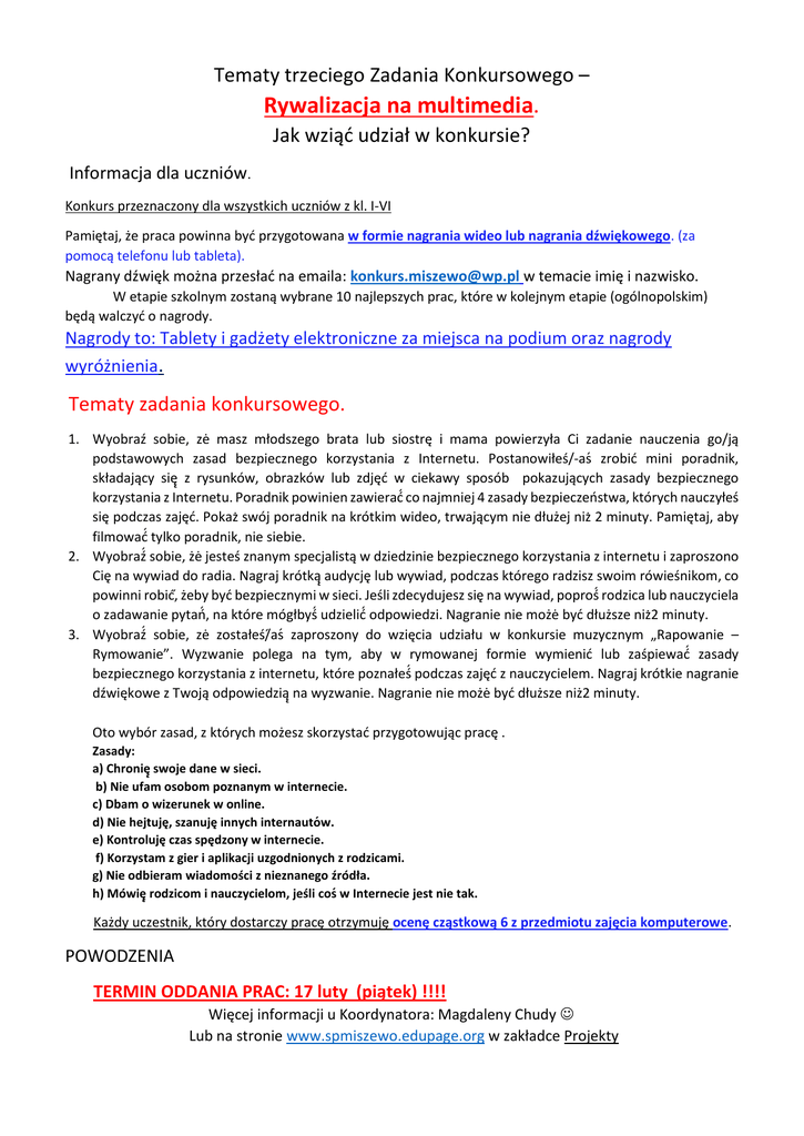 Tematy trzeciego Zadania Konkursowego – Rywalizacja na multimedia. Jak wziąć udział w konkursie? Informacja dla uczniów. Konkurs przeznaczony dla wszystkich uczniów z kl. I-VI Pamiętaj, że praca powinna być przygotowana w formie nagrania wideo lub nagrania dźwiękowego. (za pomocą telefonu lub tableta). Nagrany dźwięk można przesłać na emaila: [email protected] w temacie imię i nazwisko. W etapie szkolnym zostaną wybrane 10 najlepszych prac, które w kolejnym etapie (ogólnopolskim) będą walczyć o nagrody. Nagrody to: Tablety i gadżety elektroniczne za miejsca na podium oraz nagrody wyróżnienia. Tematy zadania konkursowego. 1. Wyobraź sobie, zė masz młodszego brata lub siostrę i mama powierzyła Ci zadanie nauczenia go/ją podstawowych zasad bezpiecznego korzystania z Internetu. Postanowiłeś/-aś zrobić mini poradnik, składający się ̨ z rysunków, obrazków lub zdjęć w ciekawy sposób pokazujących zasady bezpiecznego korzystania z Internetu. Poradnik powinien zawierać ́ co najmniej 4 zasady bezpieczeństwa, których nauczyłeś się podczas zajęć. Pokaż swój poradnik na krótkim wideo, trwającym nie dłużej niż 2 minuty. Pamiętaj, aby filmować ́ tylko poradnik, nie siebie. 2. Wyobraź ́ sobie, żė jesteś znanym specjalistą w dziedzinie bezpiecznego korzystania z internetu i zaproszono Cię na wywiad do radia. Nagraj krótką ̨ audycję lub wywiad, podczas którego radzisz swoim rówieśnikom, co powinni robić,́ żeby być bezpiecznymi w sieci. Jeśli zdecydujesz się na wywiad, poproś ́ rodzica lub nauczyciela o zadawanie pytań́, na które mógłbyś ́ udzielić ́ odpowiedzi. Nagranie nie możė być dłuższe niż2 minuty. 3. Wyobraź ́ sobie, zė zostałeś/́aś zaproszony do wzięcia udziału w konkursie muzycznym „Rapowanie – Rymowanie”. Wyzwanie polega na tym, aby w rymowanej formie wymienić lub zaśpiewać ́ zasady bezpiecznego korzystania z internetu, które poznałeś ́ podczas zajęć z nauczycielem. Nagraj krótkie nagranie dźwiękowe z Twoją odpowiedzią ̨ na wyzwanie. Nagranie nie możė być dłuższe niż2 minuty. Oto wybór zasad, z których możesz skorzystać przygotowując pracę . Zasady: a) Chronię ̨ swoje dane w sieci. b) Nie ufam osobom poznanym w internecie. c) Dbam o wizerunek w online. d) Nie hejtuję, szanuję innych internautó w. e) Kontroluję czas spędzony w internecie. f) Korzystam z gier i aplikacji uzgodnionych z rodzicami. g) Nie odbieram wiadomości z nieznanego źródła. h) Mówię ̨ rodzicom i nauczycielom, jeśli coś w Internecie jest nie tak. Każdy uczestnik, który dostarczy pracę otrzymuję ocenę cząstkową 6 z przedmiotu zajęcia komputerowe. POWODZENIA TERMIN ODDANIA PRAC: 17 luty (piątek) !!!! Więcej informacji u Koordynatora: Magdaleny Chudy Lub na stronie www.spmiszewo.edupage.org w zakładce Projekty