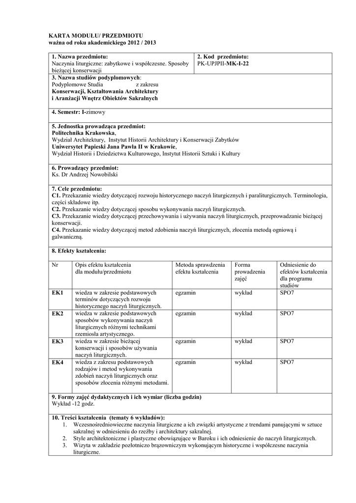 KARTA MODUŁU/ PRZEDMIOTU ważna od roku akademickiego 2012 / 2013 1. Nazwa przedmiotu: Naczynia liturgiczne: zabytkowe i współczesne. Sposoby bieżącej konserwacji 3. Nazwa studiów podyplomowych: Podyplomowe Studia z zakresu Konserwacji, Kształtowania Architektury i Aranżacji Wnętrz Obiektów Sakralnych 2. Kod przedmiotu: PK-UPJPII-MK-I-22 4. Semestr: I-zimowy 5. Jednostka prowadząca przedmiot: Politechnika Krakowska, Wydział Architektury, Instytut Historii Architektury i Konserwacji Zabytków Uniwersytet Papieski Jana Pawła II w Krakowie, Wydział Historii i Dziedzictwa Kulturowego, Instytut Historii Sztuki i Kultury 6. Prowadzący przedmiot: Ks. Dr Andrzej Nowobilski 7. Cele przedmiotu: C1. Przekazanie wiedzy dotyczącej rozwoju historycznego naczyń liturgicznych i paraliturgicznych. Terminologia, części składowe itp. C2. Przekazanie wiedzy dotyczącej sposobu wykonywania naczyń liturgicznych. C3. Przekazanie wiedzy dotyczącej przechowywania i używania naczyń liturgicznych, przeprowadzanie bieżącej konserwacji. C4. Przekazanie wiedzy dotyczącej metod zdobienia naczyń liturgicznych, złocenia metodą ogniową i galwaniczną. 8. Efekty kształcenia: Nr Opis efektu kształcenia dla modułu/przedmiotu Metoda sprawdzenia efektu kształcenia Forma prowadzenia zajęć EK1 wiedza w zakresie podstawowych terminów dotyczących rozwoju historycznego naczyń liturgicznych. wiedza w zakresie podstawowych sposobów wykonywania naczyń liturgicznych różnymi technikami rzemiosła artystycznego. wiedza w zakresie bieżącej konserwacji i sposobów używania naczyń liturgicznych. wiedza z zakresu podstawowych rodzajów i metod wykonywania zdobień naczyń liturgicznych oraz sposobów złocenia różnymi metodami. egzamin wykład Odniesienie do efektów kształcenia dla programu studiów SPO7 egzamin wykład SPO7 egzamin wykład SPO7 egzamin wykład SPO7 EK2 EK3 EK4 9. Formy zajęć dydaktycznych i ich wymiar (liczba godzin) Wykład -12 godz. 10. Treści kształcenia (tematy 6 wykładów): 1. Wczesnośredniowieczne naczynia liturgiczne a ich związki artystyczne z trendami panującymi w sztuce sakralnej w odniesieniu do rzeźby i architektury sakralnej. 2. Style architektoniczne i plastyczne obowiązujące w Baroku i ich odniesienie do naczyń liturgicznych. 3. Wizyta w zakładzie pozłotniczo brązowniczym wykonującym historyczne i współczesne naczynia liturgiczne. 4. 5. 6. Wizyta w zakładzie pozłotniczo brązowniczym wykonującym historyczne i współczesne naczynia liturgiczne. Sposoby bieżącej konserwacji naczyń liturgicznych srebrnych i złoconych. Historyczne i współczesne metody złocenia naczyń liturgicznych – metoda ogniowa i galwaniczna. 11. Egzamin: tak 12. Literatura podstawowa i uzupełniająca: Literatura podstawowa: 1. Chrzanowski T., Polska sztuka sakralna, Wydawnictwo Kluszczyński, Kraków 2002. 2. Samek J., Polskie Rzemiosło Artystyczne Średniowiecze, Warszawa 2000. 3. Samek J., Dzieje Złotnictwa w Polsce, Warszawa 1993. 4. Samek J., Skarbiec Bazyliki Mariackiej w Krakowie, Kraków 2004. 5. Sołtysówna A., Złotnictwo Skarbca i Katedry na Wawelu, Kraków 1993. 6. Nowak J., Turdza W., Skarby krakowskich klasztorów, Kraków 2000. 7. Komornicki S., Kilka słów o złotnictwie. Materiał i techniki. Kształtu przyborów liturgicznych w dziejach złotnictwa kościelnego, Pelplin 1929. 8. Zieliński Ch., Sztuka sakralna, Poznań – Warszawa – Lublin, Poznań 1959. Literatura uzupełniająca: 1. Fiut I. S., Rozważania o utworze muzealnym [w:] Filozofia – Media – Ekologia, Kraków 1998. 2. Świecimski J., Ekspozycja muzealna jako twór architektoniczno-plastyczny, Kraków 1976. 3. Popczyk M., Muzeum sztuki, Kraków 2005. 13. Nakład pracy studenta potrzebny do osiągnięcia efektów kształcenia: Forma zajęć Lp. Wykład Ćwiczenia Laboratorium Projekt Seminarium Inne Suma godzin 14. Suma wszystkich godzin 50 godzin Liczba godzin w planie studiów 12 12 Liczba godzin pracy własnej * 38 38 15. Liczba punktów ECTS 2 punkty ECTS 16. Uwagi Zatwierdzono: 30.10.2012, Ks. Dr Andrzej J. Nowobilski ………………………………..……..…... (data i podpis prowadzącego) 30.10.2012, Prof. Andrzej Kadłuczka ………………………………………..……… (data i podpis kierownika studiów podyplomowych)