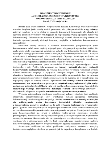 DOKUMENT KONFERENCJI „WOKÓŁ ZAGADNIEŃ ESTETYKI ZABYTKU PO KONSERWACJI I RESTAURACJI” Toruń, 27-29 maja 2010 r. Bardzo duża liczba referatów wygłoszonych podczas Konferencji oraz różnorodność tematów i wątków jakie zostały w nich poruszone, nie tylko potwierdziły wagę ochrony estetyki zabytków w całym złożonym procesie konserwacji i restauracji, ale ukazały też zjawisko eskalacji problemów wynikających ze współczesnej sytuacji społeczno-kulturowej i ekonomicznej. Zainteresowanie tematem Konferencji stanowi niezaprzeczalny dowód na istnienie ogromnej potrzeby dyskusji i wymiany poglądów w środowisku konserwatorówrestauratorów. Poruszone tematy świadczą o wielkim zróżnicowaniu podejmowanych przez konserwatorów zadań, coraz częściej stających przed nietypowymi wyzwaniami, takimi jak zachowanie sztuki współczesnej, dziedzictwa techniki czy dokumentów historii XX wieku. Sytuacja ta wymaga poszukiwania coraz to nowych, niestandardowych rozwiązań - nie tylko technicznych i technologicznych, ale i estetycznych. Wymaga szerokiego spojrzenia na całokształt procesu konserwacji i restauracji, odpowiedniego przygotowania zawodowego oraz skutecznej współpracy z przedstawicielami wielu dyscyplin pokrewnych. Przypadki relacjonowane przez uczestników Konferencji reprezentujących różne środowiska z całej Polski, były dowodem na twórczy i autorski charakter realizacji konserwatorsko-restauratorskich. To właśnie konserwator w wyniku wszystkich swoich działań ostatecznie decyduje o wyglądzie i estetyce zabytku. Ukazanie kreacyjnego charakteru dyscypliny konserwacji-restauracji uwypukliło równocześnie fakt, że ochrona praw autorskich konserwatorów nadal pozostawia wiele do życzenia, co w konsekwencji ma negatywny wpływ na ochronę zawodu. Tymczasem bez ochrony zawodu konserwatorarestauratora, bez zapewnienia że prace przy zabytkach mogą wykonywać tylko osoby posiadające najwyższe kwalifikacje - nie jest możliwa skuteczna ochrona. Odpowiednich modyfikacji wymaga prawodawstwo dotyczące ochrony i konserwacji zabytków niedoskonałe, ale przede wszystkim mało skutecznie egzekwowane w praktyce. Wyraźnie odczuwalnym problemem współczesnej ochrony zabytków jest osłabienie środowiska konserwatorskiego, które w aktualnej sytuacji społecznej, politycznej i ekonomicznej z trudem wypełnia swą misję. Służby konserwatorskie utraciły należną im siłę oddziaływania wobec inwestorów i właścicieli obiektów zabytkowych, a konserwatorzy praktycy spychani są do roli wyłącznie technicznych wykonawców prac. Ogromna szansa wynikająca ze zwiększonych w ostatnich latach środków finansowych na prace konserwatorskie paradoksalnie zwraca się przeciw zabytkom. Częste jest traktowanie prac konserwatorskich na równi z robotami budowlanymi, stosowanie procedur przetargowych, przedkładanie niskiej ceny nad wysoką jakość i profesjonalizm, wyznaczanie sztywnych terminów i kosztorysów nie uwzględniających potrzeby elastycznych zmian (np. wynikających z dokonywanych odkryć), brak obowiązkowego merytorycznego nadzoru konserwatorskiego, brak dbałości o wykonywanie prac zgodnie z zasadami konserwatorskimi. Skutecznym antidotum na wiele problemów związanych zarówno z estetyką i ostatecznym wyglądem zabytków po pracach, jak i z organizacją kompleksowych działań, powinno być projektowanie konserwatorskie oraz uznanie i umocowanie prawne tego istotnego etapu. Powinien on obowiązkowo poprzedzać sam proces konserwacji. Przy stosowanych obecnie mechanizmach finansowania i kontroli prac, w fazie realizacji często nie ma już pola manewru, co negatywnie odbija się na jakości, efektach i trwałości wyników. Tymczasem właśnie na etapie przygotowania projektu konserwator może przekonać inwestora i współuczestników przedsięwzięcia do optymalnych rozwiązań, najciekawszej wizji, ustalić przewidywany, końcowy efekt prac, jak również zaplanować odpowiednie terminy, technologie i inne szczegóły realizacji a także rozwiązania wariantowe. Wymowa dużej części wypowiedzi jest wyrazem solidarnego niepokoju i troski środowiska o zabytki w związku z narastającą rozbieżnością między teorią a praktyką konserwatorską – na skutek komercjalizacji otaczającego nas świata. Wynikająca z procesu konserwacji i stanowiąca swoisty kanon estetyka oryginalnych obiektów zabytkowych, nie zawsze znajduje zrozumienie i nie zawsze spełnia oczekiwania społeczeństwa. W efekcie często mamy do czynienia z niekontrolowanym kształtowaniem się nowej, wynaturzonej estetyki zabytków, upiększanych pod dyktando powszechnych gustów. Dlatego godne podkreślenia jest, że misja konserwatora nie kończy się na bezpośredniej ingerencji w obiekt i kreowaniu jego estetyki, ale niezaprzeczalnie polega również na dialogu, edukacji i kształtowaniu wrażliwości odbiorców zabytków. Za wygląd zabytków i stan w jakim będą przekazane przyszłym pokoleniem, konserwatorzy jako profesjonaliści czują się zawodowo i moralnie odpowiedzialni. Jak wynika z wielu zaprezentowanych podczas Konferencji przykładów, ważnym aspektem kształtowania estetyki zabytku jest świadome postrzeganie go nie tylko jako pamiątki czasu w którym powstał, ale i nośnika informacji o wydarzeniach, jakie upłynęły od jego stworzenia, nie tylko jako elementu przynależnego współczesności, ale ponad wszystko jako obiektu niepowtarzalnego, stworzonego w przeszłości i przez to w niej zakotwiczonego. Taki sposób rozumienia zabytku zmusza do refleksji nad zagadnieniem autentyczności i znaczeniem decyzji konserwatora wobec nawarstwień historycznych, także decyzji o doborze materiałów używanych do współczesnych działań konserwatorskich. Lekceważenie złożonej natury obiektów zabytkowych jak również schematyzm działania związany między innymi z automatycznym stosowaniem technologii narzucanych przez koncerny produkują