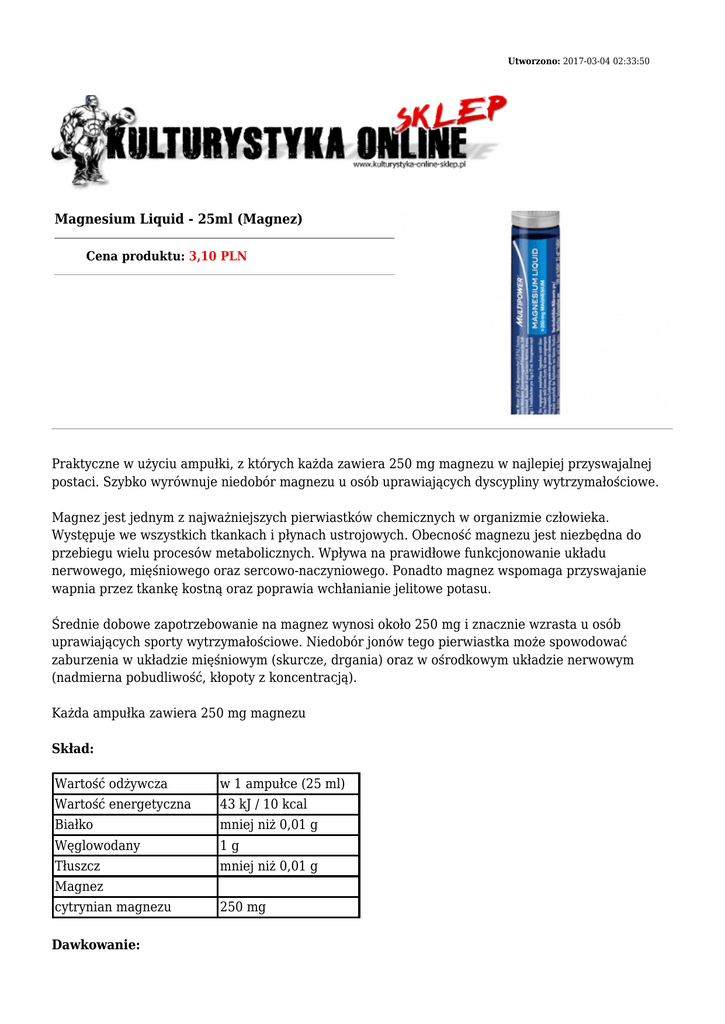 Utworzono: 2017-03-04 02:33:50 Magnesium Liquid - 25ml (Magnez) Cena produktu: 3,10 PLN Praktyczne w użyciu ampułki, z których każda zawiera 250 mg magnezu w najlepiej przyswajalnej postaci. Szybko wyrównuje niedobór magnezu u osób uprawiających dyscypliny wytrzymałościowe. Magnez jest jednym z najważniejszych pierwiastków chemicznych w organizmie człowieka. Występuje we wszystkich tkankach i płynach ustrojowych. Obecność magnezu jest niezbędna do przebiegu wielu procesów metabolicznych. Wpływa na prawidłowe funkcjonowanie układu nerwowego, mięśniowego oraz sercowo-naczyniowego. Ponadto magnez wspomaga przyswajanie wapnia przez tkankę kostną oraz poprawia wchłanianie jelitowe potasu. Średnie dobowe zapotrzebowanie na magnez wynosi około 250 mg i znacznie wzrasta u osób uprawiających sporty wytrzymałościowe. Niedobór jonów tego pierwiastka może spowodować zaburzenia w układzie mięśniowym (skurcze, drgania) oraz w ośrodkowym układzie nerwowym (nadmierna pobudliwość, kłopoty z koncentracją). Każda ampułka zawiera 250 mg magnezu Skład: Wartość odżywcza w 1 ampułce (25 ml) Wartość energetyczna 43 kJ / 10 kcal Białko mniej niż 0,01 g Węglowodany 1g Tłuszcz mniej niż 0,01 g Magnez cytrynian magnezu Dawkowanie: 250 mg 1 ampułka raz dziennie, najlepiej przed snem z dala od posiłku. Adres: http://www.ko.sklep.pl/ Telefon: kom. 782 010 880 Email: [email protected]