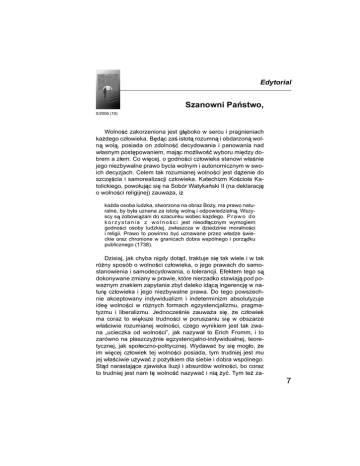 Edytorial Szanowni Pa stwo, 5/2006 (10) Wolno zakorzeniona jest g boko w sercu i pragnieniach ka dego cz owieka. B d c za istot rozumn i obdarzon woln wol , posiada on zdolno decydowania i panowania nad w asnym post powaniem, maj c mo liwo wyboru mi dzy dobrem a z em. Co wi cej, o godno ci cz owieka stanowi w a nie jego niezbywalne prawo bycia wolnym i autonomicznym w swoich decyzjach. Celem tak rozumianej wolno ci jest d enie do szcz cia i samorealizacji cz owieka. Katechizm Ko cio a Katolickiego, powo uj c si na Sobór Watyka ski II (na deklaracj o wolno ci religijnej) zauwa a, i ka da osoba ludzka, stworzona na obraz Bo y, ma prawo naturalne, by by a uznana za istot woln i odpowiedzialn . Wszyscy s zobowi zani do szacunku wobec ka dego. P r a w o d o k o r z y s t a n i a z w o l n o c i jest nieod cznym wymogiem godno ci osoby ludzkiej, zw aszcza w dziedzinie moralno ci i religii. Prawo to powinno by uznawane przez w adze wieckie oraz chronione w granicach dobra wspólnego i porz dku publicznego (1738). Dzisiaj, jak chyba nigdy dot d, traktuje si tak wiele i w tak ró ny sposób o wolno ci cz owieka, o jego prawach do samostanowienia i samodecydowania, o tolerancji. Efektem tego s dokonywane zmiany w prawie, które nierzadko stawiaj pod powa nym znakiem zapytania zbyt daleko id c ingerencj w natur cz owieka i jego niezbywalne prawa. Do tego powszechnie akceptowany indywidualizm i indeterminizm absolutyzuje ide wolno ci w ró nych formach egzystencjalizmu, pragmatyzmu i liberalizmu. Jednocze nie zauwa a si , e cz owiek ma coraz to wi ksze trudno ci w poruszaniu si w obszarze w a ciwie rozumianej wolno ci, czego wynikiem jest tak zwana ucieczka od wolno ci, jak nazywa to Erich Fromm, i to zarówno na p aszczy nie egzystencjalno-indywidualnej, teoretycznej, jak spo eczno-politycznej. Wydawa by si mog o, e im wi cej cz owiek tej wolno ci posiada, tym trudniej jest mu jej w a ciwie u ywa z po ytkiem dla siebie i dobra wspólnego. St d narastaj ce zjawiska iluzji i absurdów wolno ci, bo coraz to trudniej jest nam t wolno nazywa i ni y . Tym te za- 7 8 gadnieniem chcemy si zaj c w 10. ju numerze Horyzontów Wychowania. Dzia artyku ów otwiera referat Franciszka Ziejki Karol Bo oz Antoniewicz. Kap an misjonarz poeta, wyg oszony podczas inauguracji roku akademickiego w Wy szej Szkole Filozo czno-Pedagogicznej Ignatianum w Krakowie, w dniu 6 pa dziernika 2006. Przybli aj c posta jezuity Antoniewicza, Franciszek Ziejka wskazuje nie tylko na wybitno tej postaci, ale tak e na umiej tno korzystania z w asnej wolno ci. Gerald OCollins, w artykule Czym jest prawdziwa wolno wprowadza Czytelnika w zagadnienie wolno ci. Uwa a on, e prawdziwa wolno i jednocze nie prawdziwa ludzka indywidualno kszta tuje si poprzez bycie dla innych osób. Realizacja dobra w mi o ci polepsza relacje mi dzyludzkie i buduje p aszczyzn , na której mo na budowa wspólne dobro. Wolno i jej naczelny charakter najlepiej ujawnia si w moliwo ci wyboru dobra albo z a. Trudno w tym, e nasze zdolno ci percepcyjne cz sto s przes oni te szaro ci codzienno ci, permisywizmem, fa szyw hierarchi warto ci, czy po prostu przeci tno ci p yn c ze spo ecznego przyzwolenia na wszystko. Wspó czesno , a z ni postmodernizm uwa a, e nie ma obiektywnej prawdy ani dobra, w zwi zku z tym nie mo na te jasno okre li , co jest dobre, a co z e. Pawe Góralczyk próbuje si z tym upora wskazuj c najpierw na Bo e miosierdzie objawione w Jezusie Chrystusie, a pó niej na wolno cz owieka i jego sumienie. Zmierzaj c w kierunku pedagogiki bardziej chrze cija skiej Manuel Ruiz Jurado proponuje, by wspó czesna pedagogika zmierza a w kierunku bardziej chrystocentrycznym. Je eli bowiem przyjmujemy, e Jezus Chrystus w pe ni objawia cz owieka cz owiekowi, wówczas pedagogiczne systemy, oparte o w a ciw antropologi , winny t prawd uwzgl dnia . Plan wychowawczy, koncentruj cy si na Chrystusie, nie oznacza integryzmu religijnego, który chce si narzuci przemoc , ale stanowi ofert prawdy, by by a ona przyj ta przez cz owieka w sposób wolny i wiadomy. My l przewodni artyku u Janusza Gajdy jest stwierdzenie, e wolno , jako jedna z najwy ej cenionych warto ci wspó cze nie, mo e przyjmowa diametralnie ró ne zabarwienie aksjologiczne. Ten fakt sprawia, e cz owiek ostatecznie sam wytycza granice swojej wolno ci w oparciu o przyj t wcze niej hierar- Edytorial chi warto ci, co te ci le wi e si z jego godno ci . W kontek cie wspó czesnego liberalizmu i fundamentalizmu autor pozostawia otwarte pytanie o granice wolno ci w wymiarze spoeczno-kulturowym, wskazuj c jednocze nie na konieczno edukacji do wolno ci. W obszarze wychowania, tego bardziej praktycznego, porusza si Marek Ko cielniak. Stwierdza on, na podstawie przeprowadzonych bada , e uczniowie nie odczuwaj zbyt wiele wolno ci w szkole, a sprawa dotyczy zarówno nauczania, jak uczenia si . I jest to problem teoretyczny i praktyczny zarazem. Tutaj autor posi kuje si dokonaniami dwóch wielkich humanistów pedagogów Carla R. Rogersa i Martina Bubera. C.R. Rogers wiele mówi na temat wolno ci ucznia, niewiele natomiast na temat wolno ci nauczyciela. Inaczej si przedstawia to zagadnienie u M. Bubera. Twierdzi on, e wolno nauczyciela i ucznia mog wyst powa w doskona ej harmonii wtedy, kiedy oba podmioty podchodz do niej w duchu odpowiedzialnoci w wymiarze etycznym i aksjologicznym. To wszystko jednak musi by ukierunkowane na Boga i wobec Niego trzeba by odpowiedzialnym. Poczucie bycia wolnym lub te zniewolonym szczególnie ujawnia si , gdy chodzi o zachowania dewiacyjne i kontrol nad nimi. Mariusz Sztuka analizuje ten fenomen na przyk adzie Anonimowych Alkoholików i nie tylko. Zauwa a, i kontrolowanie swoich zachowa poprzez samokontrol , silny charakter, si woli, wspomagaj ce dzia ania o charakterze samowychowania, w tym tak e dzia ania autokorekcyjne, mog stanowi wydatn pomoc w z o onych sytuacjach wychowawczych i korekcyjnych, ale jednocze nie rodzi mo e tak zwany paradoks kontroli polegaj cy na tym, e prze wiadczenie o 