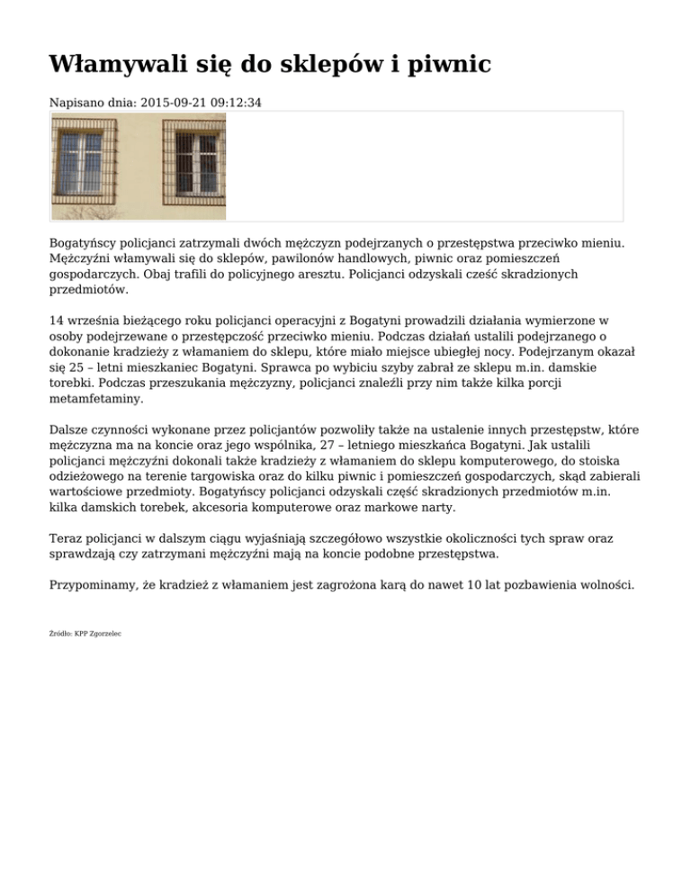 Włamywali się do sklepów i piwnic Napisano dnia: 2015-09-21 09:12:34 Bogatyńscy policjanci zatrzymali dwóch mężczyzn podejrzanych o przestępstwa przeciwko mieniu. Mężczyźni włamywali się do sklepów, pawilonów handlowych, piwnic oraz pomieszczeń gospodarczych. Obaj trafili do policyjnego aresztu. Policjanci odzyskali cześć skradzionych przedmiotów. 14 września bieżącego roku policjanci operacyjni z Bogatyni prowadzili działania wymierzone w osoby podejrzewane o przestępczość przeciwko mieniu. Podczas działań ustalili podejrzanego o dokonanie kradzieży z włamaniem do sklepu, które miało miejsce ubiegłej nocy. Podejrzanym okazał się 25 – letni mieszkaniec Bogatyni. Sprawca po wybiciu szyby zabrał ze sklepu m.in. damskie torebki. Podczas przeszukania mężczyzny, policjanci znaleźli przy nim także kilka porcji metamfetaminy. Dalsze czynności wykonane przez policjantów pozwoliły także na ustalenie innych przestępstw, które mężczyzna ma na koncie oraz jego wspólnika, 27 – letniego mieszkańca Bogatyni. Jak ustalili policjanci mężczyźni dokonali także kradzieży z włamaniem do sklepu komputerowego, do stoiska odzieżowego na terenie targowiska oraz do kilku piwnic i pomieszczeń gospodarczych, skąd zabierali wartościowe przedmioty. Bogatyńscy policjanci odzyskali część skradzionych przedmiotów m.in. kilka damskich torebek, akcesoria komputerowe oraz markowe narty. Teraz policjanci w dalszym ciągu wyjaśniają szczegółowo wszystkie okoliczności tych spraw oraz sprawdzają czy zatrzymani mężczyźni mają na koncie podobne przestępstwa. Przypominamy, że kradzież z włamaniem jest zagrożona karą do nawet 10 lat pozbawienia wolności. Źródło: KPP Zgorzelec