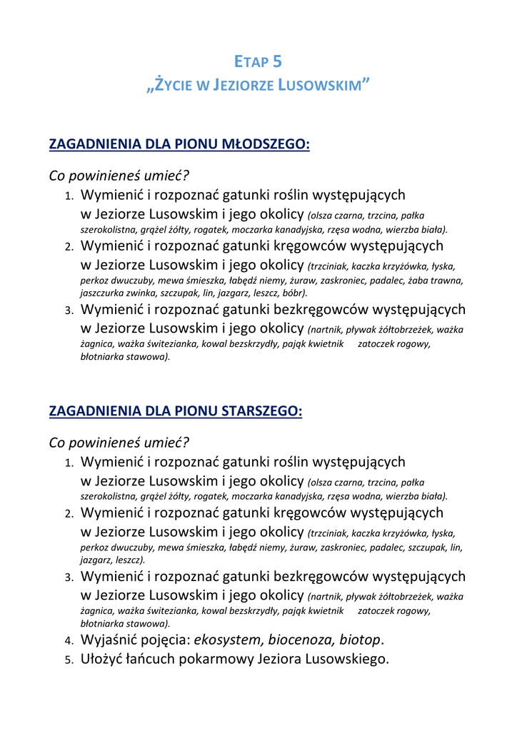 ETAP 5 „ŻYCIE W JEZIORZE LUSOWSKIM” ZAGADNIENIA DLA PIONU MŁODSZEGO: Co powinieneś umieć? 1. Wymienić i rozpoznać gatunki roślin występujących w Jeziorze Lusowskim i jego okolicy (olsza czarna, trzcina, pałka szerokolistna, grążel żółty, rogatek, moczarka kanadyjska, rzęsa wodna, wierzba biała). 2. Wymienić i rozpoznać gatunki kręgowców występujących w Jeziorze Lusowskim i jego okolicy (trzciniak, kaczka krzyżówka, łyska, perkoz dwuczuby, mewa śmieszka, łabędź niemy, żuraw, zaskroniec, padalec, żaba trawna, jaszczurka zwinka, szczupak, lin, jazgarz, leszcz, bóbr). 3. Wymienić i rozpoznać gatunki bezkręgowców występujących w Jeziorze Lusowskim i jego okolicy (nartnik, pływak żółtobrzeżek, ważka żagnica, ważka świtezianka, kowal bezskrzydły, pająk kwietnik błotniarka stawowa). zatoczek rogowy, ZAGADNIENIA DLA PIONU STARSZEGO: Co powinieneś umieć? 1. Wymienić i rozpoznać gatunki roślin występujących w Jeziorze Lusowskim i jego okolicy (olsza czarna, trzcina, pałka szerokolistna, grążel żółty, rogatek, moczarka kanadyjska, rzęsa wodna, wierzba biała). 2. Wymienić i rozpoznać gatunki kręgowców występujących w Jeziorze Lusowskim i jego okolicy (trzciniak, kaczka krzyżówka, łyska, perkoz dwuczuby, mewa śmieszka, łabędź niemy, żuraw, zaskroniec, padalec, szczupak, lin, jazgarz, leszcz). 3. Wymienić i rozpoznać gatunki bezkręgowców występujących w Jeziorze Lusowskim i jego okolicy (nartnik, pływak żółtobrzeżek, ważka żagnica, ważka świtezianka, kowal bezskrzydły, pająk kwietnik błotniarka stawowa). 4. 5. zatoczek rogowy, Wyjaśnić pojęcia: ekosystem, biocenoza, biotop. Ułożyć łańcuch pokarmowy Jeziora Lusowskiego.