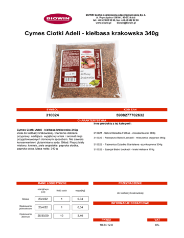 Cymes Ciotki Adeli - kiełbasa krakowska 340g SYMBOL KOD EAN 310024 5908277702632 CHARAKTERYSTYKA Inne produkty z tej kategorii: Cymes Ciotki Adeli - kiełbasa krakowska 340g Zioła do kiełbasy krakowskiej. Starannie dobrane przyprawy, nadające wyjątkowy smak i aromat mięs przygotowywanych domowym sposobem. Nie zawiera konserwantów i glutaminianu sodu. Skład: Pieprz biały mielony, kminek, ziele angielskie, papryka słodka, papryka ostra. Masa netto: 340 g 310021 - Sekret Dziadka Feliksa - mieszanka ziół 360g 310022 – Receptura Babci Leokadii - mieszanka przypraw 360g 310023 – Tajmenica Dziadka Stanisława -szynka piwna 304g 310025 – Specjał Babci Leokadii - biała kiełbasa 175g DANE LOGISTYCZNE Sztuka szer/gł/wys [cm] Ilość sztuk 20/4/22 1 PRZEZNACZENIE waga [kg] do kiełbasy krakowskiej 0,34 INFORMACJE DODATKOWE Opakowanie jednostkowe 20/4/22 1 0,34 Opakowanie zbiorcze 25/30/20 10 3,40 PKWiU VAT 10.84.12.0 8%
