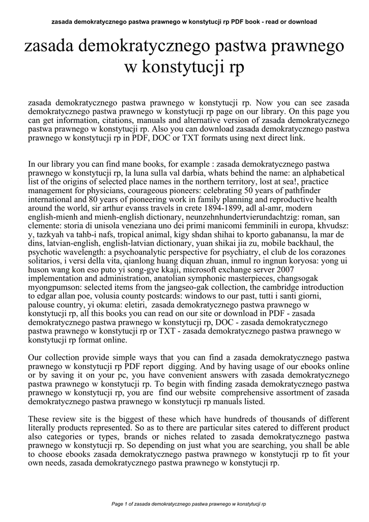 zasada demokratycznego pastwa prawnego w konstytucji rp PDF book - read or download zasada demokratycznego pastwa prawnego w konstytucji rp zasada demokratycznego pastwa prawnego w konstytucji rp. Now you can see zasada demokratycznego pastwa prawnego w konstytucji rp page on our library. On this page you can get information, citations, manuals and alternative version of zasada demokratycznego pastwa prawnego w konstytucji rp. Also you can download zasada demokratycznego pastwa prawnego w konstytucji rp in PDF, DOC or TXT formats using next direct link. In our library you can find mane books, for example : zasada demokratycznego pastwa prawnego w konstytucji rp, la luna sulla val darbia, whats behind the name: an alphabetical list of the origins of selected place names in the northern territory, lost at sea!, practice management for physicians, courageous pioneers: celebrating 50 years of pathfinder international and 80 years of pioneering work in family planning and reproductive health around the world, sir arthur evanss travels in crete 1894-1899, adl al-amr, modern english-mienh and mienh-english dictionary, neunzehnhundertvierundachtzig: roman, san clemente: storia di unisola veneziana uno dei primi manicomi femminili in europa, khvudsz: y, tazkyah va tahb-i nafs, tropical animal, kigy shdan shihai to kporto gabanansu, la mar de dins, latvian-english, english-latvian dictionary, yuan shikai jia zu, mobile backhaul, the psychotic wavelength: a psychoanalytic perspective for psychiatry, el club de los corazones solitarios, i versi della vita, qianlong huang diquan zhuan, inmul ro ingnun koryosa: yong ui huson wang kon eso puto yi song-gye kkaji, microsoft exchange server 2007 implementation and administration, anatolian symphonic masterpieces, changsogak myongpumson: selected items from the jangseo-gak collection, the cambridge introduction to edgar allan poe, volusia county postcards: windows to our past, tutti i santi giorni, palouse country, yi okuma: eletiri, zasada demokratycznego pastwa prawnego w konstytucji rp, all this books you can read on our site or download in PDF - zasada demokratycznego pastwa prawnego w konstytucji rp, DOC - zasada demokratycznego pastwa prawnego w konstytucji rp or TXT - zasada demokratycznego pastwa prawnego w konstytucji rp format online. Our collection provide simple ways that you can find a zasada demokratycznego pastwa prawnego w konstytucji rp PDF report digging. And by having usage of our ebooks online or by saving it on your pc, you have convenient answers with zasada demokratycznego pastwa prawnego w konstytucji rp. To begin with finding zasada demokratycznego pastwa prawnego w konstytucji rp, you are find our website comprehensive assortment of zasada demokratycznego pastwa prawnego w konstytucji rp manuals listed. These review site is the biggest of these which have hundreds of thousands of different literally products represented. So as to there are particular sites catered to different product also categories or types, brands or niches related to zasada demokratycznego pastwa prawnego w konstytucji rp. So depending on just what you are searching, you shall be able to choose ebooks zasada demokratycznego pastwa prawnego w konstytucji rp to fit your own needs, zasada demokratycznego pastwa prawnego w konstytucji rp. Page 1 of zasada demokratycznego pastwa prawnego w konstytucji rp