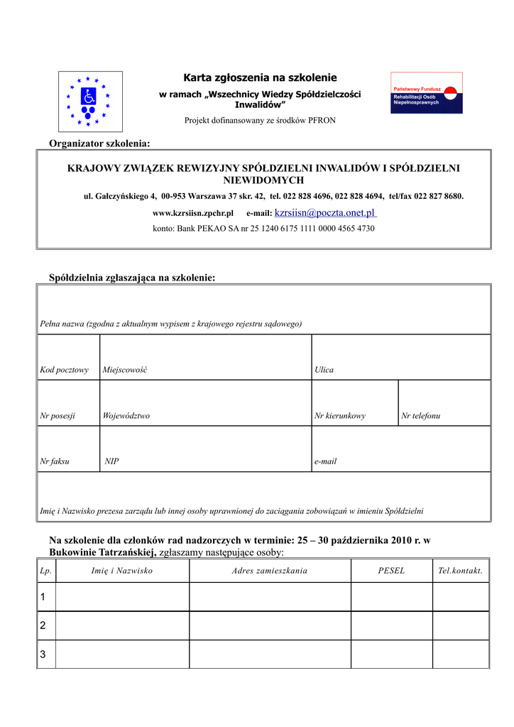 Karta zgłoszenia na szkolenie w ramach „Wszechnicy Wiedzy Spółdzielczości Inwalidów” Projekt dofinansowany ze środków PFRON Organizator szkolenia: KRAJOWY ZWIĄZEK REWIZYJNY SPÓŁDZIELNI INWALIDÓW I SPÓŁDZIELNI NIEWIDOMYCH ul. Gałczyńskiego 4, 00-953 Warszawa 37 skr. 42, tel. 022 828 4696, 022 828 4694, tel/fax 022 827 8680. www.kzrsiisn.zpchr.pl e-mail: [email protected] konto: Bank PEKAO SA nr 25 1240 6175 1111 0000 4565 4730 Spółdzielnia zgłaszająca na szkolenie: Pełna nazwa (zgodna z aktualnym wypisem z krajowego rejestru sądowego) Kod pocztowy Miejscowość Ulica Nr posesji Województwo Nr kierunkowy Nr faksu NIP e-mail Nr telefonu Imię i Nazwisko prezesa zarządu lub innej osoby uprawnionej do zaciągania zobowiązań w imieniu Spółdzielni Na szkolenie dla członków rad nadzorczych w terminie: 25 – 30 października 2010 r. w Bukowinie Tatrzańskiej, zgłaszamy następujące osoby: Lp. 1 2 3 Imię i Nazwisko Adres zamieszkania PESEL Tel.kontakt. Na szkolenie dla kadry odpowiedzialnej za sprawy kadrowe, rehabilitację osób niepełnosprawnych, działaczy związków zawodowych i innej kluczowej dla spółdzielni kadry: w terminie listopad / grudzień 2010 r w Warszawie, zgłaszamy następujące osoby: Lp. Imię i Nazwisko Adres zamieszkania PESEL Tel.kontakt. 1 2 3 Upoważnienie do wystawienia faktury imiennej)* Upoważniamy Krajowy Związek Rewizyjny Spółdzielni Inwalidów i Spółdzielni Niewidomych do wystawienia faktury imiennej VAT dla następujących pracowników naszej spółdzielni, wymienionych wyżej w zgłoszeniu: )* wypełnić tę część zgłoszenia, jeżeli faktura ma być wystawiona imiennie na pracownika, a nie na spółdzielnię. Lp. Imię i Nazwisko Uwagi Informacje dodatkowe Organizatora Wymaganą dopłatę do kosztów szkolenia w wysokości 600 zł od osoby należy wpłacić na konto organizatora najpóźniej na trzy dni przed rozpoczęciem zajęć. Po uiszczeniu należności organizator szkolenia wystawi fakturę VAT za wykonaną usługę szkoleniową. Organizator zastrzega sobie prawo do obciążenia zgłaszającego częścią kosztów szkolenia w przypadku rezygnacji w czasie niepozwalającym na uniknięcie kosztów lub w przypadku nie zgłoszenia się uczestnika na szkolenie. Dane osobowe, przekazane w tym zgłoszeniu, wykorzystane będą wyłącznie na potrzeby oraz w zakresie niezbędnym do prawidłowej organizacji tego szkolenia. Każdej osobie zgłoszonej na szkolenie organizator przekaże, z odpowiednim wyprzedzeniem, szczegółowe informacje o terminie szkolenia i miejscu zakwaterowania oraz harmonogram zajęć, plan dojazdu do hotelu itp. Nazwiska skierowanych na szkolenie osób, które poruszają się na wózku inwalidzkim prosimy podkreślić. Ewentualni opiekunowie osób niepełnosprawnych (przewodnicy niewidomych, tłumacze języka migowego) mogą uczestniczyć w szkoleniu na tych samych warunkach jak wszyscy uczestnicy. W sytuacji, gdy na określony termin szkolenia zgłosi się więcej osób niż możliwości ich zakwaterowania, o zakwalifikowaniu na dany termin decydować będzie kolejność nadesłanych zgłoszeń. .............................. Miejscowość i data ................................ pieczęć firmowa ............................................... podpis osoby upoważnionej