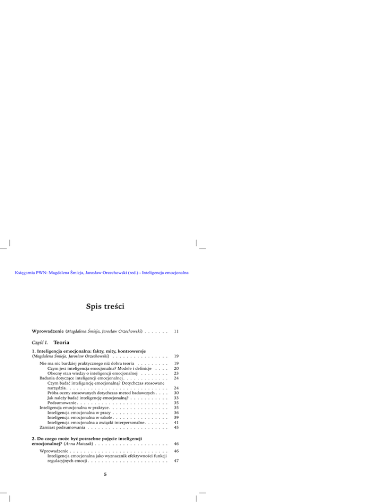 Księgarnia PWN: Magdalena Śmieja, Jarosław Orzechowski (red.) - Inteligencja emocjonalna Spis treści Wprowadzenie (Magdalena Śmieja, Jarosław Orzechowski) . . . . . . . Część I. 11 Teoria 1. Inteligencja emocjonalna: fakty, mity, kontrowersje (Magdalena Śmieja, Jarosław Orzechowski) . . . . . . . . . . . . . . . . Nie ma nic bardziej praktycznego niż dobra teoria . . . . . . . . Czym jest inteligencja emocjonalna? Modele i definicje . . . Obecny stan wiedzy o inteligencji emocjonalnej . . . . . . . Badania dotyczące inteligencji emocjonalnej . . . . . . . . . . . . Czym badać inteligencję emocjonalną? Dotychczas stosowane narzędzia . . . . . . . . . . . . . . . . . . . . . . . . . . . . Próba oceny stosowanych dotychczas metod badawczych . . . Jak należy badać inteligencję emocjonalną? . . . . . . . . . . Podsumowanie . . . . . . . . . . . . . . . . . . . . . . . . . Inteligencja emocjonalna w praktyce . . . . . . . . . . . . . . . . Inteligencja emocjonalna w pracy . . . . . . . . . . . . . . . Inteligencja emocjonalna w szkole . . . . . . . . . . . . . . . Inteligencja emocjonalna a związki interpersonalne . . . . . . Zamiast podsumowania . . . . . . . . . . . . . . . . . . . . . . 19 . . . . 19 20 23 24 . . . . . . . . . 24 30 33 35 35 36 39 41 45 2. Do czego może być potrzebne pojęcie inteligencji emocjonalnej? (Anna Matczak) . . . . . . . . . . . . . . . . . . . . . 46 Wprowadzenie . . . . . . . . . . . . . . . . . . . . . . . . . . . . Inteligencja emocjonalna jako wyznacznik efektywności funkcji regulacyjnych emocji . . . . . . . . . . . . . . . . . . . . . . . 5 46 47 Inteligencja emocjonalna jako warunek wykorzystywania posiadanych możliwości poznawczych. . . . . . . . . . . . . . Inteligencja emocjonalna jako zdolność do przetwarzania informacji emocjonalnych . . . . . . . . . . . . . . . . . . . . 50 54 3. Inteligencja emocjonalna – między sprawnością a mądrością (Tomasz Maruszewski) . . . . . . . . . . . . . . . . . . . . . . . . . . 62 Wprowadzenie . . . . . . . . . . . . . . . . . . . . . . . . . . Inteligencja emocjonalna jako zdolność lub jako grupa zdolności Inteligencja emocjonalna a mądrość . . . . . . . . . . . . . . . Konkluzje . . . . . . . . . . . . . . . . . . . . . . . . . . . . . . . . . 62 66 72 81 4. Rozwój inteligencji emocjonalnej. Czego dowiedzieliśmy się do tej pory? (Moshe Zeidner) . . . . . . . . . . . . . . . . . . . . . . 82 Zarys problemu. . . . . . . . . . . . . . . . . . . . . . . . . Zarys wielowarstwowego, rozwojowego modelu inteligencji emocjonalnej . . . . . . . . . . . . . . . . . . . . . . . . . . Temperament: biologiczne podstawy inteligencji emocjonalnej Uczenie się reguł: socjalizacja rodzicielska . . . . . . . . . . . Więź dziecko–dorosły . . . . . . . . . . . . . . . . . . . Atmosfera emocjonalna w rodzinie a ekspresyjność rodzicielska. . . . . . . . . . . . . . . . . . . . . . . . . Socjalizacja i sposoby wychowywania dzieci . . . . . . . . Socjalizacja emocji technikami behawioralnymi . . . . . . Strategiczne zachowania samoregulacyjne. . . . . . . . . Uwagi końcowe. . . . . . . . . . . . . . . . . . . . . . . . . Część II. . . . . . . . 82 . . . . . . . . . . . . 84 86 90 91 . . . . . . . . . . . 91 . 94 . 96 . 101 . 107 Badania 5. Pomiar inteligencji emocjonalnej skalą Mayer-Salovey-Caruso Emotional Intelligence Test (Marc A. Brackett, Peter Salovey) . . . . 113 Wprowadzenie . . . . . . . . . . . . . . . . . . . . . . Czteroskładnikowy model inteligencji emocjonalnej. . . Spostrzeganie emocji. . . . . . . . . . . . . . . . . Wykorzystywanie emocji do wspomagania myślenia Rozumienie emocji. . . . . . . . . . . . . . . . . . Zarządzanie emocjami . . . . . . . . . . . . . . . . Pomiar inteligencji emocjonalnej skalą MSCEIT . . . . . Podskale MSCEIT . . . . . . . . . . . . . . . . . . 6 . . . . . . . . . . . . . . . . . . . . . . . . . . . . . . . . . . . . . . . . . . . . . . . . 113 114 115 115 116 116 117 117 Punktacja MSCEIT . . . . . . . . . . . . . . . . . . . . . Właściwości psychometryczne skali MSCEIT . . . . . . . Rzetelność . . . . . . . . . . . . . . . . . . . . . . . Struktura czynnikowa . . . . . . . . . . . . . . . . . Walidacja MSCEIT . . . . . . . . . . . . . . . . . . . . . Trafność dyskryminacyjna i zbieżna . . . . . . . . . . . . Związki z inteligencją ogólną . . . . . . . . . . . . . Związki z osobowością . . . . . . . . . . . . . . . . Trafność prognostyczna i dodana . . . . . . . . . . . . . Związki z innymi zdolnościami odnoszącymi się do emocji . . . . . . . . . . . . . . . . . . . . . . . Związek z osiągnięciami szkolnymi . . . . . . . . . . Związki z funkcjonowaniem społecznym . . . . . . . Związki z kompetencjami zawodowymi . . . . . . . . Związki z dobrostanem, zachowaniami ryzykownymi oraz psychopatologią . . . . . . . . . . . . . . . . . Kierunki przyszłych badań . . . . . . . . . . . . . . . . . . . Konkluzje . . . . . . . . . . . . . . . . . . . . . . . . . . . . . . . . . . . . . . . . . . . . . . . . . . . . . . . 118 119 120 120 122 122 122 123 124 . . . . . . . . . . . . 124 126 126 130 . . . 131 . . . 132 . . . 135 6. Inteligencja emocjonalna – więcej niż IQ i osobowość? O potrzebie i znaczeniu sprawdzania trafności dodanej narzędzi mierzących inteligencję emocjonalną (Dorota Szczygieł) . . . . . . 136 Podwójny status inteligencji emocjonalnej w psychologii naukowej – zdolność czy cecha osobowości? . . . . . . . . . . . . . . . . . . . Inteligencja emocjonalna – więcej niż inteligencja i osobowość? . . Trafność dodana . . . . . . . . . . . . . . . . . . . . . . . . . Statystyczne procedury testowania trafności dodanej . . . . . . Analiza regresji wielokrotnej: krokowa czy hierarchiczna? . . . Statystyczne wskaźniki trafności dodanej . . . . . . . . . . . . Kryteria oceny trafności dodanej narzędzi mierzących inteligencję emocjonalną. . . . . . . . . . . . . . . . . . . . .