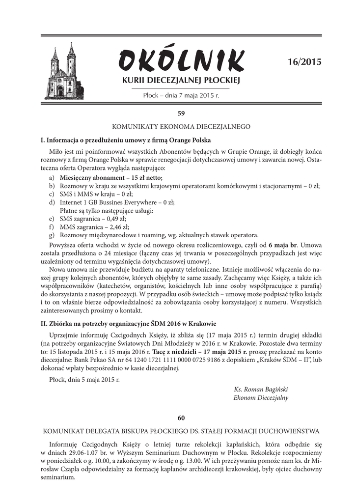 OKÓLNIK 16/2015 KURII DIECEZJALNEJ PŁOCKIEJ Płock – dnia 7 maja 2015 r. 59 KOMUNIKATY EKONOMA DIECEZJALNEGO I. Informacja o przedłużeniu umowy z firmą Orange Polska Miło jest mi poinformować wszystkich Abonentów będących w Grupie Orange, iż dobiegły końca rozmowy z firmą Orange Polska w sprawie renegocjacji dotychczasowej umowy i zawarcia nowej. Ostateczna oferta Operatora wygląda następująco: a) Miesięczny abonament – 15 zł netto; b) Rozmowy w kraju ze wszystkimi krajowymi operatorami komórkowymi i stacjonarnymi – 0 zł; c) SMS i MMS w kraju – 0 zł; d) Internet 1 GB Bussines Everywhere – 0 zł; Płatne są tylko następujące usługi: e) SMS zagranica – 0,49 zł; f) MMS zagranica – 2,46 zł; g) Rozmowy międzynarodowe i roaming, wg. aktualnych stawek operatora. Powyższa oferta wchodzi w życie od nowego okresu rozliczeniowego, czyli od 6 maja br. Umowa została przedłużona o 24 miesiące (łączny czas jej trwania w poszczególnych przypadkach jest więc uzależniony od terminu wygaśnięcia dotychczasowej umowy). Nowa umowa nie przewiduje budżetu na aparaty telefoniczne. Istnieje możliwość włączenia do naszej grupy kolejnych abonentów, których objęłyby te same zasady. Zachęcamy więc Księży, a także ich współpracowników (katechetów, organistów, kościelnych lub inne osoby współpracujące z parafią) do skorzystania z naszej propozycji. W przypadku osób świeckich – umowę może podpisać tylko ksiądz i to on właśnie bierze odpowiedzialność za zobowiązania osoby korzystającej z numeru. Wszystkich zainteresowanych prosimy o kontakt. II. Zbiórka na potrzeby organizacyjne ŚDM 2016 w Krakowie Uprzejmie informuję Czcigodnych Księży, iż zbliża się (17 maja 2015 r.) termin drugiej składki (na potrzeby organizacyjne Światowych Dni Młodzieży w 2016 r. w Krakowie. Pozostałe dwa terminy to: 15 listopada 2015 r. i 15 maja 2016 r. Tacę z niedzieli – 17 maja 2015 r. proszę przekazać na konto diecezjalne: Bank Pekao SA nr 64 1240 1721 1111 0000 0725 9186 z dopiskiem „Kraków ŚDM – II”, lub dokonać wpłaty bezpośrednio w kasie diecezjalnej. Płock, dnia 5 maja 2015 r. Ks. Roman Bagiński Ekonom Diecezjalny 60 KOMUNIKAT DELEGATA BISKUPA PŁOCKIEGO DS. STAŁEJ FORMACJI DUCHOWIEŃSTWA Informuję Czcigodnych Księży o letniej turze rekolekcji kapłańskich, która odbędzie się w dniach 29.06-1.07 br. w Wyższym Seminarium Duchownym w Płocku. Rekolekcje rozpoczniemy w poniedziałek o g. 10.00, a zakończymy w środę o g. 13.00. W ich przeżywaniu pomoże nam ks. dr Mirosław Czapla odpowiedzialny za formację kapłanów archidiecezji krakowskiej, były ojciec duchowny seminarium. – 82 – Uczestnictwo w rekolekcjach proszę zgłaszać do p. Heleny Błaszkiewicz z działu gospodarczego Wyższego Seminarium pod numer telefonu: 024/ 262 60 53 (centrex 166); tel. kom.: 501 222 715. Proszę zabrać ze sobą albę i stułę. Serdecznie zapraszam do udziału w ćwiczeniach duchowych. Płock, dnia 6 maja 2015 r. Ks. Sławomir Zalewski Delegat Biskupa Płockiego ds. stałej formacji duchowieństwa 61 KOMUNIKAT MODERATORA DIECEZJALNEGO RUCHU ŚWIATŁO-ŻYCIE Zgłoszenia na OAZĘ 2015 Pragnę poinformować, że ruszyły zapisy na letnie rekolekcje oazowe 2015. Zgłoszenia będę przyjmowane do 3 czerwca 2015 roku lub do wyczerpania miejsc w poszczególnych ośrodkach. Liczy się kolejność zgłoszeń. Recepcja Oaz zastrzega sobie prawo do ewentualnego przydzielania ośrodków, jeśli pojawi się problem logistyczny. Karty uczestnictwa w rekolekcjach dostępne na: www.plockaoaza.pl Wypełnioną kartę należy wydrukować, koniecznie dwustronnie na jednej kartce formatu A4. We wskazanych miejscach kartę dokładnie wypełniają: rodzice lub prawni opiekunowie uczestnika oazy, ksiądz (Moderator lub Proboszcz) i lekarz. Karty nieprawidłowo wypełnione będą odsyłane. Wypełnioną kartę należy dostarczyć najpóźniej do 3 czerwca 2015 roku, osobiście do Parafii św. Bartłomieja w Płocku, ul. Kazimierza Wielkiego 1 lub do Wydziału Duszpasterskiego w Płocku. Koszt oazy wynosi 750 zł (zakwaterowanie, pełne wyżywienie, ubezpieczenie, transport w obie strony). Zaliczkę w wysokości 200 zł należy wpłacić wraz ze składaną kartą. Po tym terminie zgłoszenia bez uiszczonej zaliczki będą traktowane jako nieaktualne. Pozostałą kwotę należy wpłacić bezpośrednio po przybyciu na rekolekcje do Moderatora prowadzącego oazę. Zaliczka nie będzie zwracana w przypadku rezygnacji z udziału w oazie. Centrum Ruchu Światło-Życie nie ma możliwości wystawiania rachunków i faktur. Może jedynie wydać zaświadczenie o udziale w oazie. Osoby zainteresowane proszone są o kontakt w tej sprawie z Moderatorem diecezjalnym, jeszcze przed rozpoczęciem oazy. Na ONŻ I stopnia jadą osoby po III klasie gimnazjum aż do 19 roku życia. Osoby, które były w tamtym roku na ONŻ I stopnia w Gliczarowie Górnym, a w tym roku są po II lub III klasie gimnazjum, jeszcze raz jadą na pierwszy stopień. W Oazie nie chodzi o zaliczanie stopni, ale pewną ludzką i duchową dojrzałość, by w przyszłość móc wziąć odpowiedzialność za ludzi, dla których Wy będziecie Animatorami. Pytania dotyczące oaz wakacyjnych, a także zgłoszenia animatorów, którzy podczas nich pełnią posługę, należy kierować do Centrum Ruchu Światło-Życie Diecezji Płockiej na adres: plockaoaza@gmail. com lub telefonicznie: 501 648 484. Płock, dnia 5 maja 2015 r. Ks. Krzysztof Ruciński Moderator diecezjalny Ruchu Światło-Życie 62 KOMUNIKAT REFERATU DS. ORGANISTOWSKICH I. Rekolekcje dla organistów Rekolekcje dla Organistów Diecezji Płockiej w br. odbędą się w dniach 16 – 17 czerwca (wtorek, środa) 2015 r. w Młodzieżowym Centrum Edukacyjno-Wychowawczym „Studnia” w Płocku, ul. Górna 1 A (początek rekolekcji: wtorek, godz. 9.00, zakończenie, środa, godz. 18.00). Do uczestnictwa w tegorocznych rekolekcjach zob