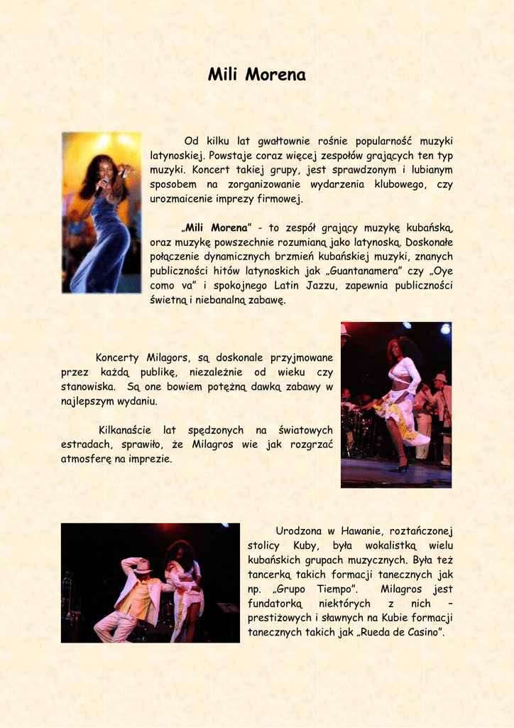 Mili Morena Od kilku lat gwałtownie rośnie popularność muzyki latynoskiej. Powstaje coraz więcej zespołów grających ten typ muzyki. Koncert takiej grupy, jest sprawdzonym i lubianym sposobem na zorganizowanie wydarzenia klubowego, czy urozmaicenie imprezy firmowej. „Mili Morena” - to zespół grający muzykę kubańską, oraz muzykę powszechnie rozumianą jako latynoską. Doskonałe połączenie dynamicznych brzmień kubańskiej muzyki, znanych publiczności hitów latynoskich jak „Guantanamera” czy „Oye como va” i spokojnego Latin Jazzu, zapewnia publiczności świetną i niebanalną zabawę. Koncerty Milagors, są doskonale przyjmowane przez kaŜdą publikę, niezaleŜnie od wieku czy stanowiska. Są one bowiem potęŜną dawką zabawy w najlepszym wydaniu. Kilkanaście lat spędzonych na światowych estradach, sprawiło, Ŝe Milagros wie jak rozgrzać atmosferę na imprezie. Urodzona w Hawanie, roztańczonej stolicy Kuby, była wokalistką wielu kubańskich grupach muzycznych. Była teŜ tancerką takich formacji tanecznych jak np. „Grupo Tiempo”. Milagros jest fundatorką niektórych z nich – prestiŜowych i sławnych na Kubie formacji tanecznych takich jak „Rueda de Casino”. Naturalny dla kubańczyków talent do muzyki i tańca, doskonaliła na poziomie akademickim. Ukończyła szkołę baletową Prodanza i muzyczną (Paolita Concepcion). W ekskluzywnej formacji „Conjunto Folclorico”, Milagros poznała tajniki afrokubańskich tańców i osiągnęła w nich najwyŜszy poziom. W karierze zawodowej - jako piosenkarka i tancerka - ma na koncie współpracę ze znanymi na całym świecie autorytetami kubańskiej muzyki, takimi jak: Los Van Van, Grupo Moncada, Paulo FG, Dan Den czy Pachito Alonzo. Ta współpraca świadczy o profesjonalizmie i niezwykłym talencie Milagros. Jako piosenkarka, występowała w wielu prestiŜowych teatrach i klubach w Hawanie. Brała udział w międzynarodowych trasach koncertowych m.in. Włochy, Jamajka, Hiszpania, Meksyk, Kanada... Była jedną z solistek kobiecej orkiestry salsowej „Salsa Morena”, oraz grupy „Havana Cafe”. Śpiewała równieŜ z Omarą Portuondo, znaną w Polsce z projektu Buena Vista Social Club. Na koncie ma równieŜ współpracę z grupami takimi jak NG La Banda czy nominowaną do nagród Grammy „Septeto Nacional de Ignacio Pińeiro”. Milagros Abreu Machado to gwiazda wielu Festiwali Salsy (min w Niemczech (Festival Salsy Latin Chem), Ukrainie, Polsce). Uczestniczyła w wielu występach dla telewizji (kubańskiej, międzynarodowej i oczywiście polskiej), jak równieŜ Polsce waŜniejszych imprezach na terenie polski (min. Przystanek Woodstock 2003 - Milagros zaproszona jako wokaliska na koncercie Maleo). Marek "Smok" Rajss mProject tel 512 721 256 [email protected] www.mproject.pl