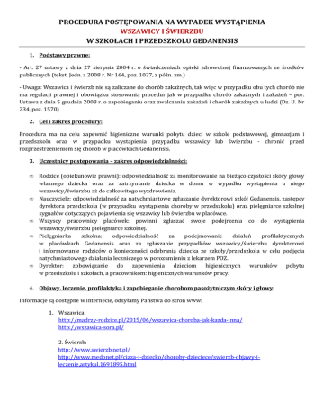PROCEDURA POSTĘPOWANIA NA WYPADEK WYSTĄPIENIA WSZAWICY I ŚWIERZBU W SZKOŁACH I PRZEDSZKOLU GEDANENSIS 1. Podstawy prawne: - Art. 27 ustawy z dnia 27 sierpnia 2004 r. o świadczeniach opieki zdrowotnej finansowanych ze środków publicznych (tekst. Jedn. z 2008 r. Nr 164, poz. 1027, z późn. zm.) - Uwaga: Wszawica i świerzb nie są zaliczane do chorób zakaźnych, tak więc w przypadku obu tych chorób nie ma regulacji prawnej i obowiązku stosowania procedur jak w przypadku chorób zakaźnych i zakażeń – por. Ustawa z dnia 5 grudnia 2008 r. o zapobieganiu oraz zwalczaniu zakażeń i chorób zakaźnych u ludzi (Dz. U. Nr 234, poz. 1570) 2. Cel i zakres procedury: Procedura ma na celu zapewnić higieniczne warunki pobytu dzieci w szkole podstawowej, gimnazjum i przedszkolu oraz w przypadku wystąpienia przypadku wszawicy lub świerzbu - chronić przed rozprzestrzenieniem się chorób w placówkach Gedanensis. 3. Uczestnicy postępowania – zakres odpowiedzialności: • • • • • Rodzice (opiekunowie prawni): odpowiedzialność za monitorowanie na bieżąco czystości skóry głowy własnego dziecka oraz za zatrzymanie dziecka w domu w wypadku wystąpienia u niego wszawicy/świerzbu aż do całkowitego wyzdrowienia. Nauczyciele: odpowiedzialność za natychmiastowe zgłaszanie dyrektorowi szkół Gedanensis, zastępcy dyrektora przedszkola (w przypadku wystąpienia choroby w przedszkolu) oraz pielęgniarce szkolnej sygnałów dotyczących pojawienia się wszawicy lub świerzbu w placówce. Wszyscy pracownicy placówek: powinni zgłaszać swoje podejrzenia co do wystąpienia wszawicy/świerzbu pielęgniarce szkolnej. Pielęgniarka szkolna: odpowiedzialność za podejmowanie działań profilaktycznych w placówkach Gedanensis oraz za zgłaszanie przypadków wszawicy/świerzbu dyrektorowi i informowanie rodziców o konieczności odebrania dziecka ze szkoły/przedszkola w celu podjęcia natychmiastowego działania leczniczego w porozumieniu z lekarzem POZ. Dyrektor: zobowiązanie do zapewnienia dzieciom higienicznych warunków pobytu w przedszkolu i szkołach, a pracownikom: higienicznych warunków pracy. 4. Objawy, leczenie, profilaktyka i zapobieganie chorobom pasożytniczym skóry i głowy: Informacje są dostępne w internecie, odsyłamy Państwa do stron www: 1. Wszawica: http://madrzy-rodzice.pl/2015/06/wszawica-choroba-jak-kazda-inna/ http://wszawica-sora.pl/ 2. Świerzb: http://www.swierzb.net.pl/ http://www.medonet.pl/ciaza-i-dziecko/choroby-dzieciece/swierzb-objawy-ileczenie,artykul,1691895.html 5. Opis procedury: Aby zapewnić higieniczne warunki pobytu dzieci w szkołach i przedszkolu oraz aby chronić przed rozprzestrzenieniem się wszawicy i świerzbu w placówce, zobowiązuje się: • • • rodziców/opiekunów prawnych do regularnego monitorowania czystości skóry i głowy dziecka, nauczycieli i innych pracowników do niezwłocznego zgłaszania dyrektorowi przedszkola i pielęgniarce szkolnej wszystkich informacji dotyczących pojawienia się objawów zakażenia wszawicą i świerzbem u podopiecznych, które zauważyli lub o których dowiedzieli się od rodziców/opiekunów prawnych; pielęgniarkę szkolną do systematycznych, profilaktycznych przeglądów skóry głowy u uczniów i reagowania na każdy świąd i zauważone/zgłoszone zmiany skórne u podopiecznych i pracowników szkół i przedszkola Gedanensis. W przypadku wystąpienia choroby pasożytniczej na terenie placówki podejmuje się następujące działania: 1) Dyrektor placówki zarządza dokonanie przez pielęgniarkę szkolną kontroli czystości skóry i głowy wszystkich dzieci w grupie, z zachowaniem zasady intymności (kontrola indywidualna w wydzielonym pomieszczeniu). 2) Pielęgniarka szkolna, wychowawca grupy lub dyrektor zawiadamia rodziców dzieci, u których stwierdzono wszawicę o konieczności podjęcia niezwłocznie zabiegów higienicznych skóry głowy. W przypadku podejrzenia świerzbu – osoba j.w. zgłasza podejrzenie rodzicowi, wskazując konieczność udania się do lekarza. Rodzic jest zobowiązany do niezwłocznego odebrania dziecka ze szkoły lub przedszkola i podjęcia leczenia. W przypadku odmowy podjęcia leczenia, rodzic zobowiązany jest dostarczyć do szkoły zaświadczenie od lekarza, wykluczające chorobę pasożytniczą u dziecka. W przypadku występujących objawów niepokojących pielęgniarkę, wychowawcę i/lub dyrektora, dyrektor podejmuje ostateczną, kluczową decyzję o uczęszczaniu dziecka do szkoły/przedszkola, aż do ustąpienia wszystkich niepokojących objawów. 3) Na potrzebę rodziców/opiekunów dziecka, pielęgniarka zapoznaje zainteresowanych o sposobie działań, informuje też o konieczności poddania się kuracji wszystkich domowników i monitoruje skuteczność działań, jednocześnie informuje dyrektora o wynikach kontroli i skali zjawiska. 4) Dyrektor lub osoba przez niego upoważniona niezwłocznie powiadamia innych rodziców o wystąpieniu przypadku choroby pasożytniczej, z zaleceniem codziennej kontroli czystości głowy i/lub skóry dzieci oraz wszystkich domowników, w celu prowadzenia jednolitej współpracy w działaniach na linii pracownicy placówki – rodzice (prawni opiekunowie). • • • • • • W trakcie leczenia dziecko powinno pozostać w domu, żeby zapobiec przenoszeniu się pasożyta na inne dzieci. Dziecko wraca do szkoły/przedszkola po zakończeniu leczenia. W przypadku świerzbu oraz w niektórych przypadkach wszawicy – zanim dziecko powróci do szkoły/przedszkola, wymaga się od rodzica dostarczenia zaświadczenia lekarskiego, które potwierdzi ukończenie leczenia. W przypadku, gdy rodzice zgłoszą trudności w przeprowadzeniu kuracji (np. brak środków finansowych na zakup preparatu), dyrektor przedszkola we współpracy z ośrodkiem pomocy społecznej, udzielają rodzicom lub opiekunom niezbędnej pomocy. W przypadku wszawicy: pielęgniarka szkolna lub inna osoba upoważniona przez dyrektora, po